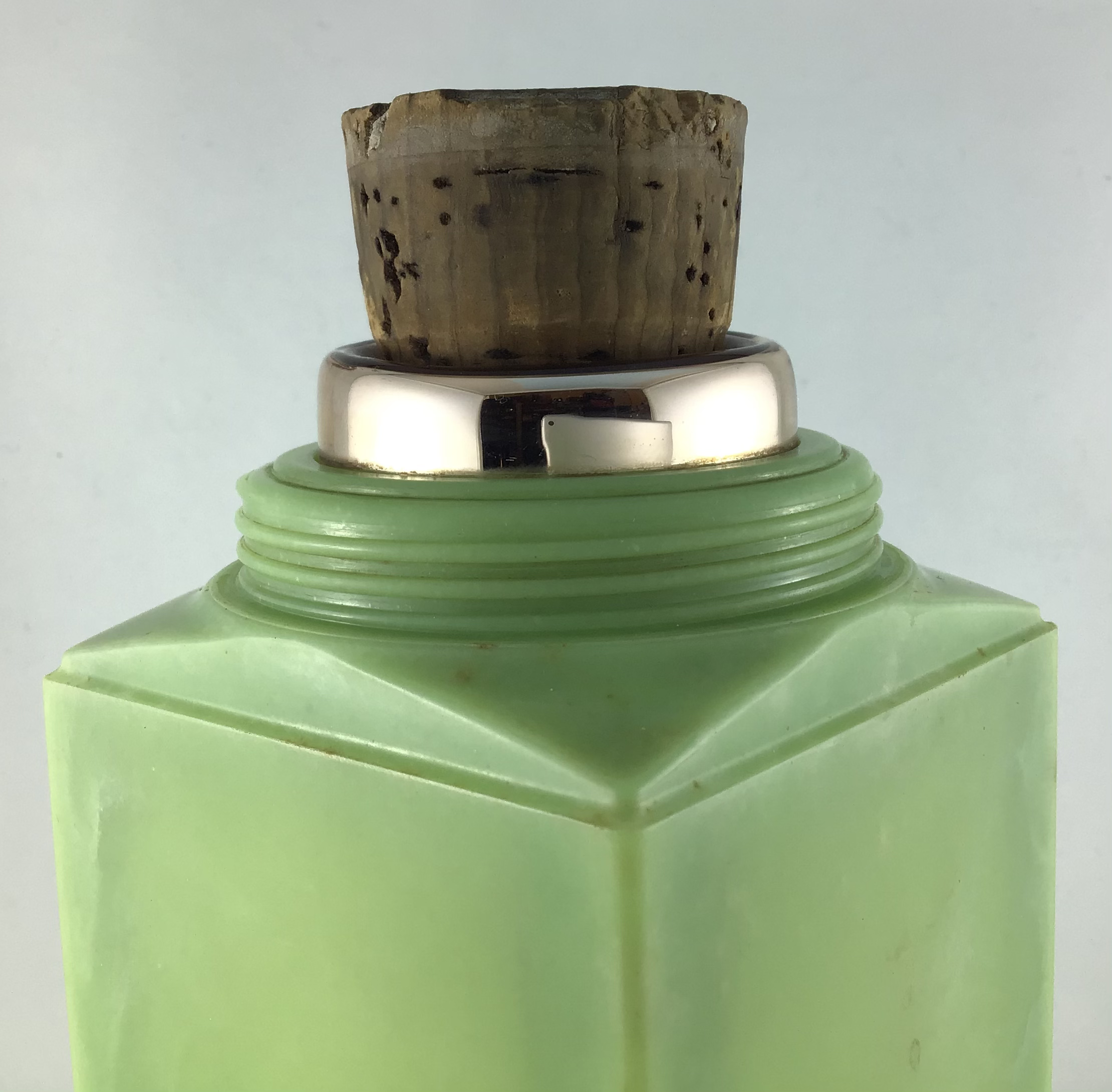 Art Deco square pillar shaped green marbled Bakelite thermos flask with removable drinking cup, Made in England.