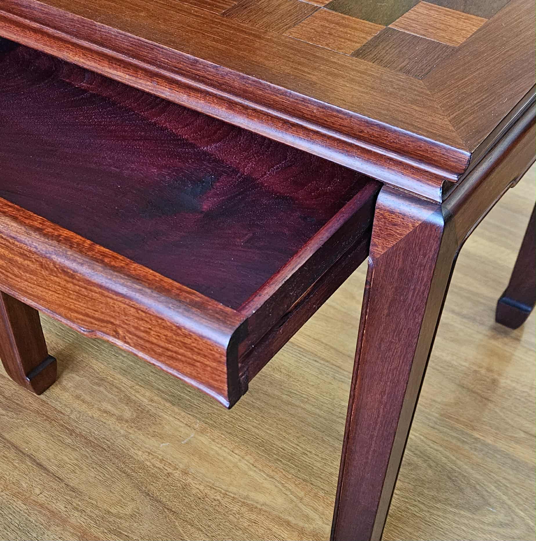 Chinese rosewood side table with marquetry chess board to the top. Storage drawer to the underside for storage of chess pieces. Pieces not included.  Lamp table, coffee table