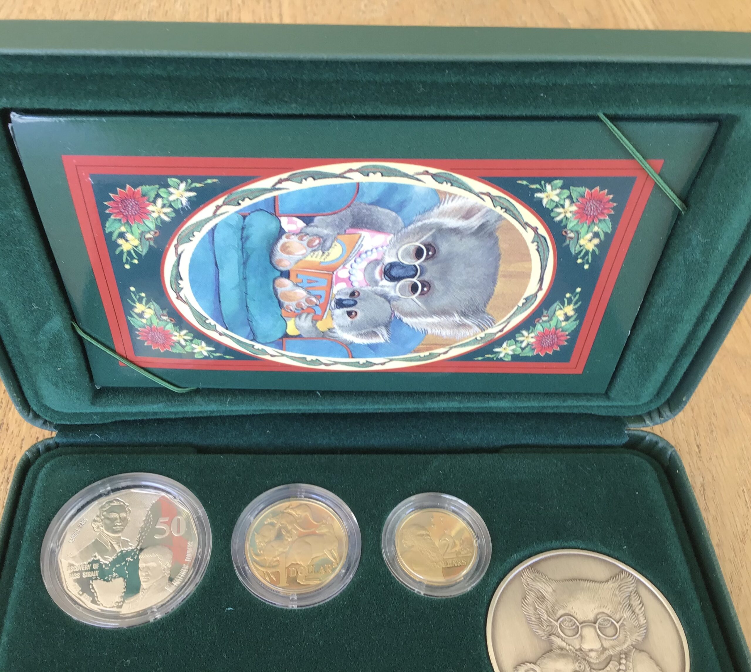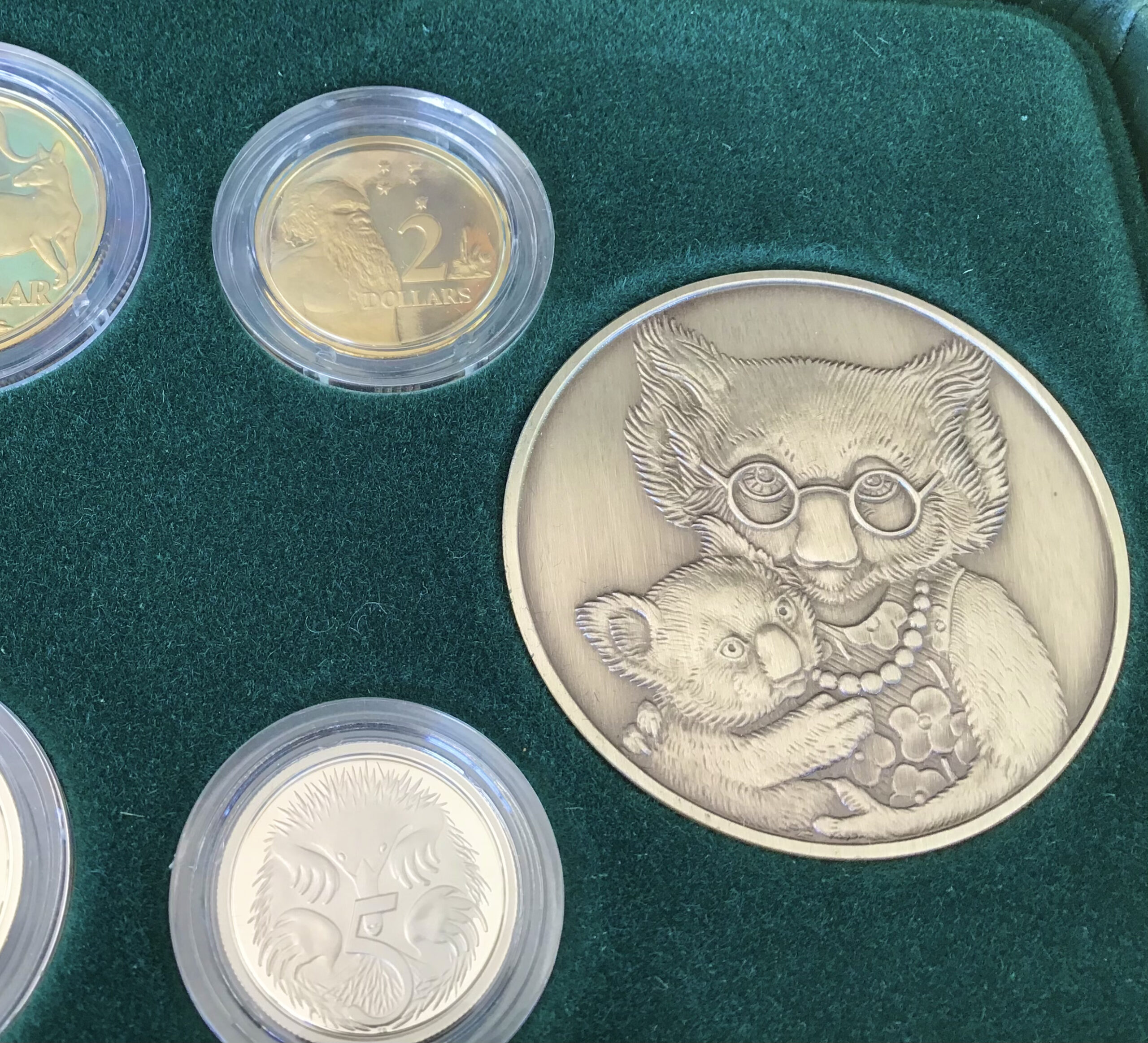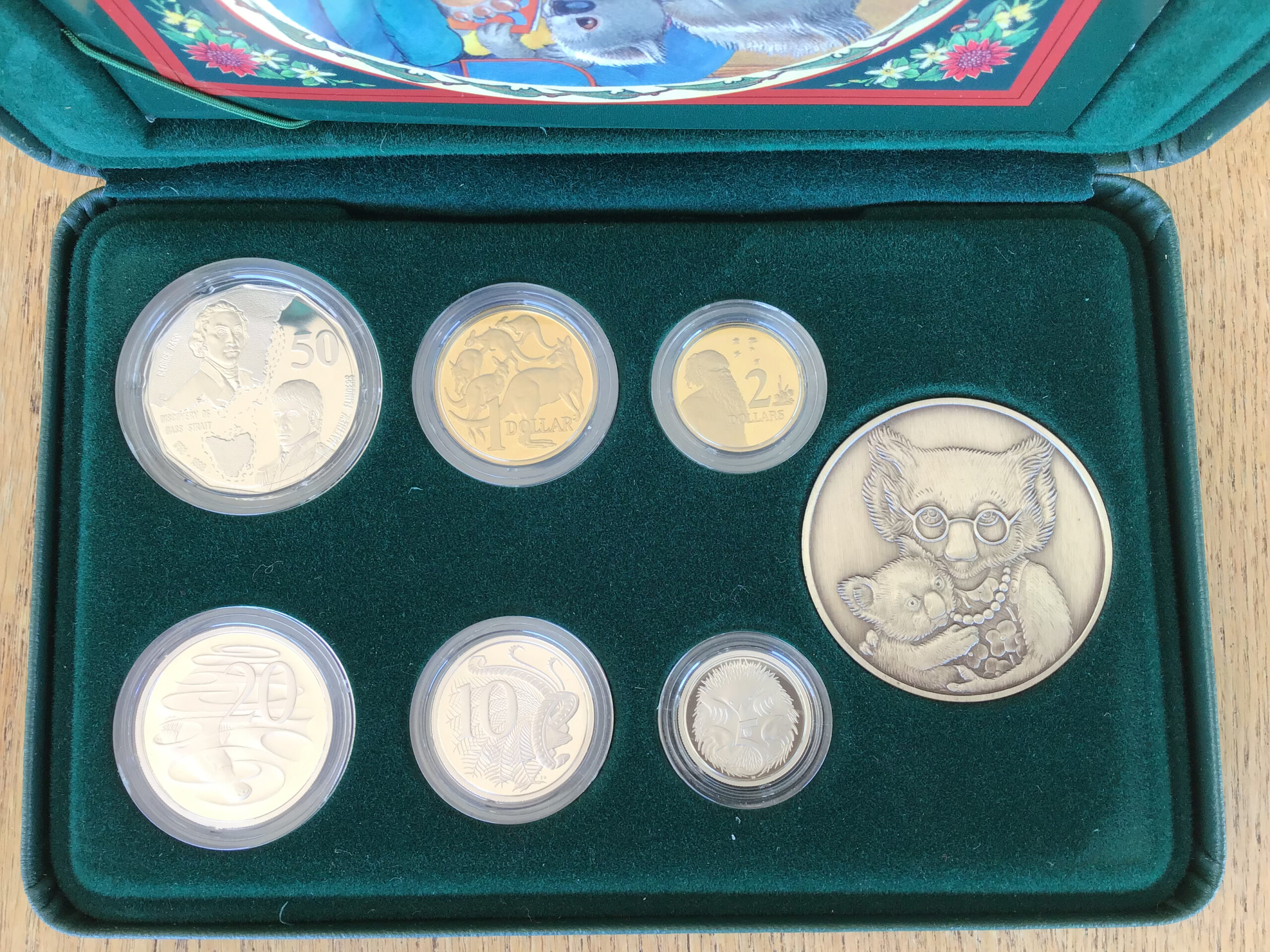 1998 Australian proof coin baby set in excellent condition featuring individually packaged coins $2 $1 50c 20c 10c and 5c and also a burnished sterling silver Koala medallion where the baby’s name can be engraved on the back. The set is complete with family tree card to complete baby’s details.