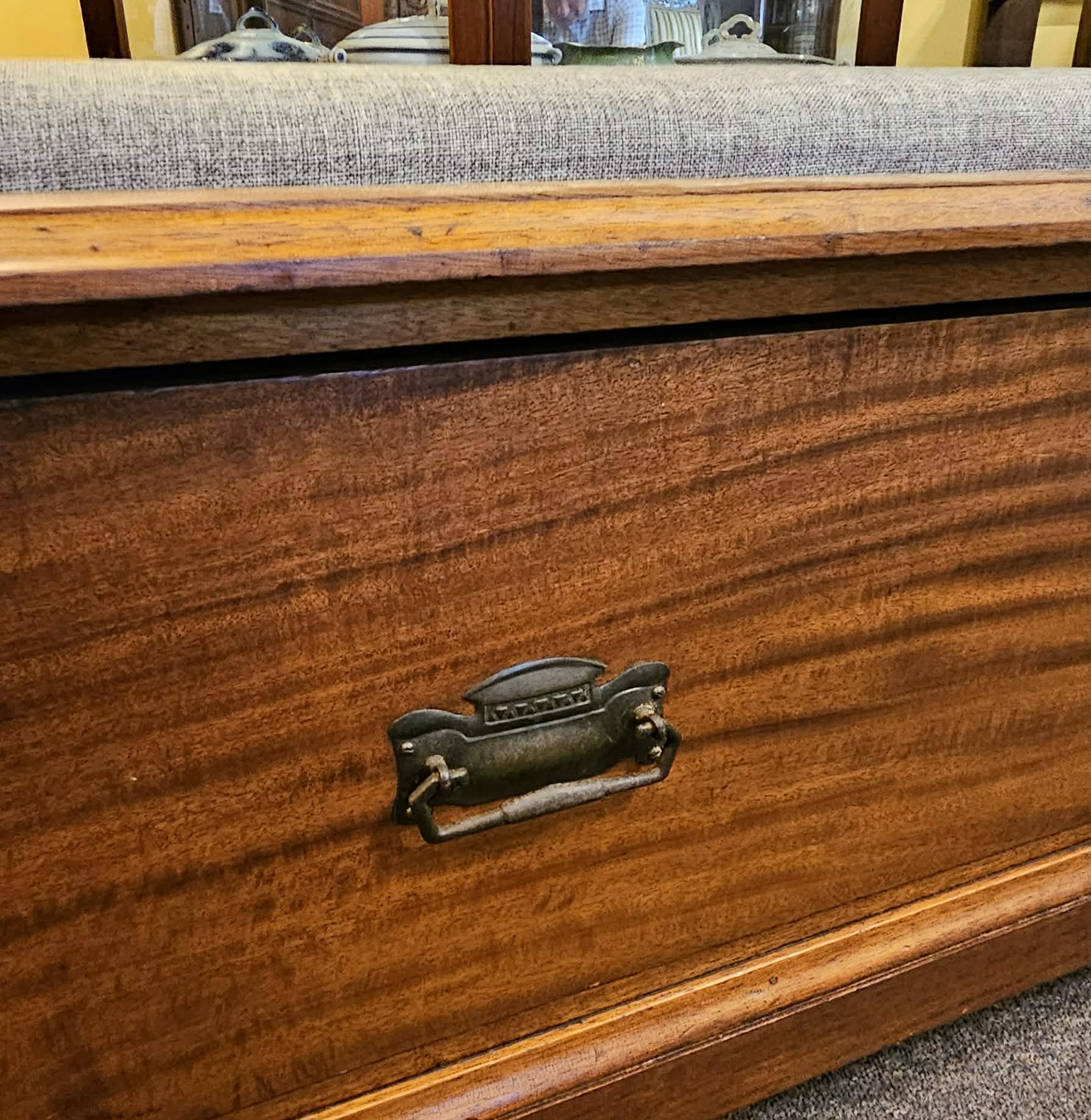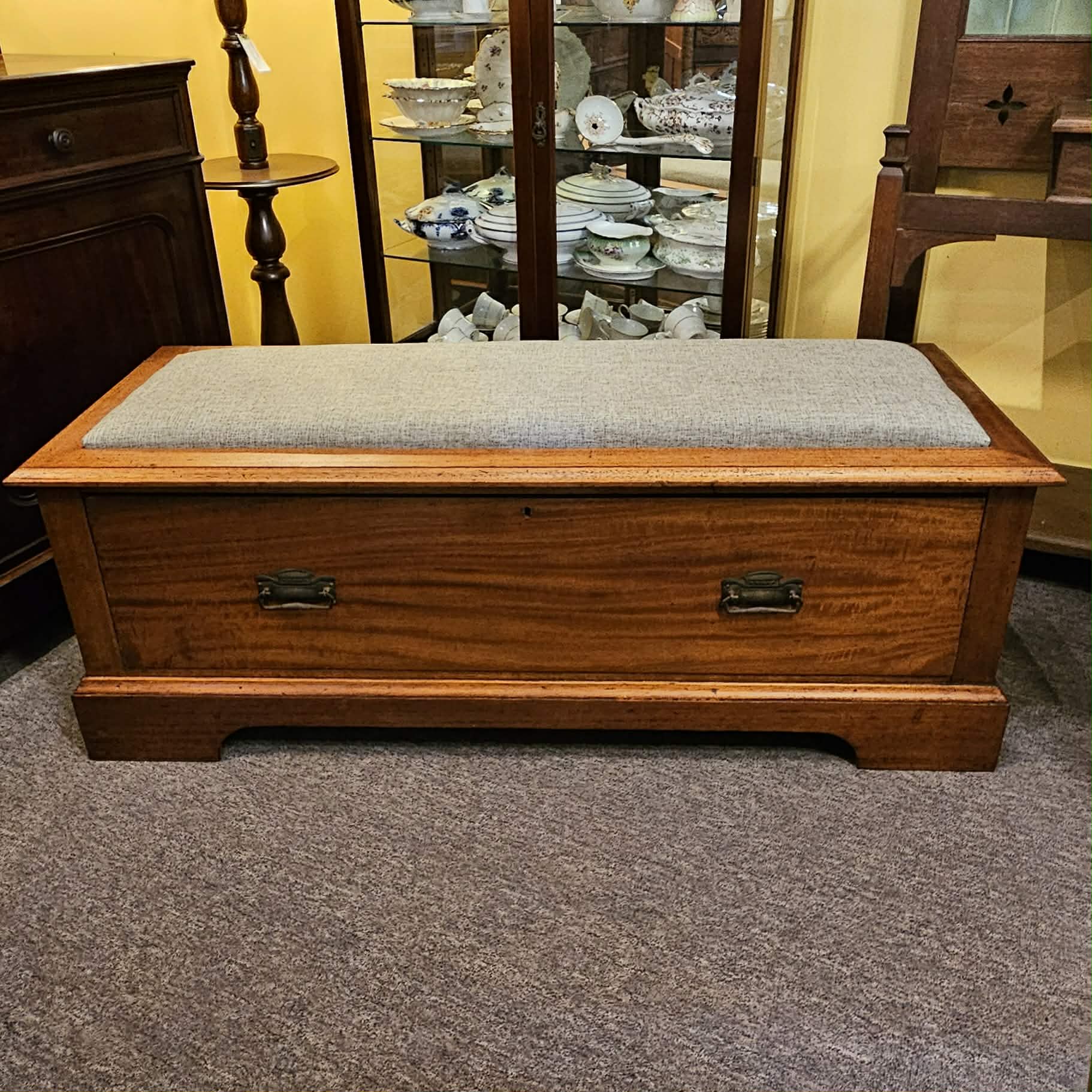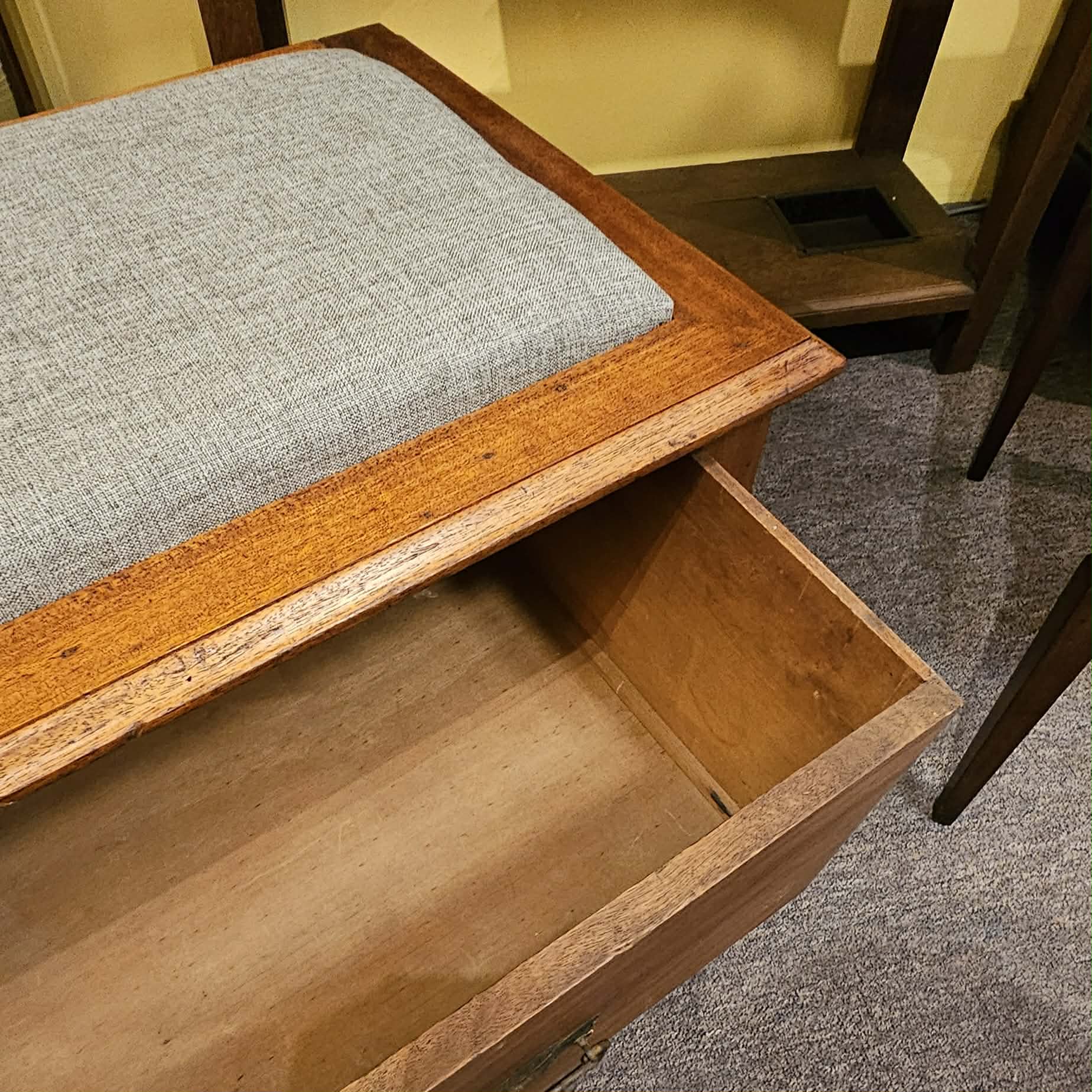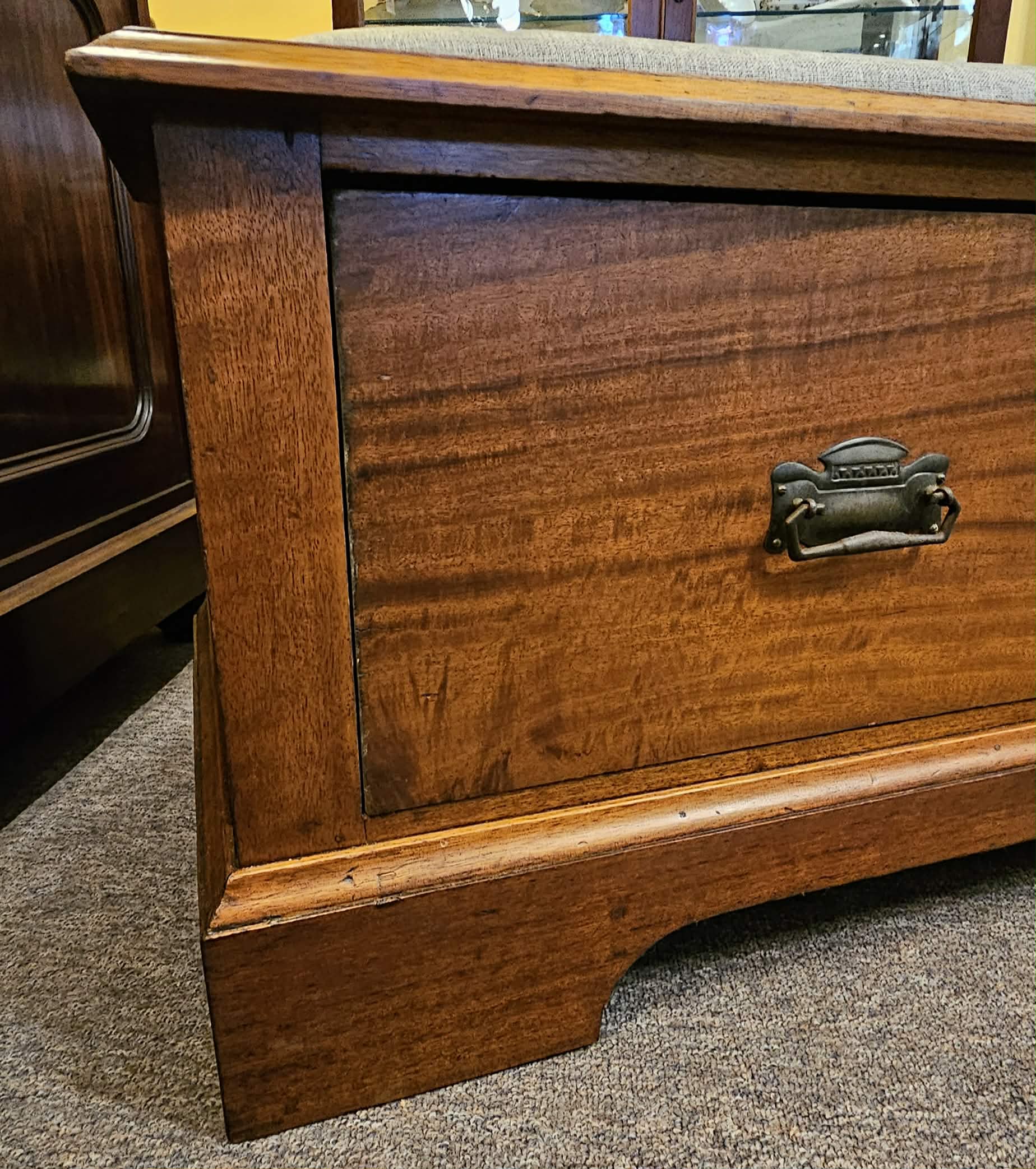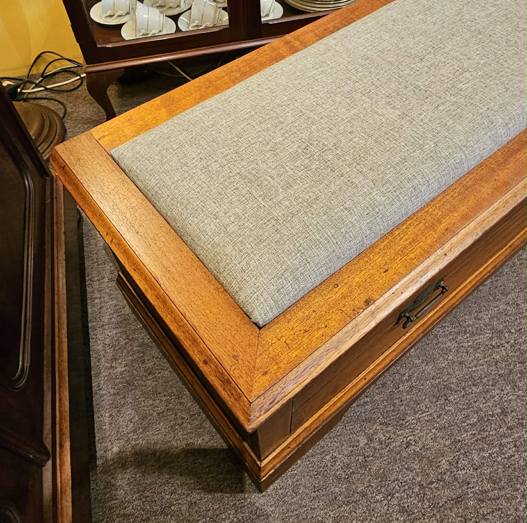 Queensland maple Federation style bed end upholstered top stool with storage drawer for blankets, clothes shoes etc.
