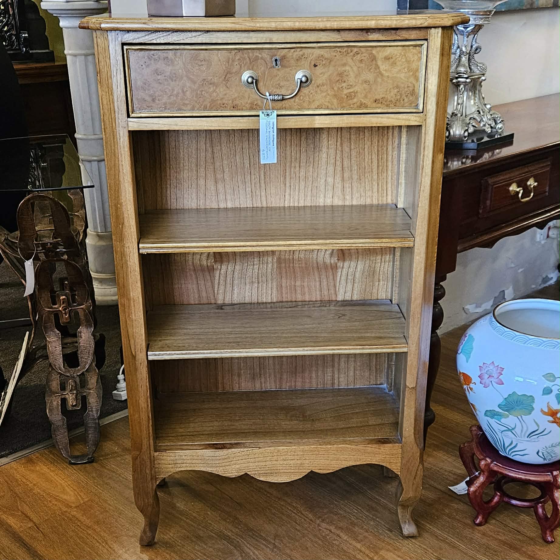 Small good quality bookcase display shelves crafted in mindi with pollard oak veneers to the top and drawer front. The cabinet is of pleasant proportions suitable as a hallway table.