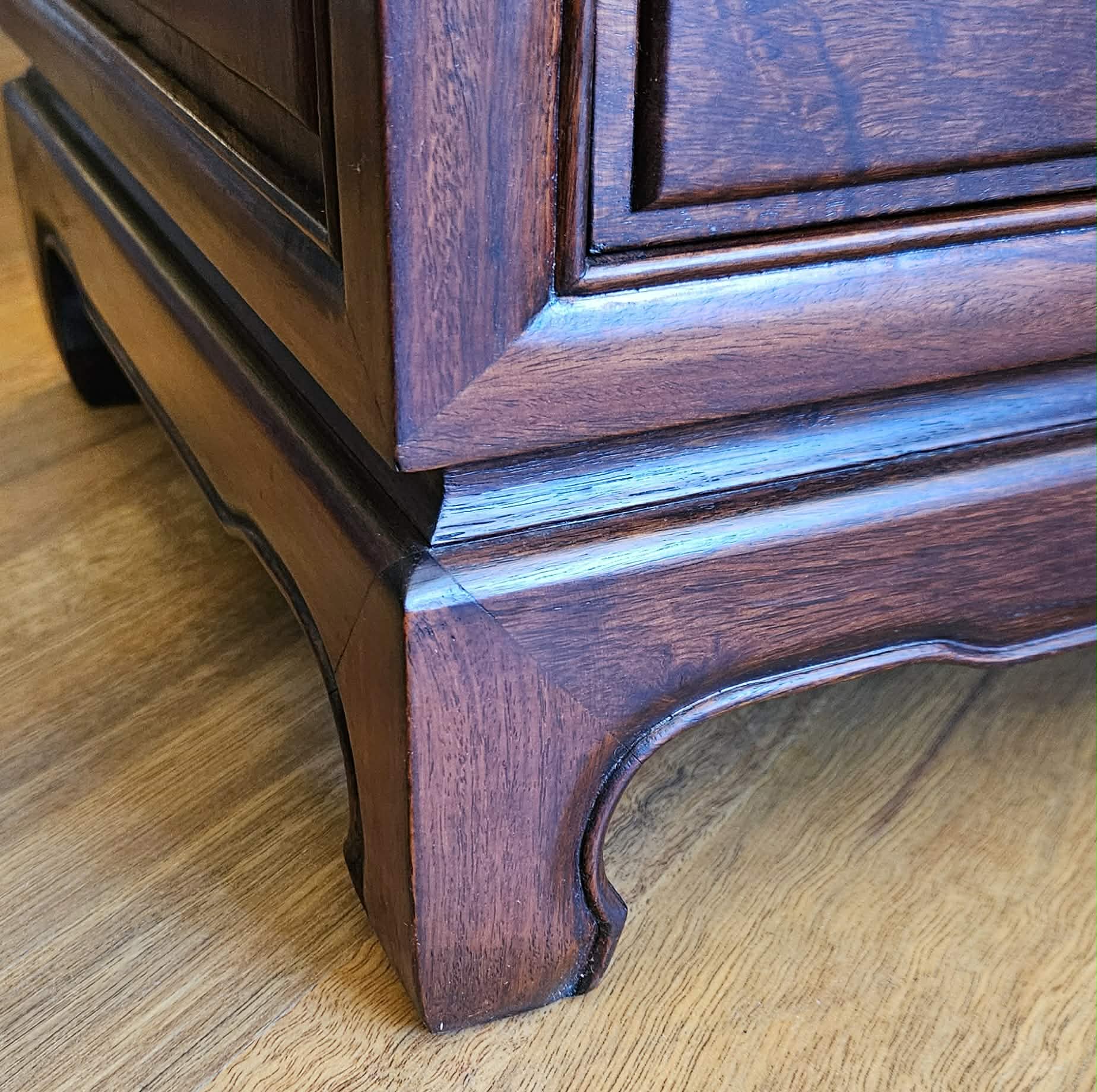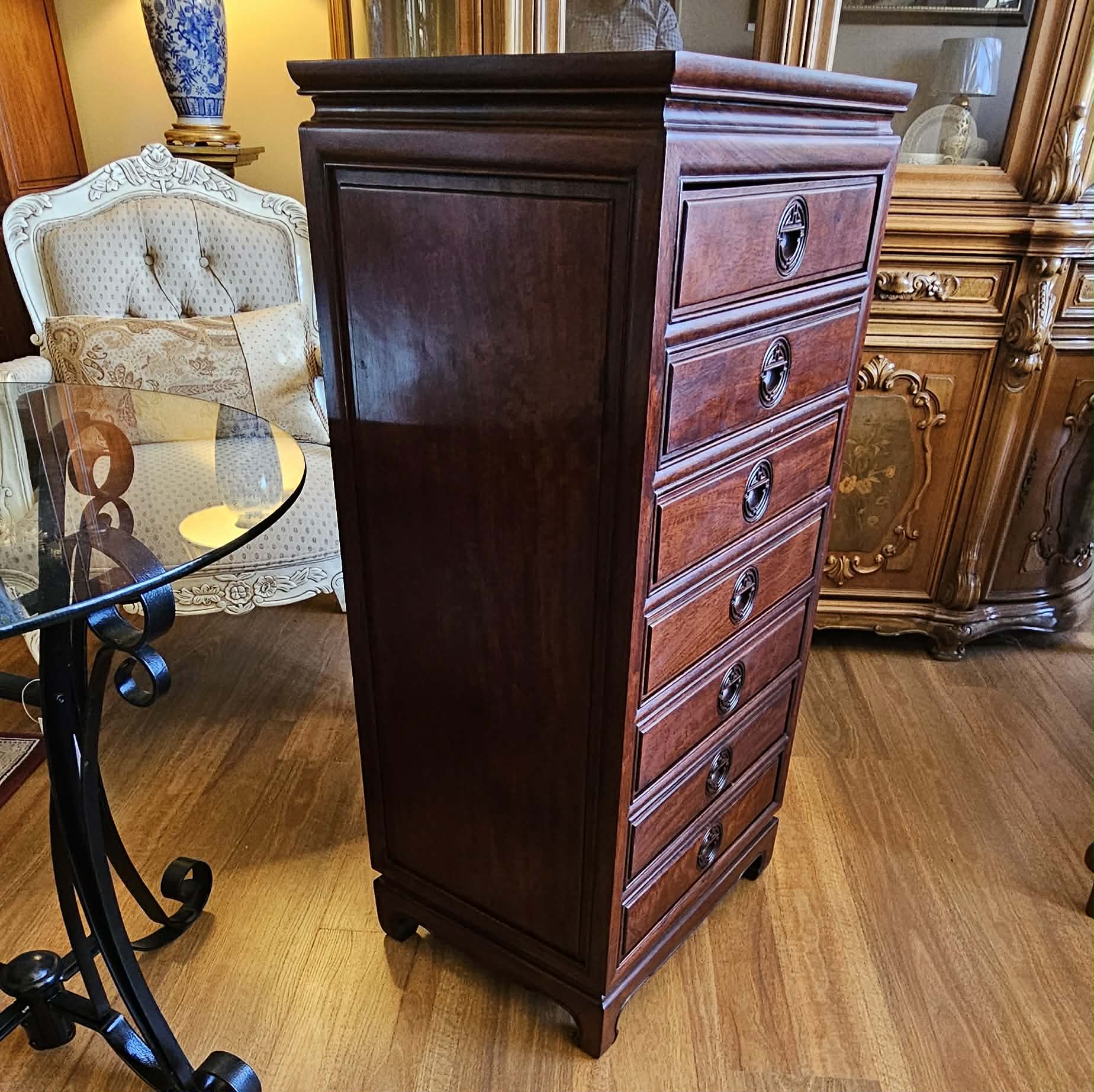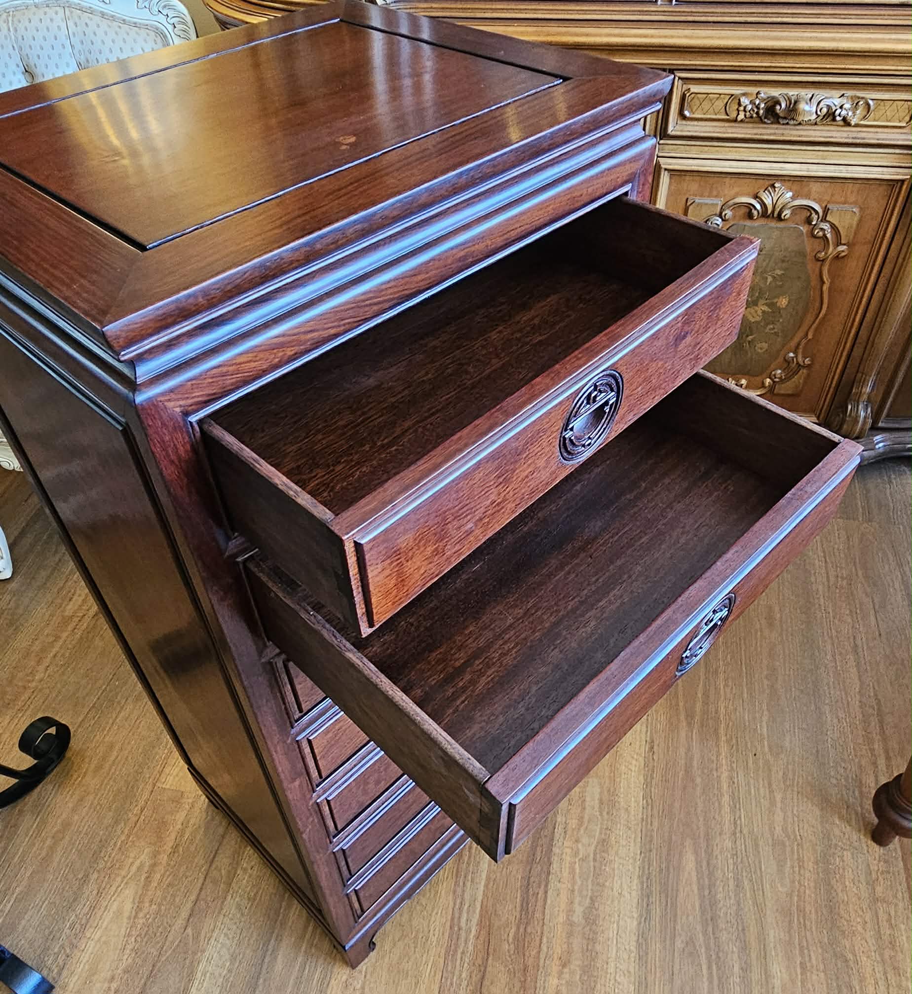 Chinese solid rosewood handcrafted 7 drawer chest, the drawer fronts have the Chinese shou symbol of prosperity and long life.