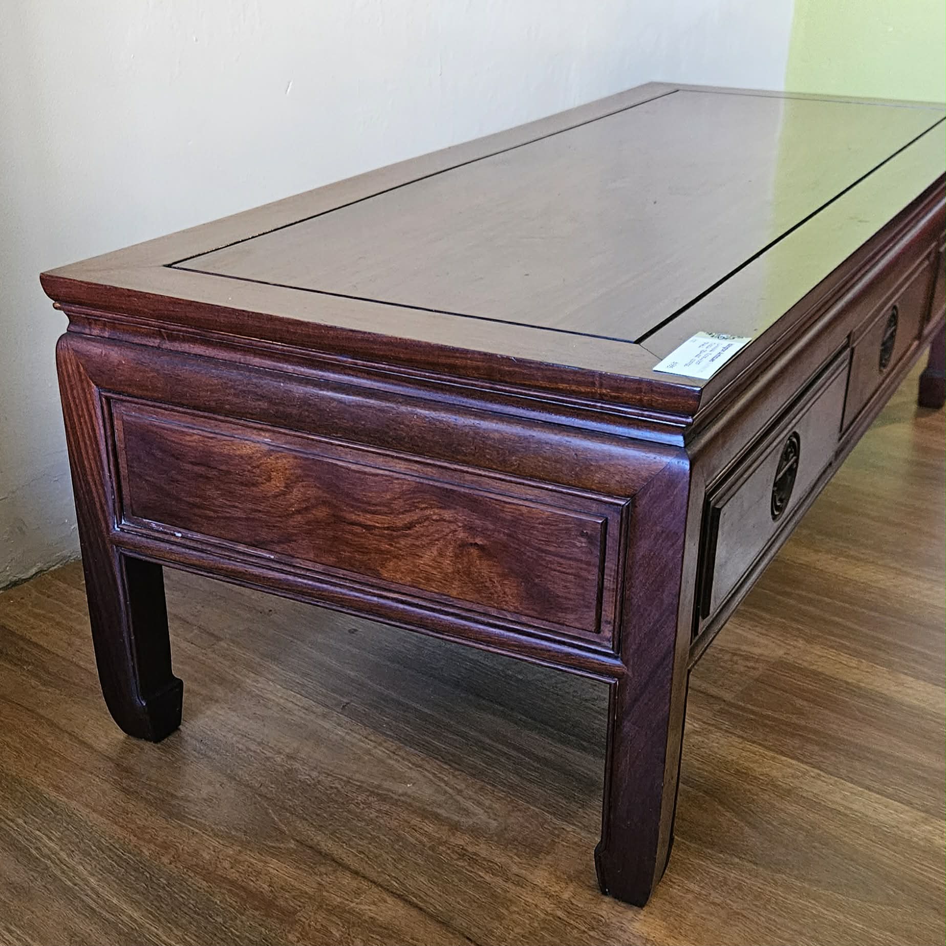 Chinese rosewood handcrafted coffee table with 3 drawers for storage. The drawers have the Chinese shou symbol to the drawers meaning long life and prosperity.