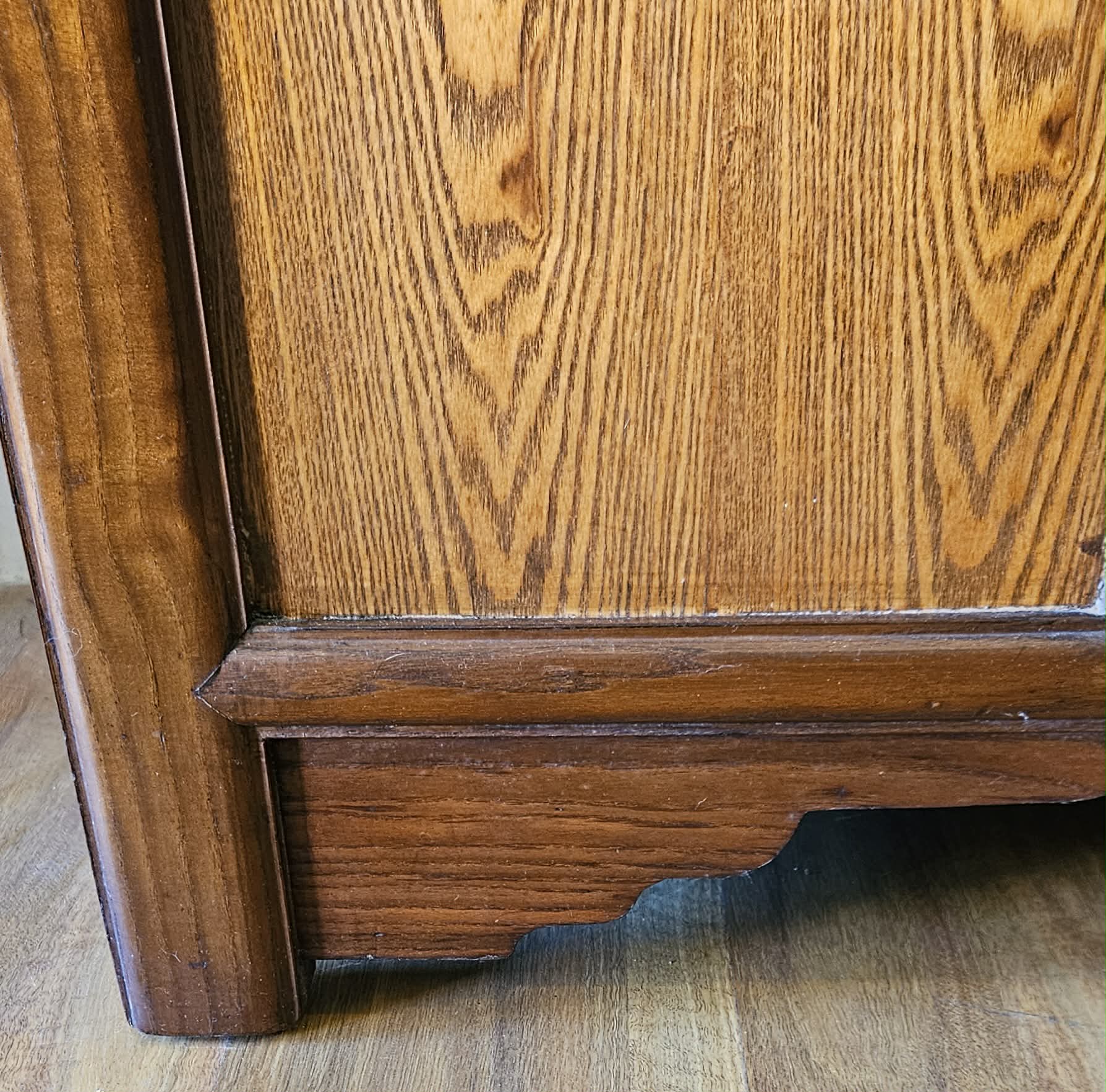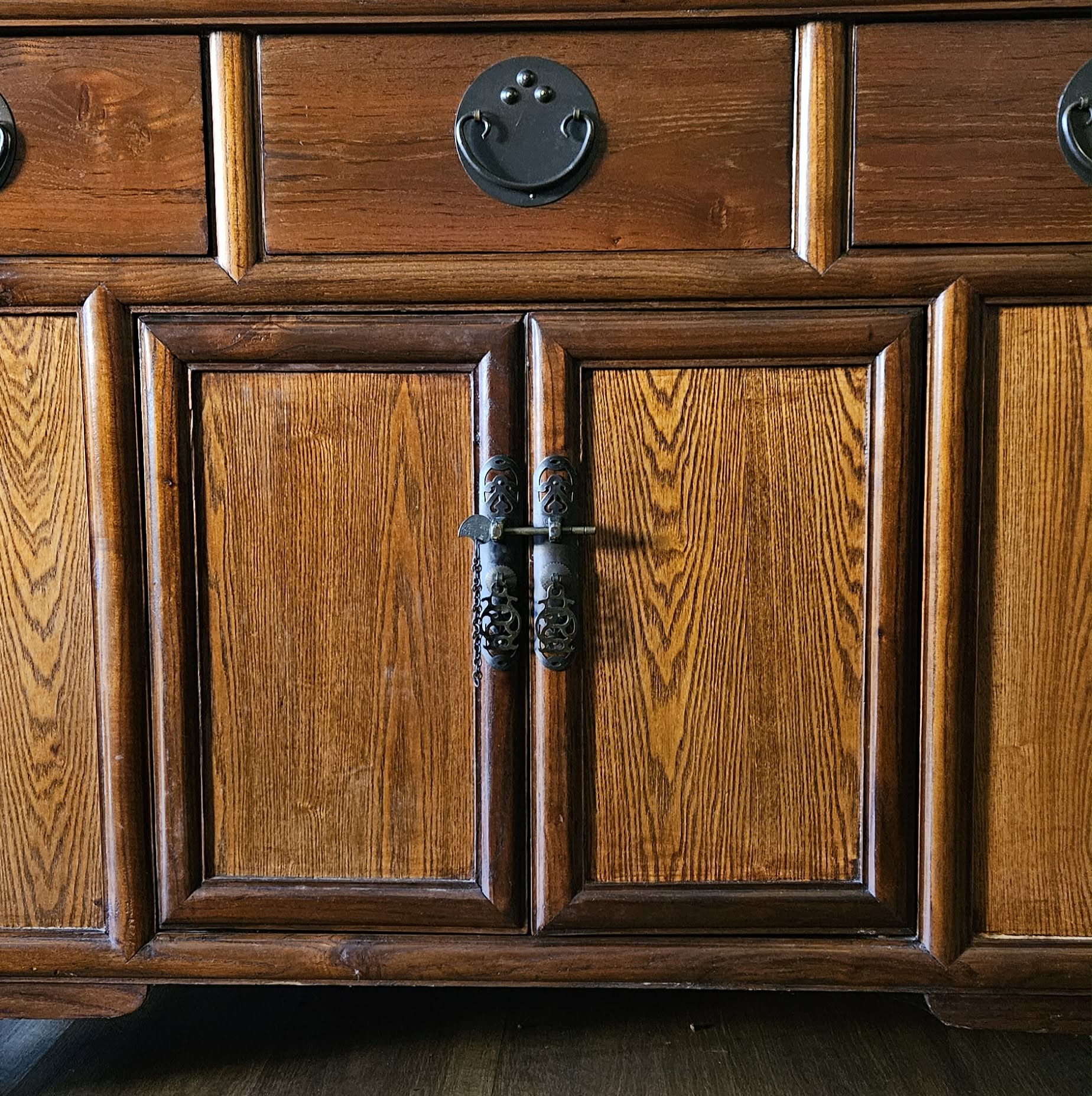 Handcrafted Chinese elmwood altar table, four door sideboard with storage drawers.