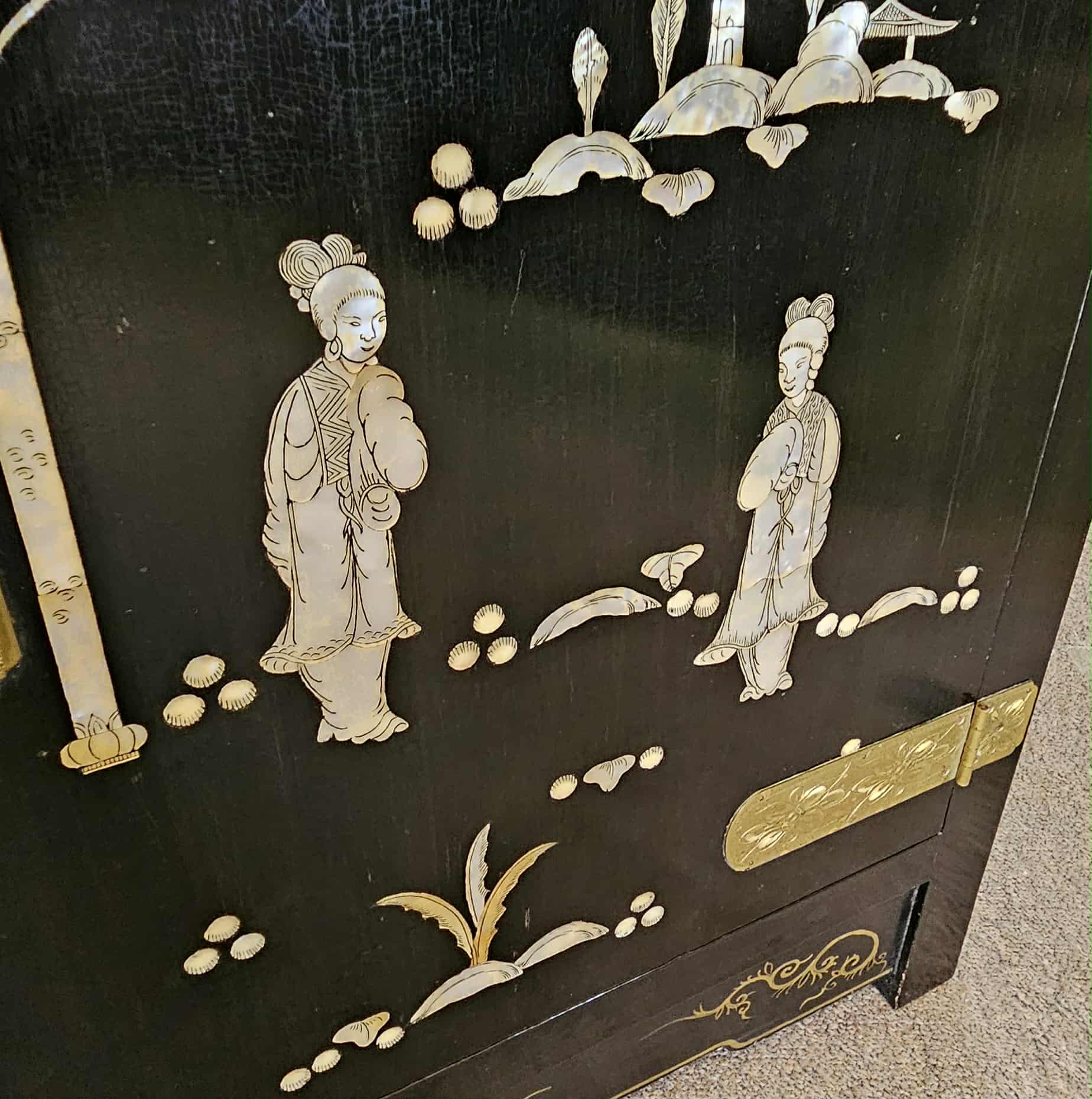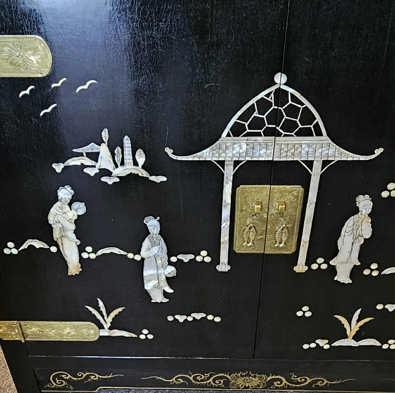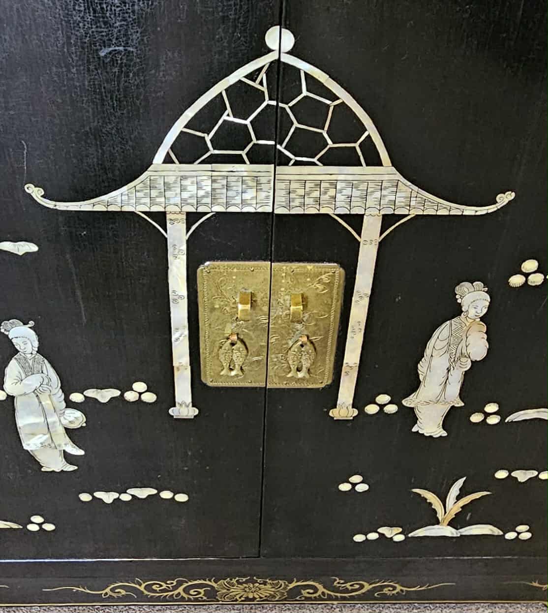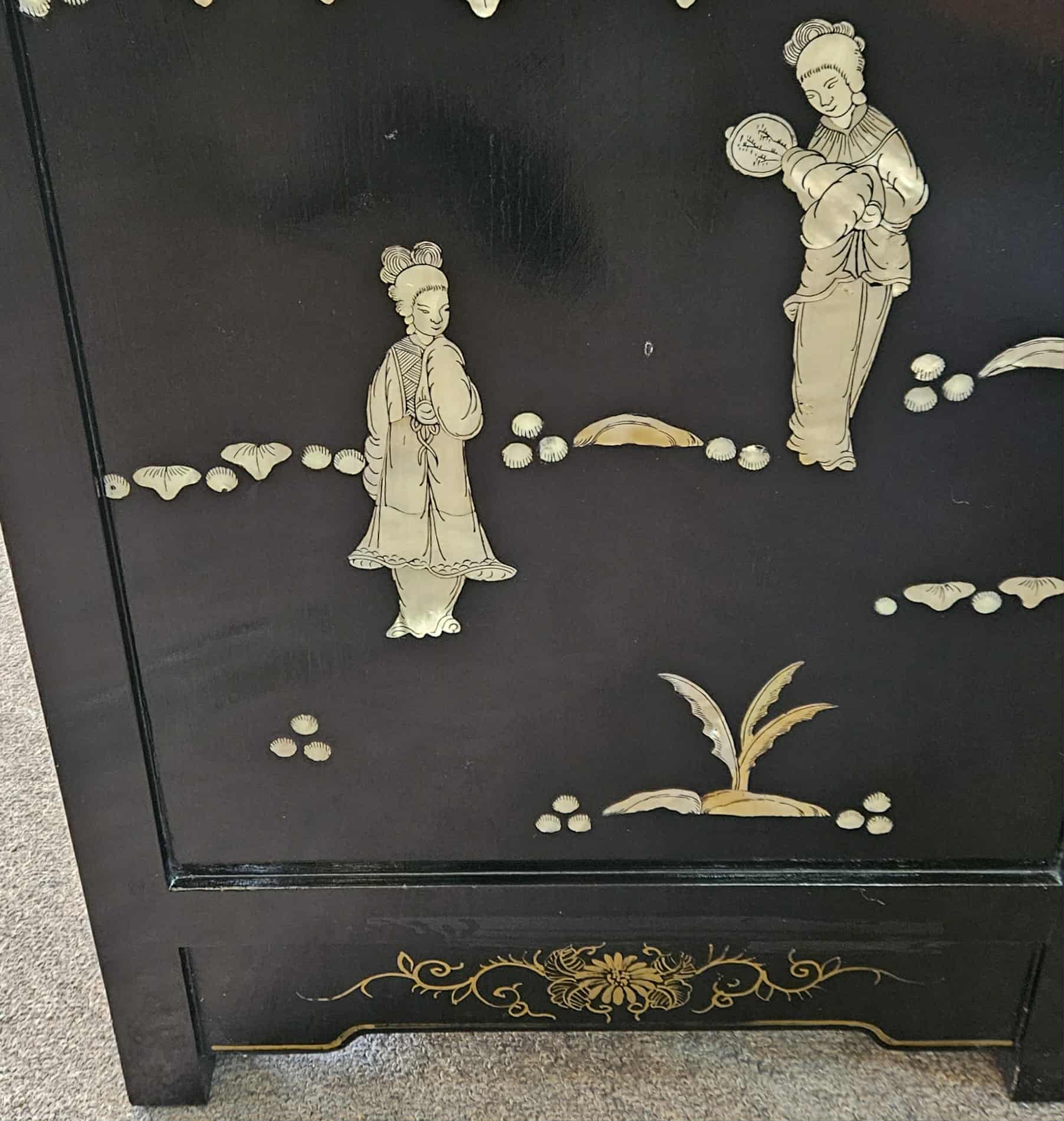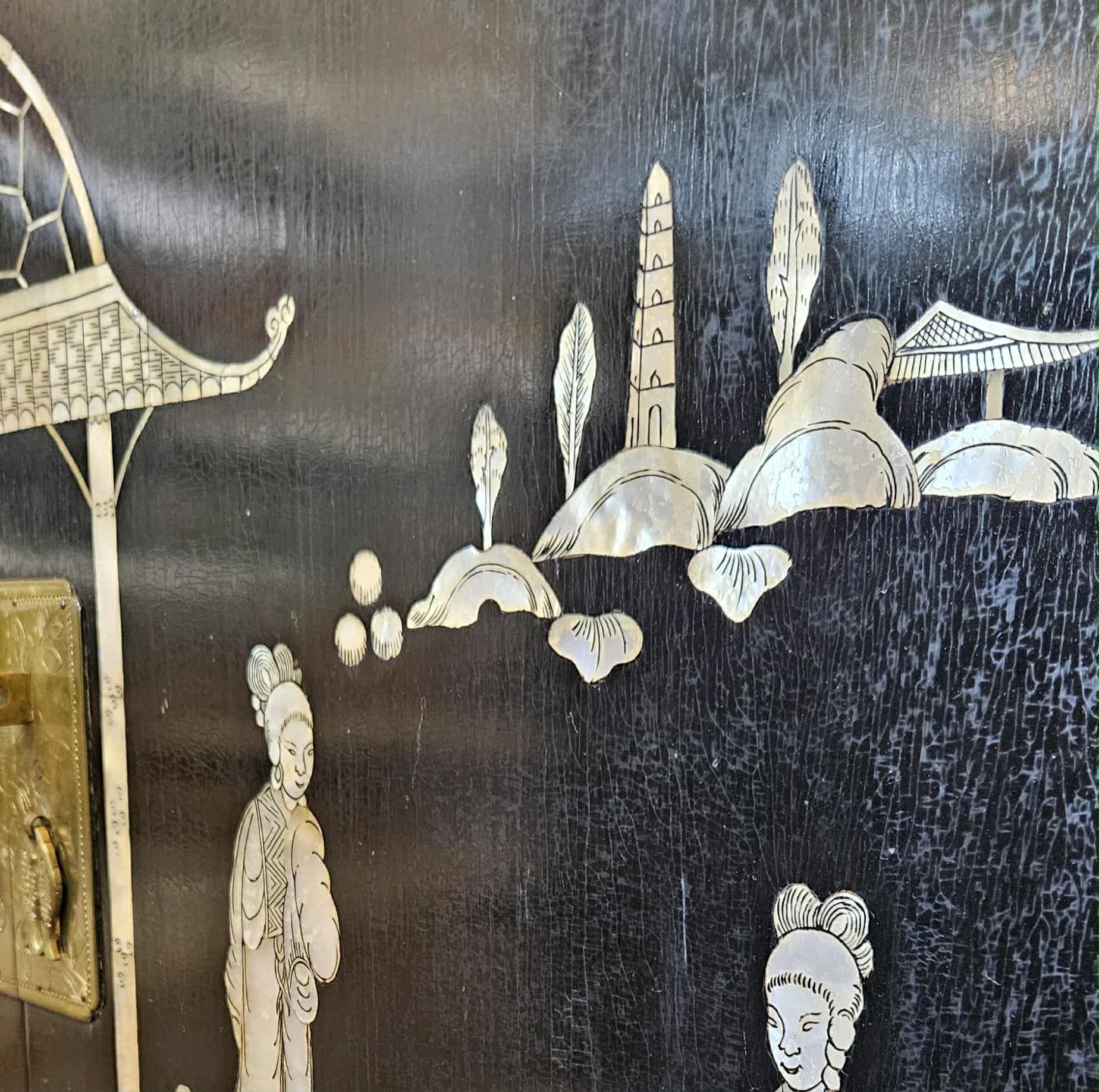Chinese black lacquered sideboard or cocktail cabinet with inlayed good quality handcarved mother of Pearl decorations of Chinese figures in traditional dress, rural scenes under the moonlight. A pagoda spanning decorative brass door hardware forms a central focal. Internally the cabinet is fitted with a bottle drawer, glass rack and central storage shelf.