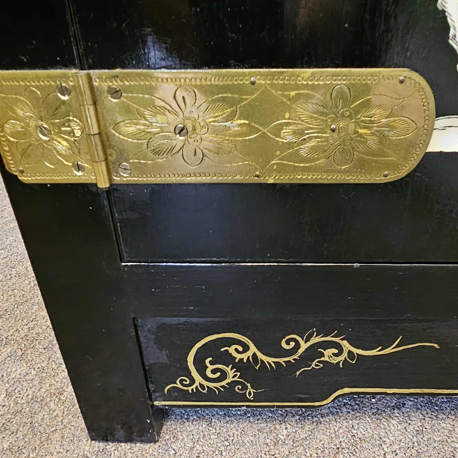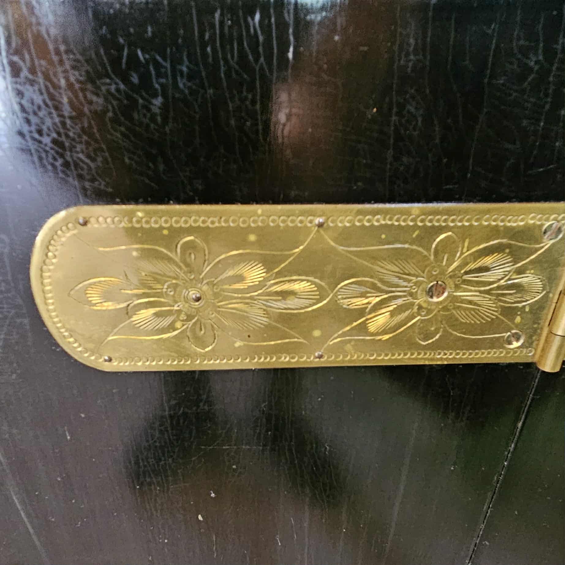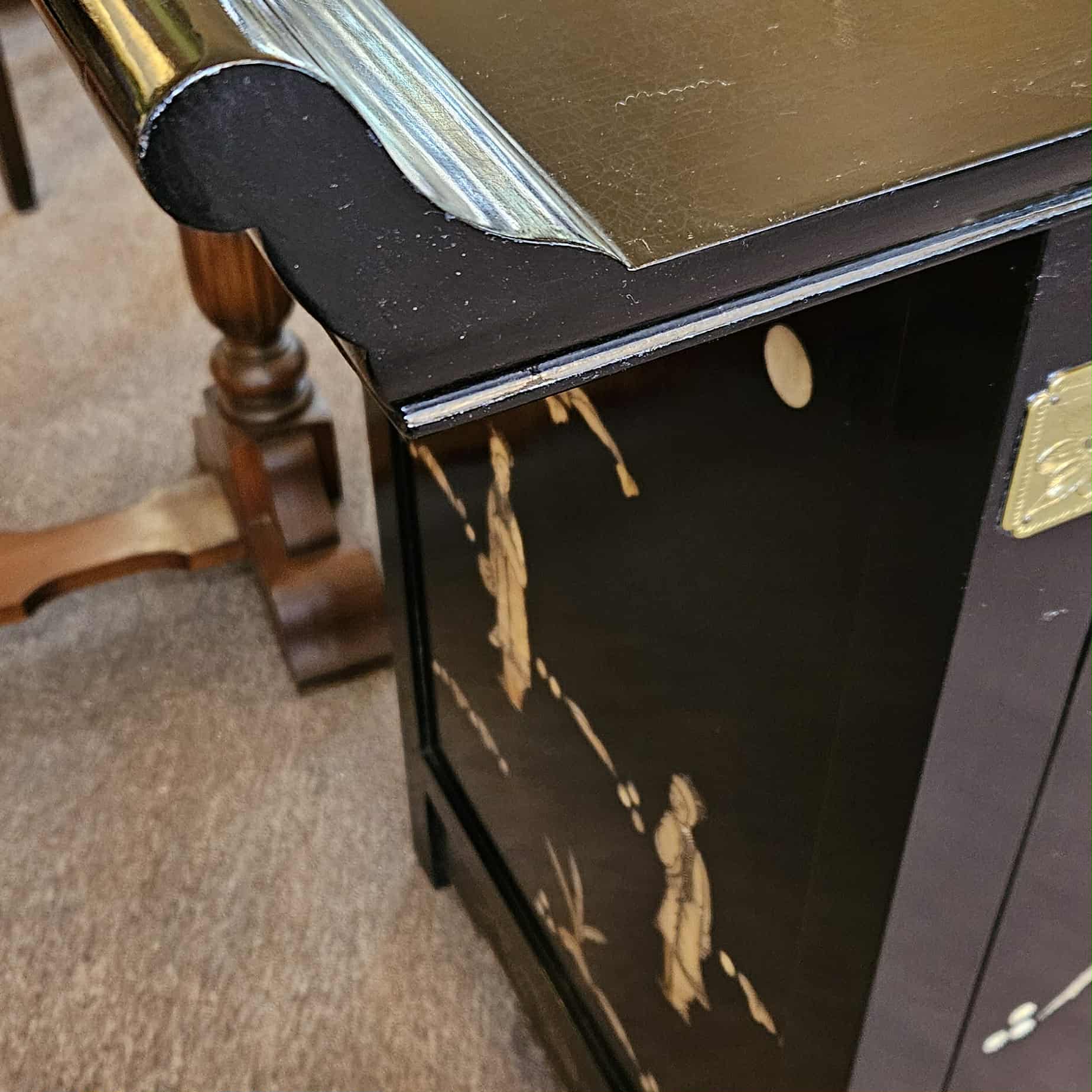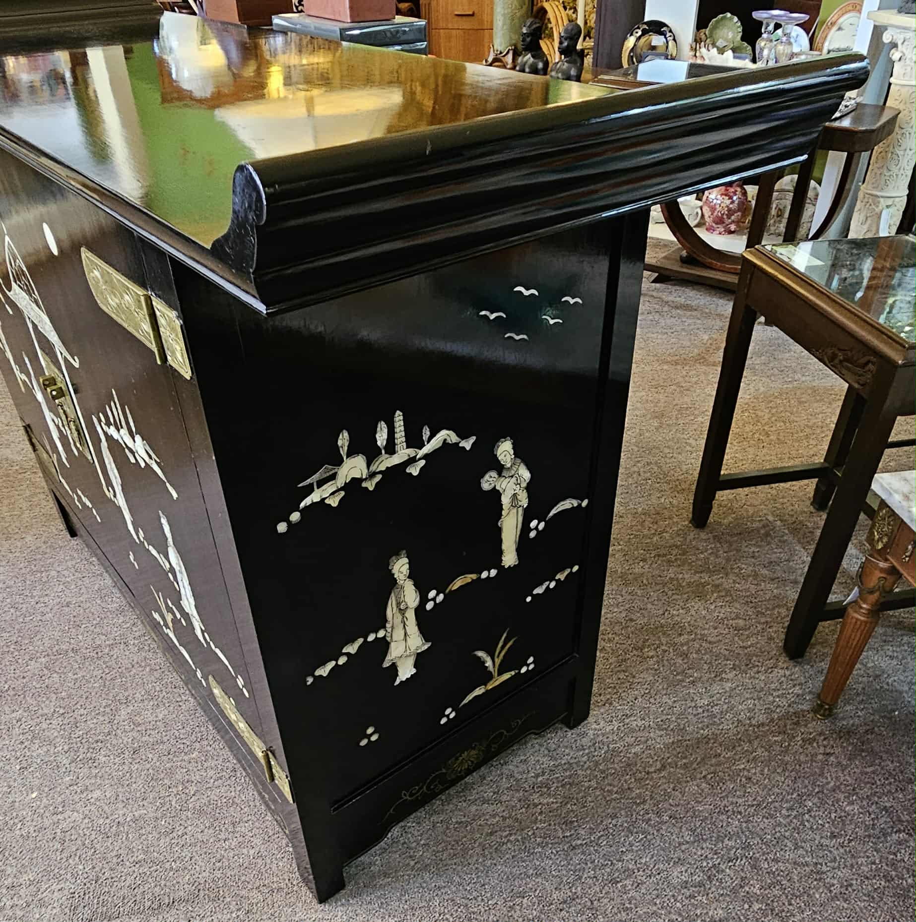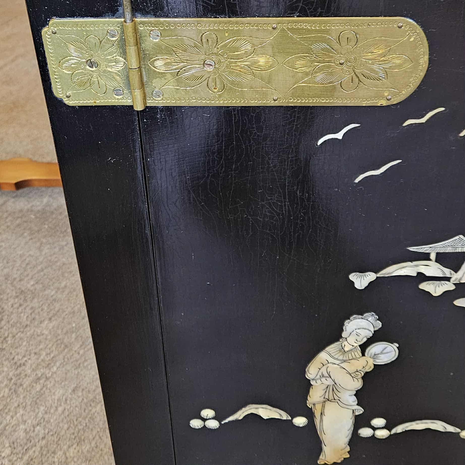 Chinese black lacquered sideboard or cocktail cabinet with inlayed good quality handcarved mother of Pearl decorations of Chinese figures in traditional dress, rural scenes under the moonlight. A pagoda spanning decorative brass door hardware forms a central focal. Internally the cabinet is fitted with a bottle drawer, glass rack and central storage shelf.