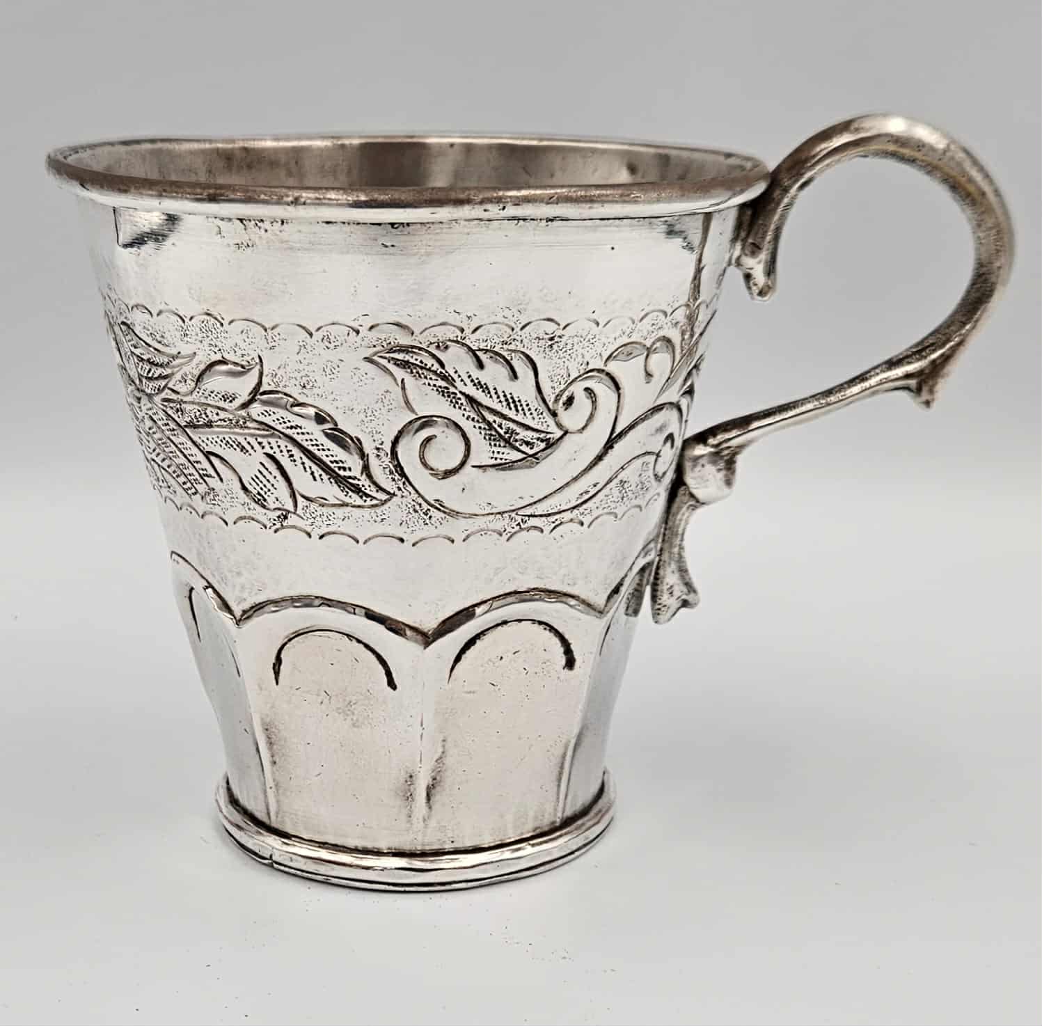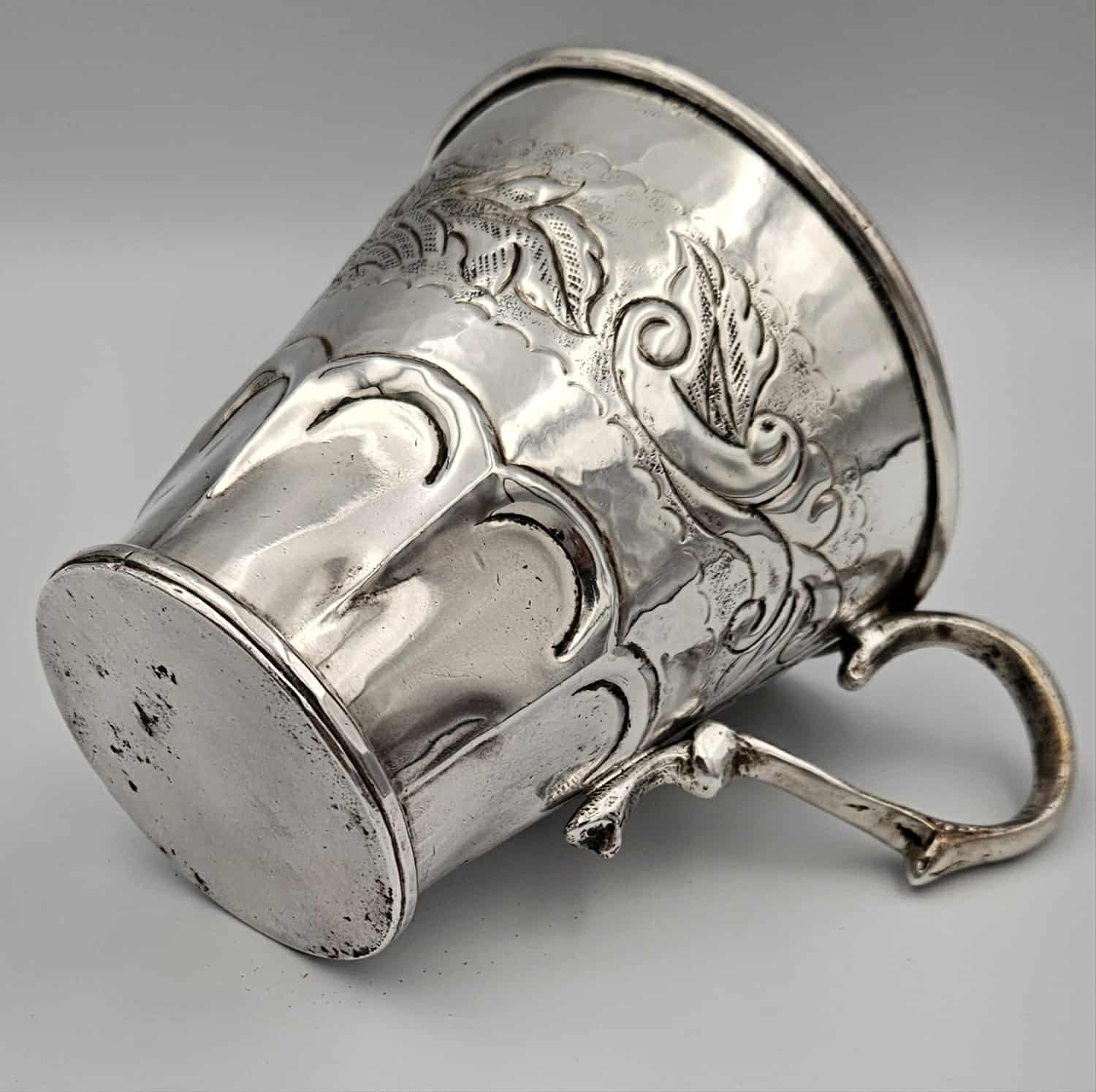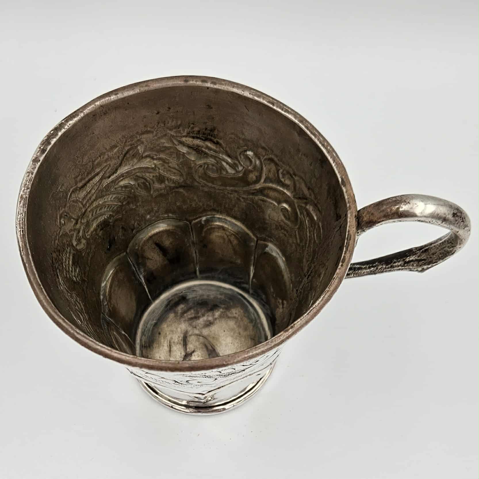 Handcrafted 19th century coin silver mug tankard with chased and repossessed bird and foliage design.