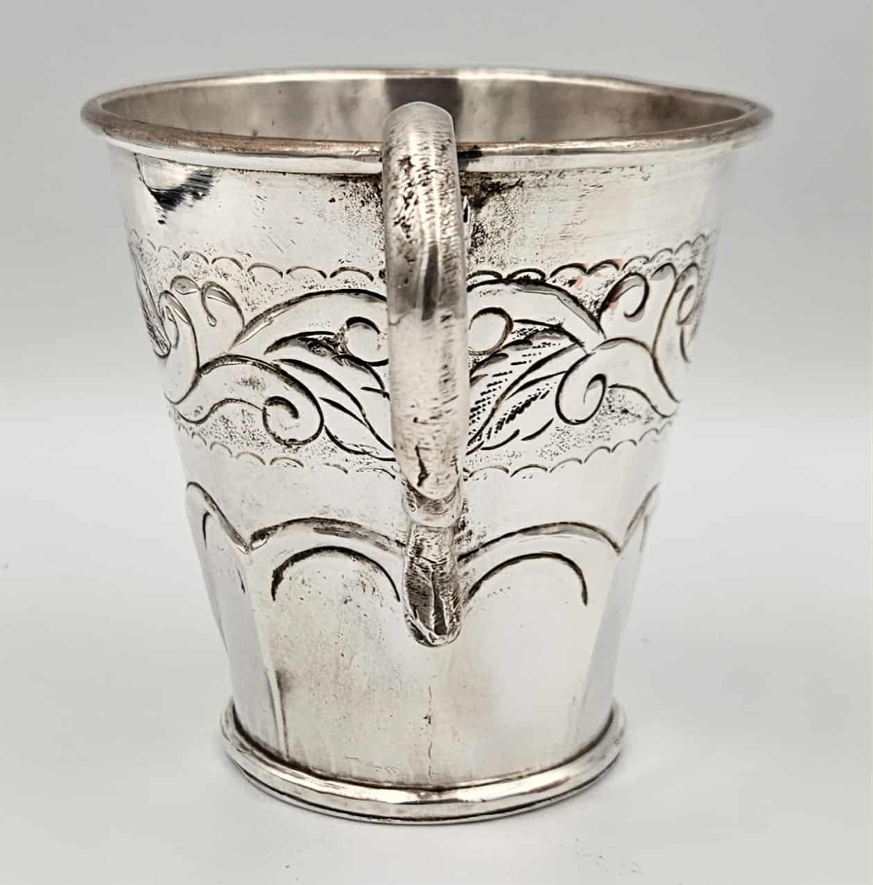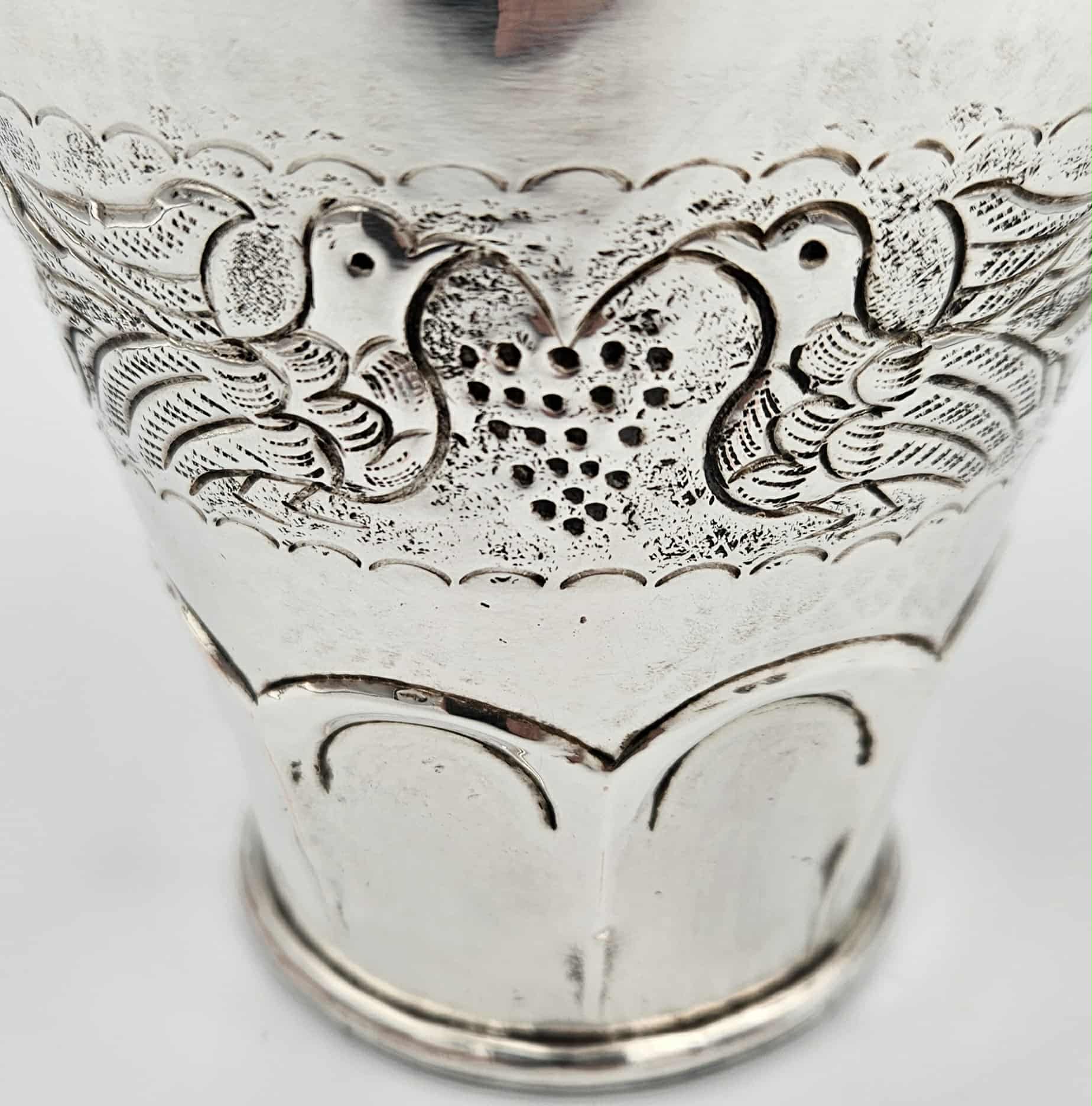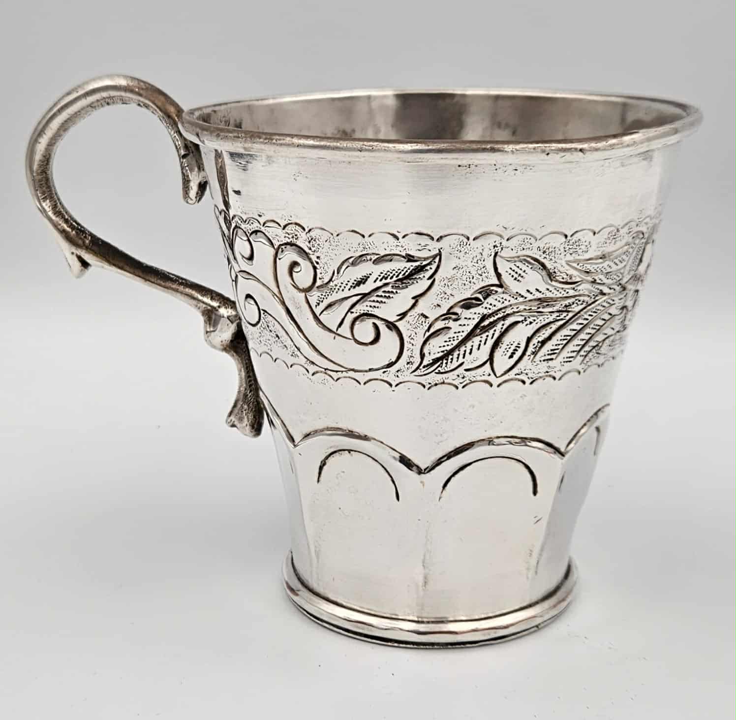 Handcrafted 19th century coin silver mug tankard with chased and repossessed bird and foliage design.