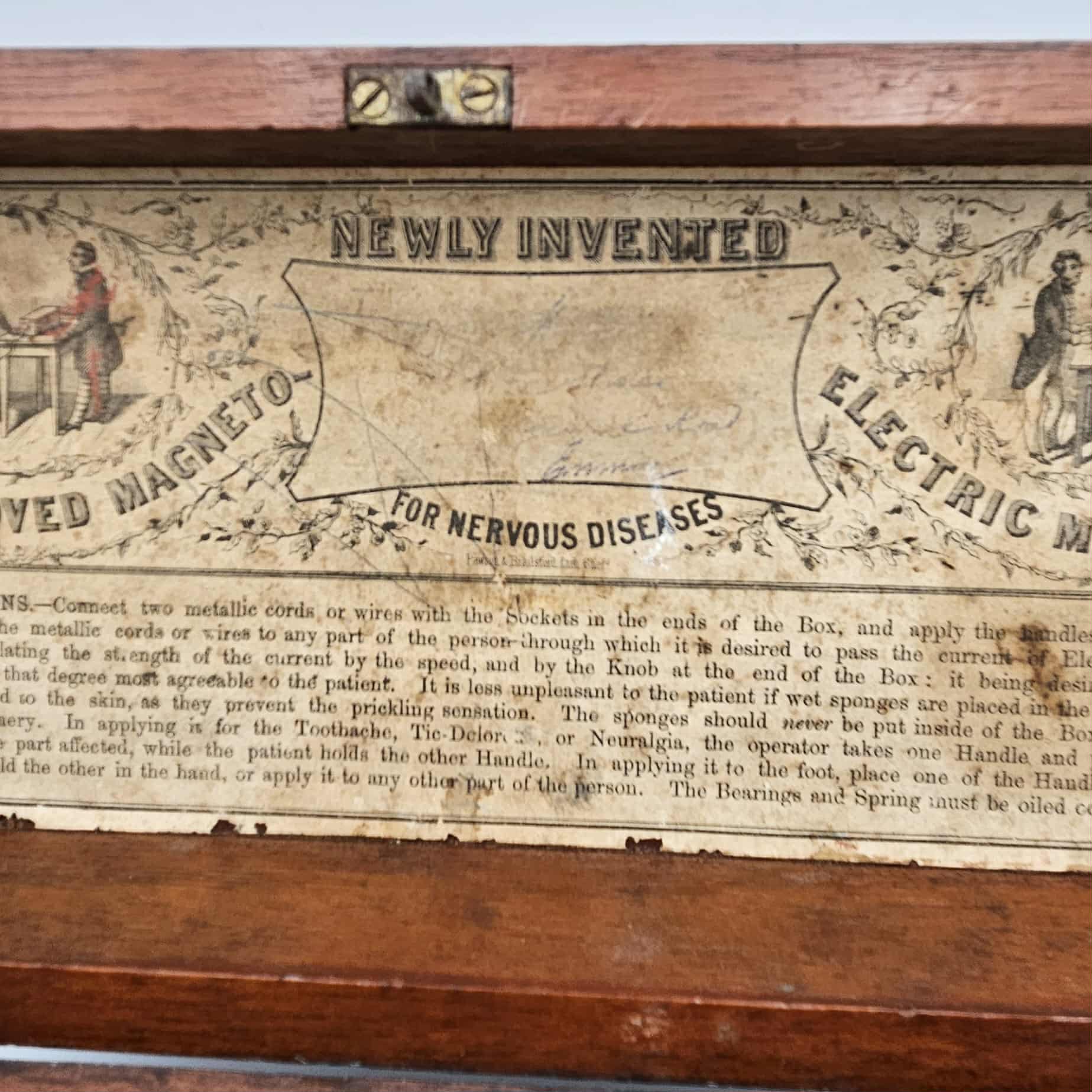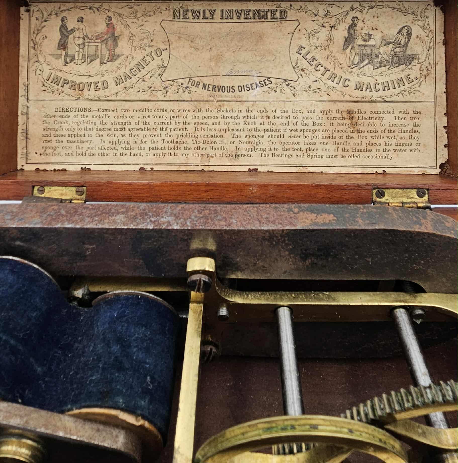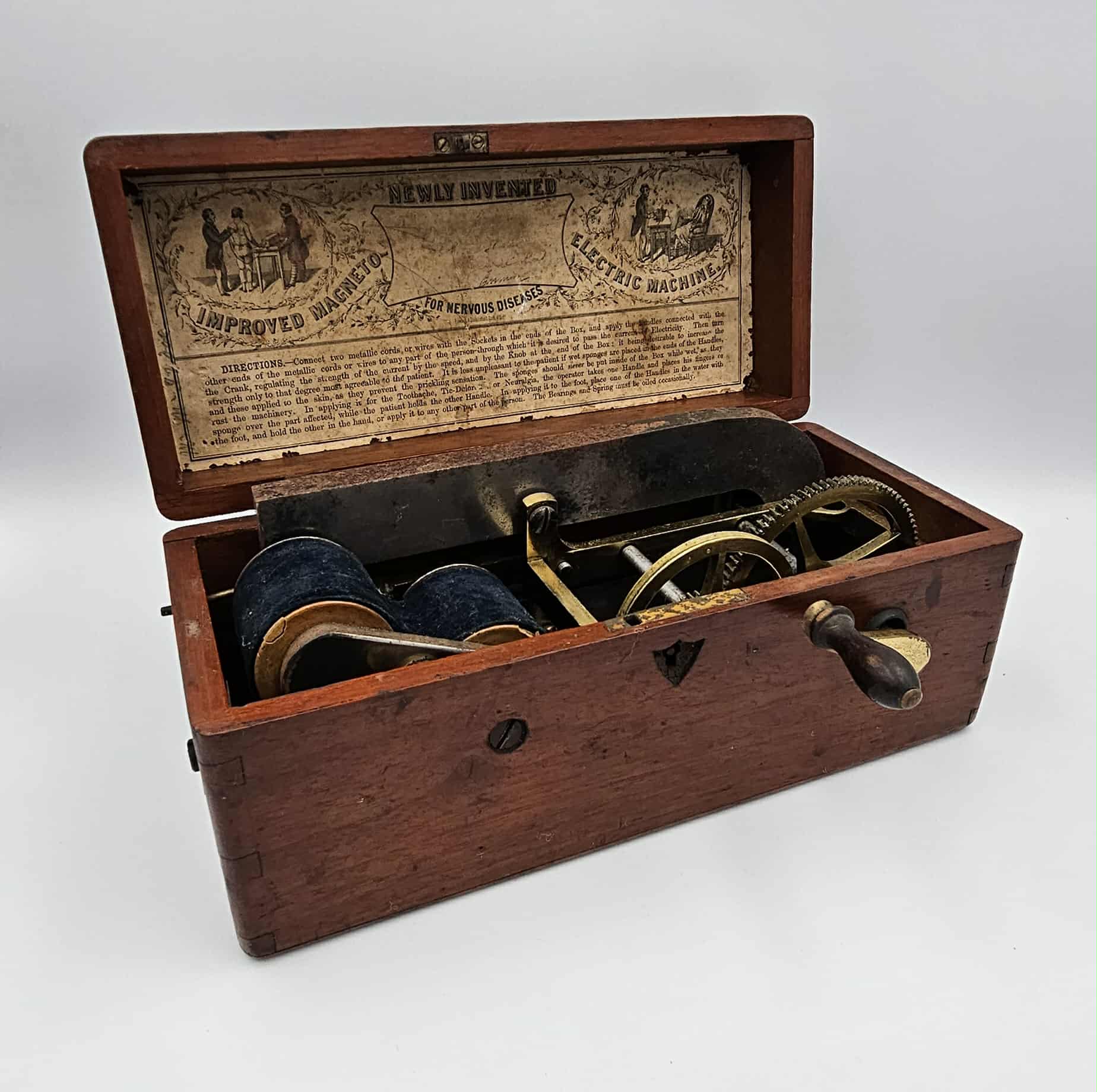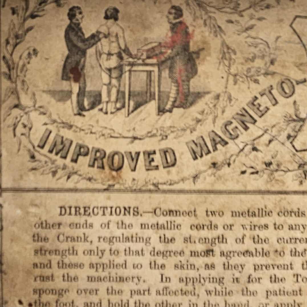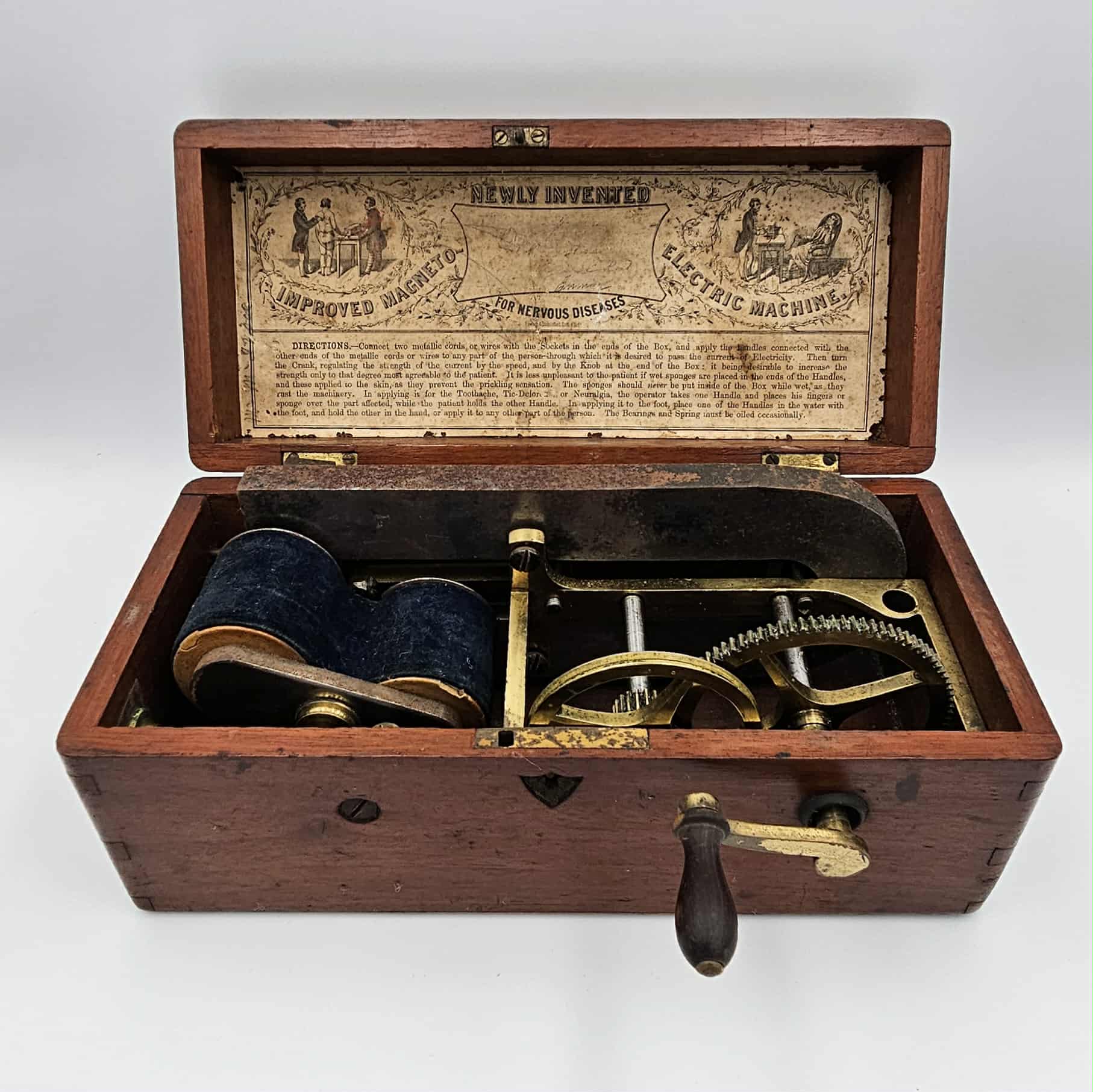 This Electric-Shock Machine is an example of medical equipment used by physicians in the late nineteenth and early twentieth- century. It was designed to deliver electric currents to the body of a patient to interact with their nervous system. During the time of production, this machine was marketed as being able to treat a myriad of serious and superficial diseases. In the late eighteenth-century, the scientific research of Luigi Galvani, which included with the effects of electricity on dissected animals, created a new field of scientific inquiry called bioelectromagnetics. The recognition that electricity affects the physiology of humans and animals alike opened the grounds for research into the effectiveness of electrotherapy. Following Galvani’s breakthrough discoveries, physicians like Giovanni Aldini were applying electric currents to the heads of patients to target severe depression. The application of electric currents to the human body was thought to stimulate muscles and nerves to reduce harmful symptoms. However, the patients would experience painful muscles spasms and convulsions with little evidence of long term treatment. Patients with severe mental illnesses could achieve short term relief however this could be attributed to the placebo effect produced by the painful treatment. The novelty of electrotherapy contributed to the increased popularity of pseudo science during the nineteenth and early twentieth century. The ‘Improved Magneto Electric Machine’ is an example of this trend. Constructed in the early nineteenth century, this object shows the popularity and significance of electrotherapy. Its portability and application of modern science makes it an excellent example of the evolution of the medical field and technologies. The accompany instructions and diagrams also highlight the practical use of the object. This device is similar to others marketed at the time as electric household medical apparatuses. Towards the 1930s, electric shock machines were considered by many medical professionals to be a cure-all to a number of maladies. Several machines claimed to cure everything from severe mental disorders like schizophrenia to noticeable signs of ageing. This device and others like it were precursors to the controversial and polarising psychiatric treatment, electroconvulsive therapy (ECT). Although performed in safe and monitored environments, ECT is a highly invasive and somewhat damaging procedure undertaken to combat severe mental conditions like Major Depressive Disorder and Schizophrenia. Due a long history of unethical practice, ECT is still considered by many to be a dangerous and unfounded. In recent years the effects of ECT have been overwhelmingly studied and the trends of negativity have begun to change as experimental research has shifted to recognising ECT as a safe and short term treatment for severe disorders. Luella Moore, Curatorial Volunteer, May 2018 Supervised by Tilly Boleyn, Curator