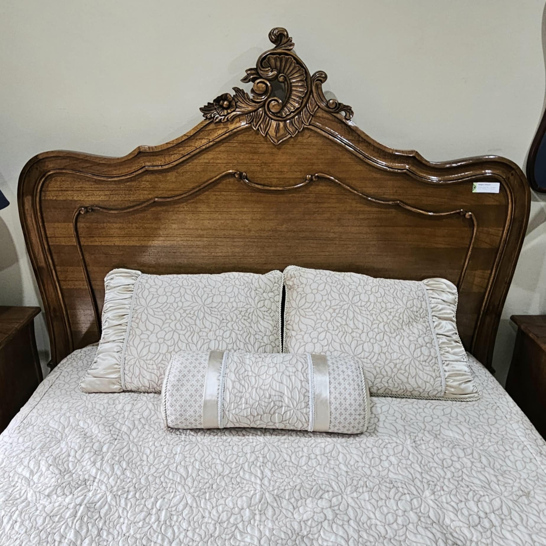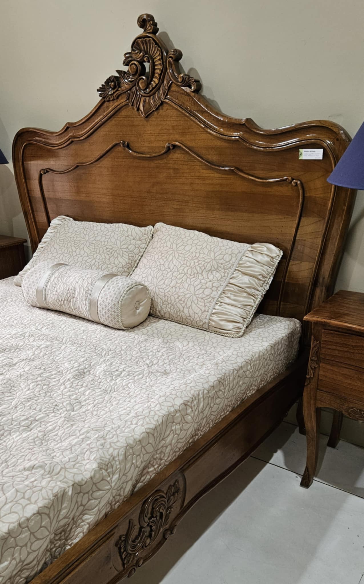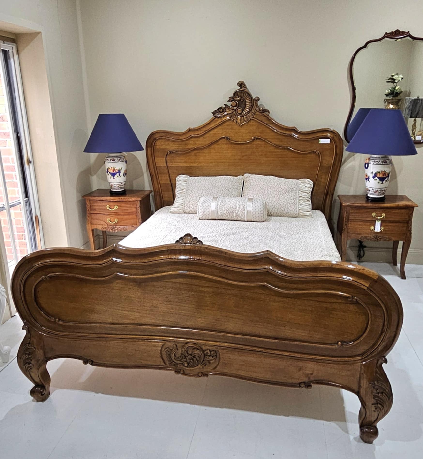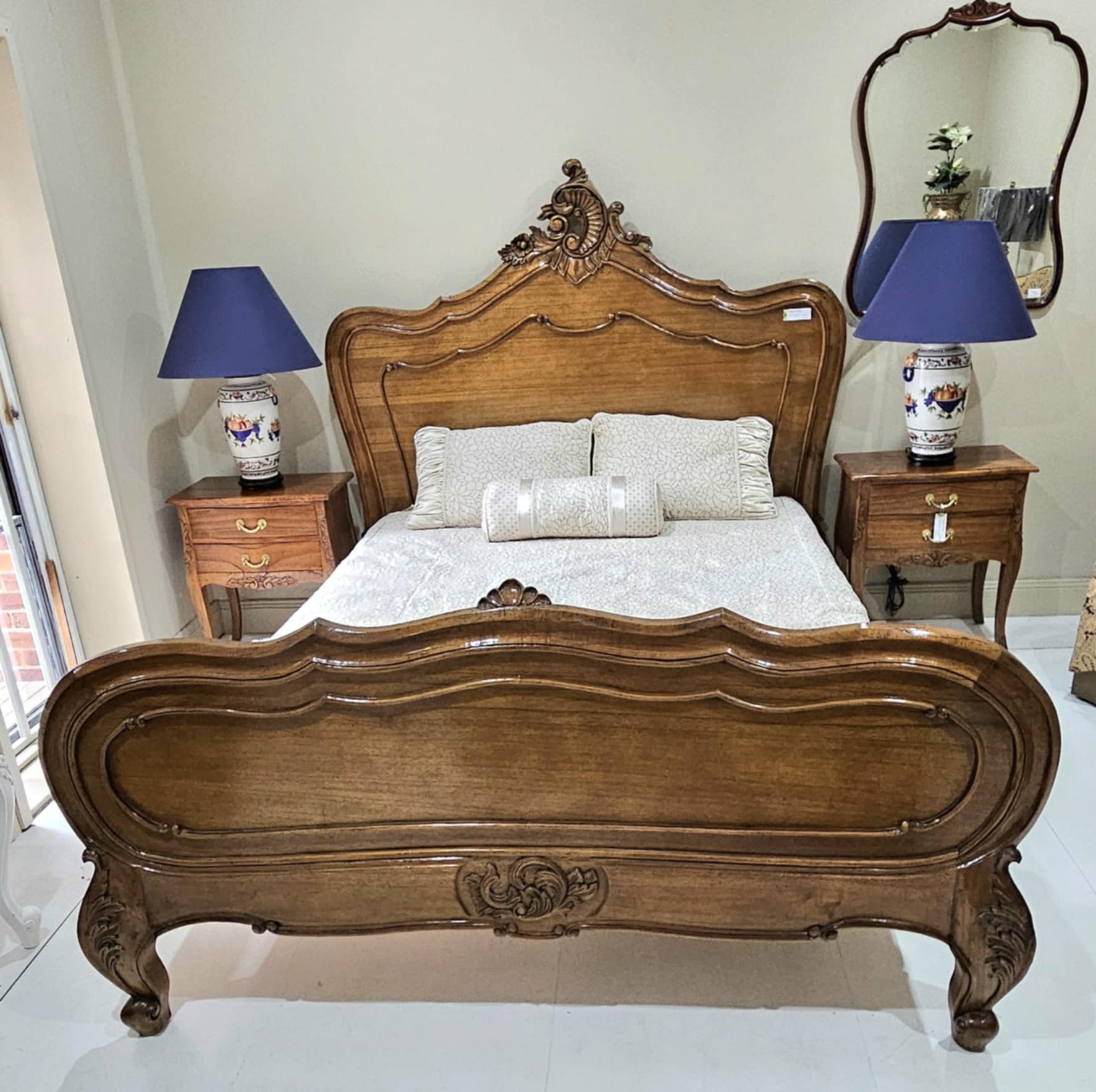 Quality handcrafted Queen size solid timber French style bed with carved decoration. Slat base.