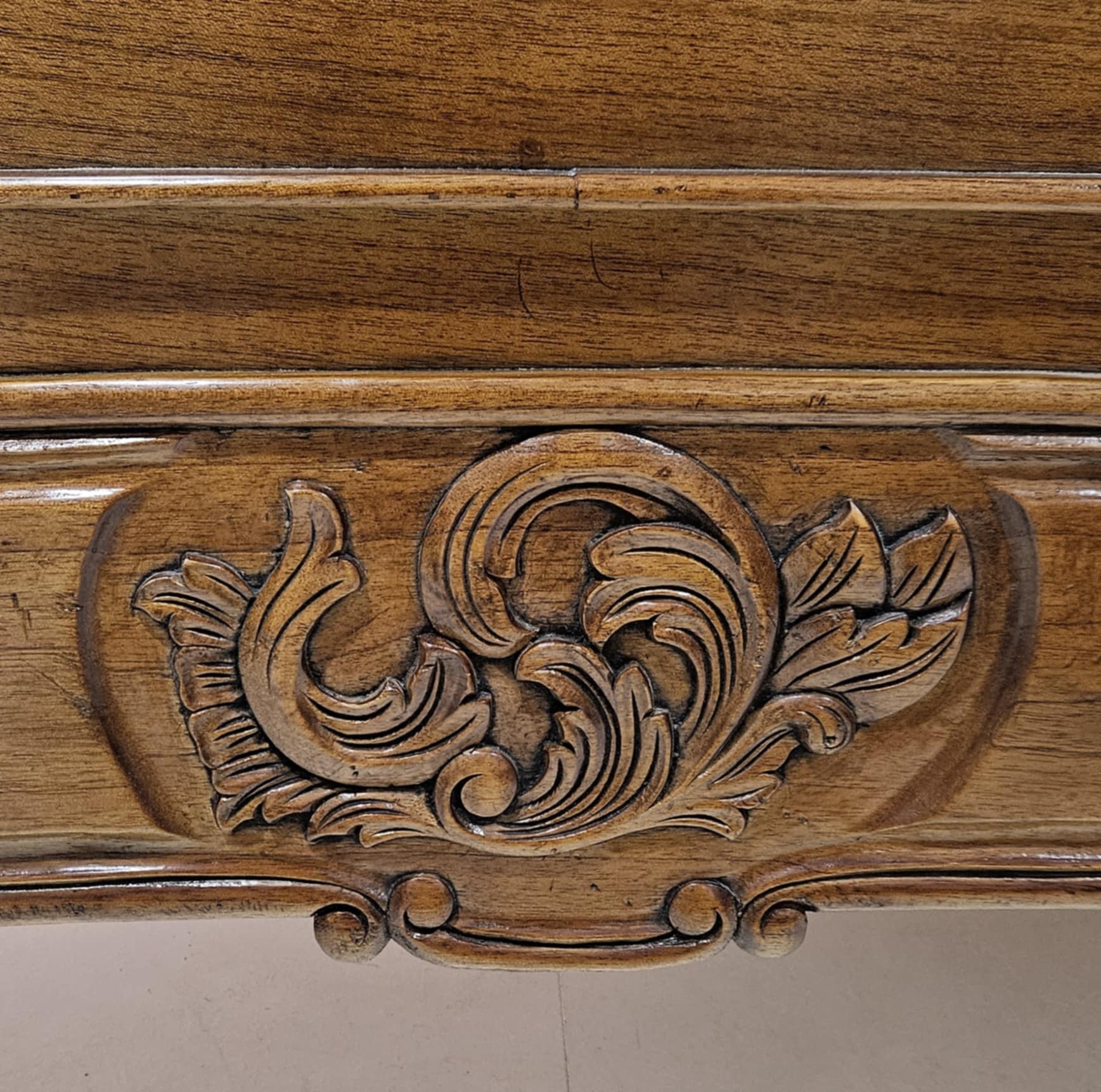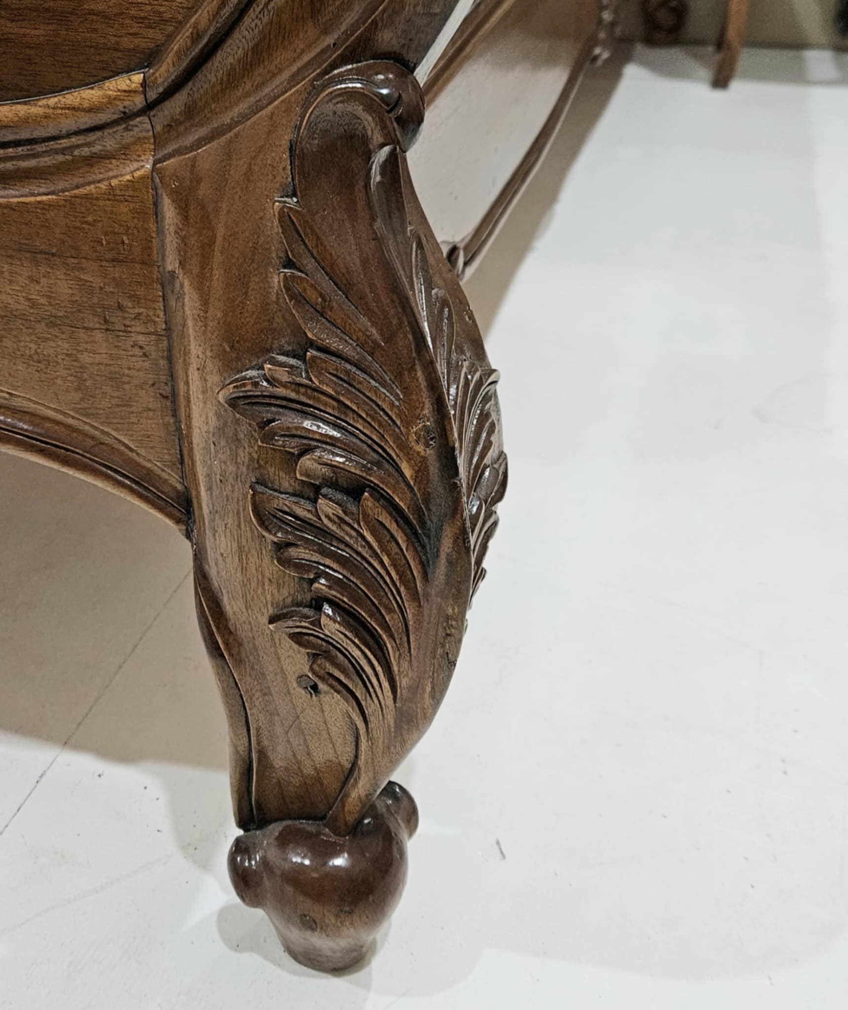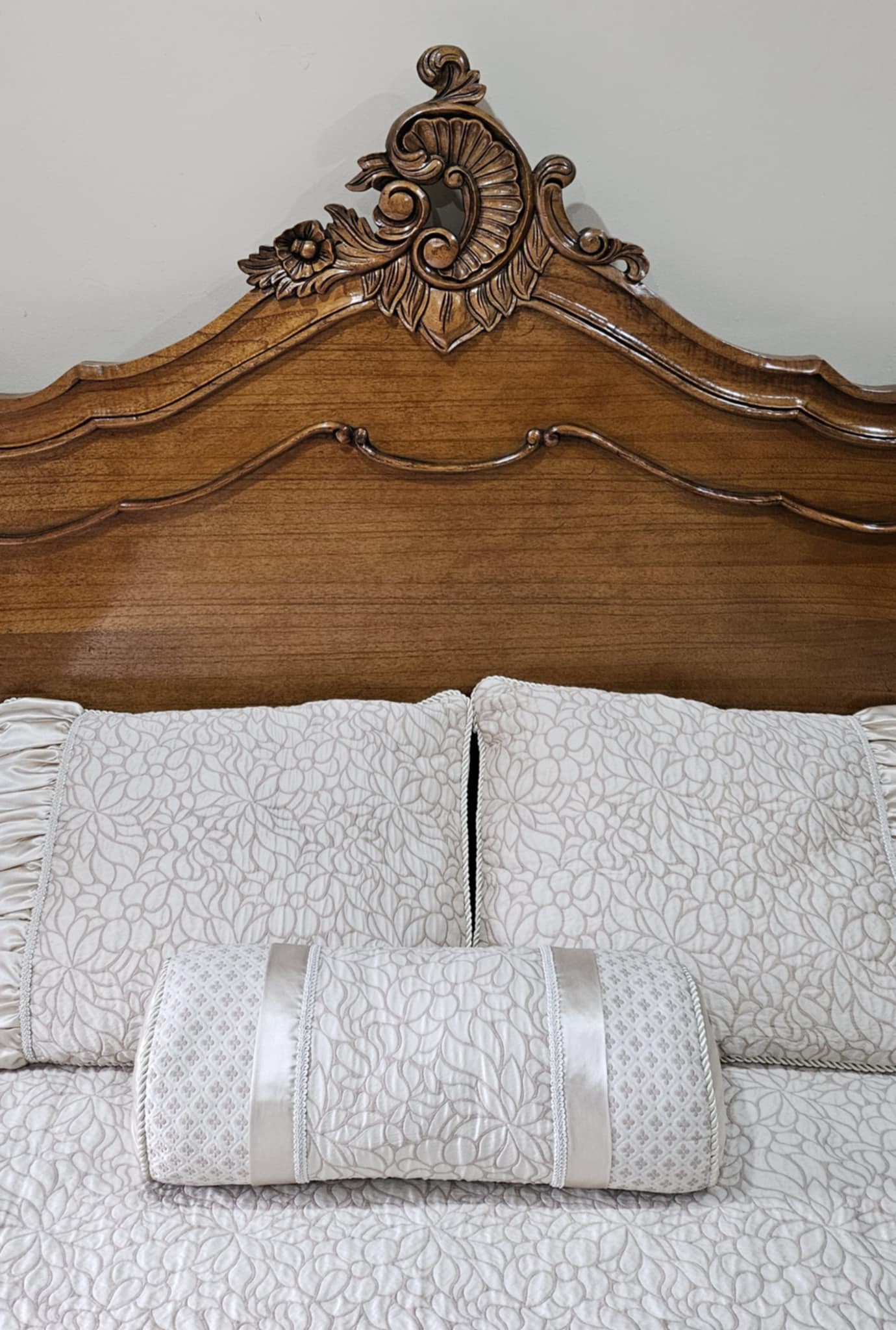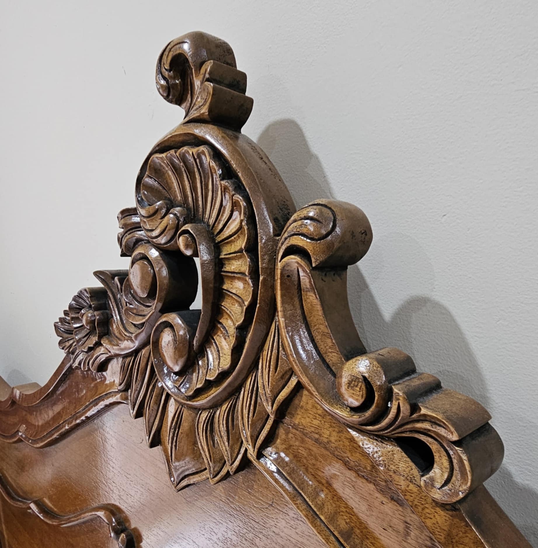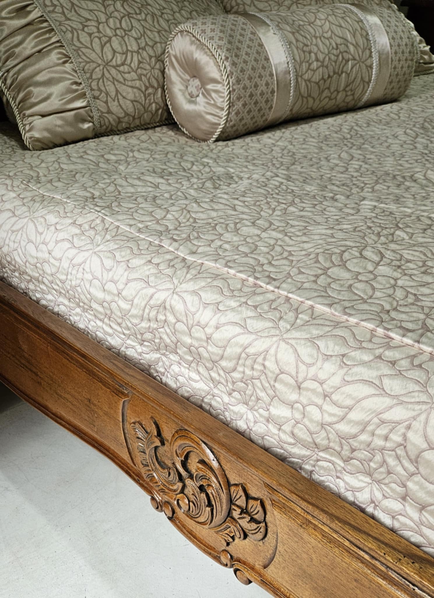 Quality handcrafted Queen size solid timber French style bed with carved decoration. Slat base.