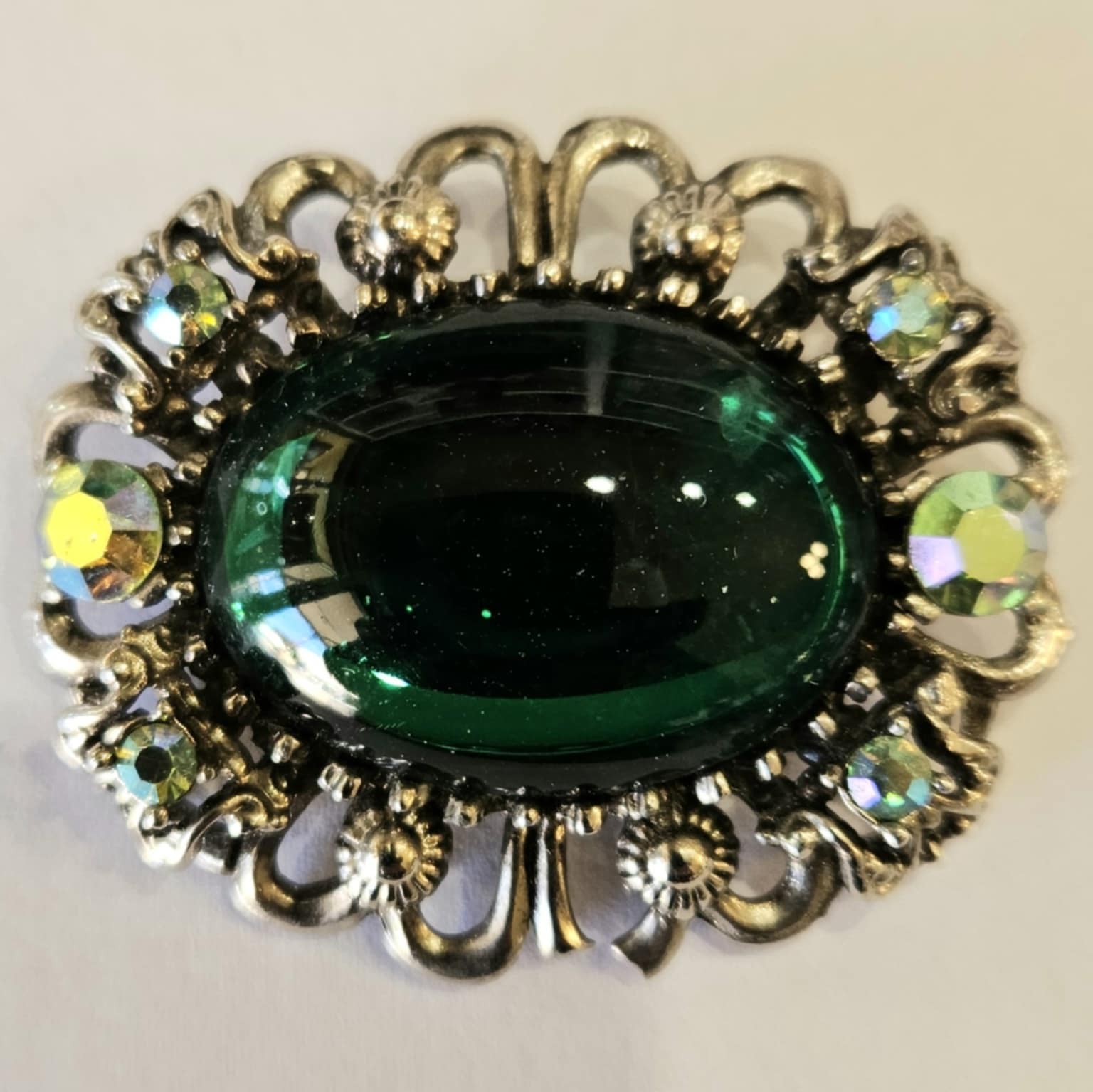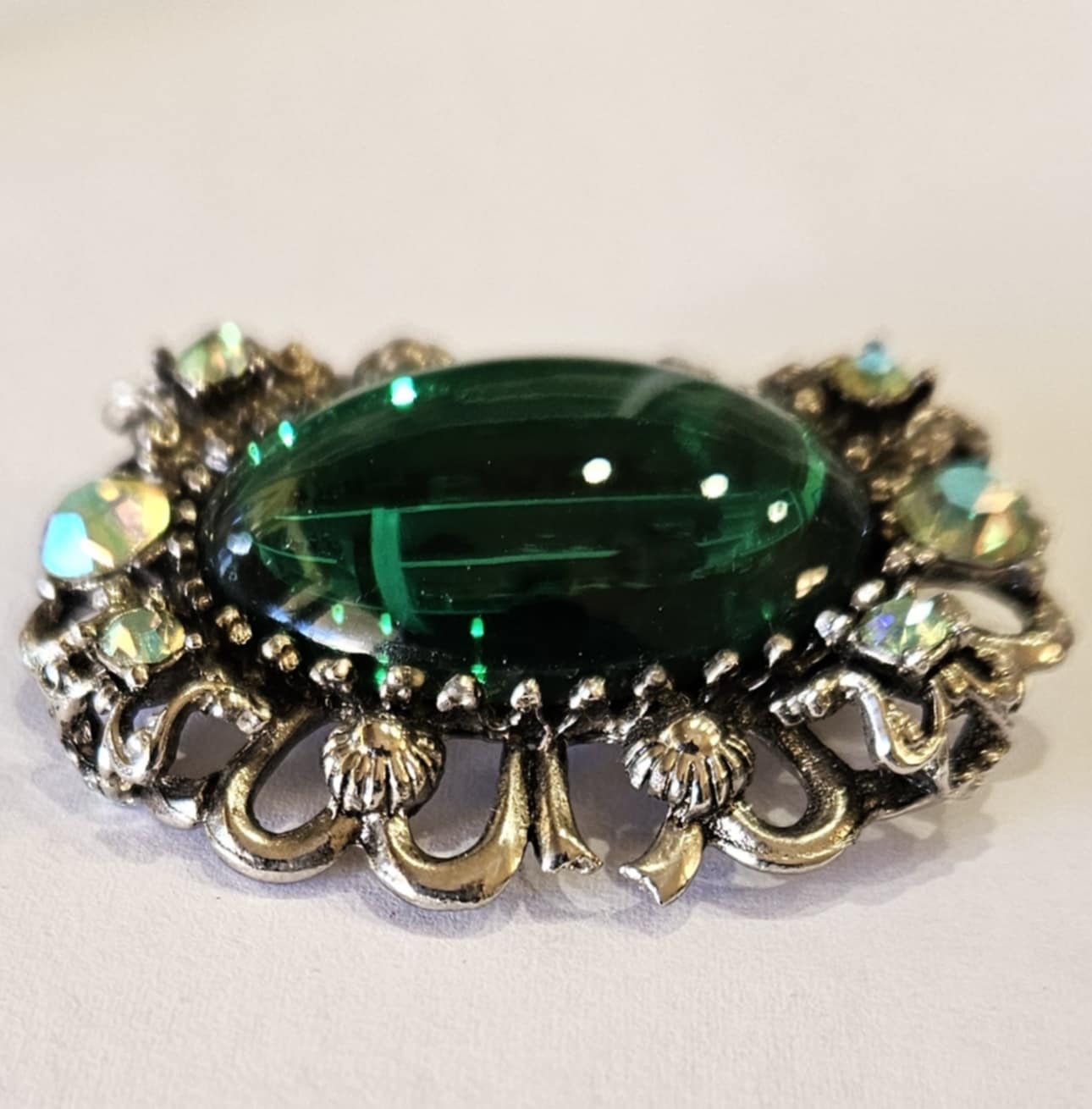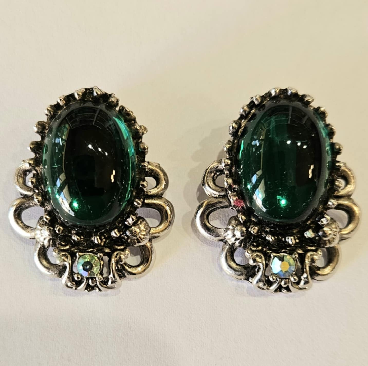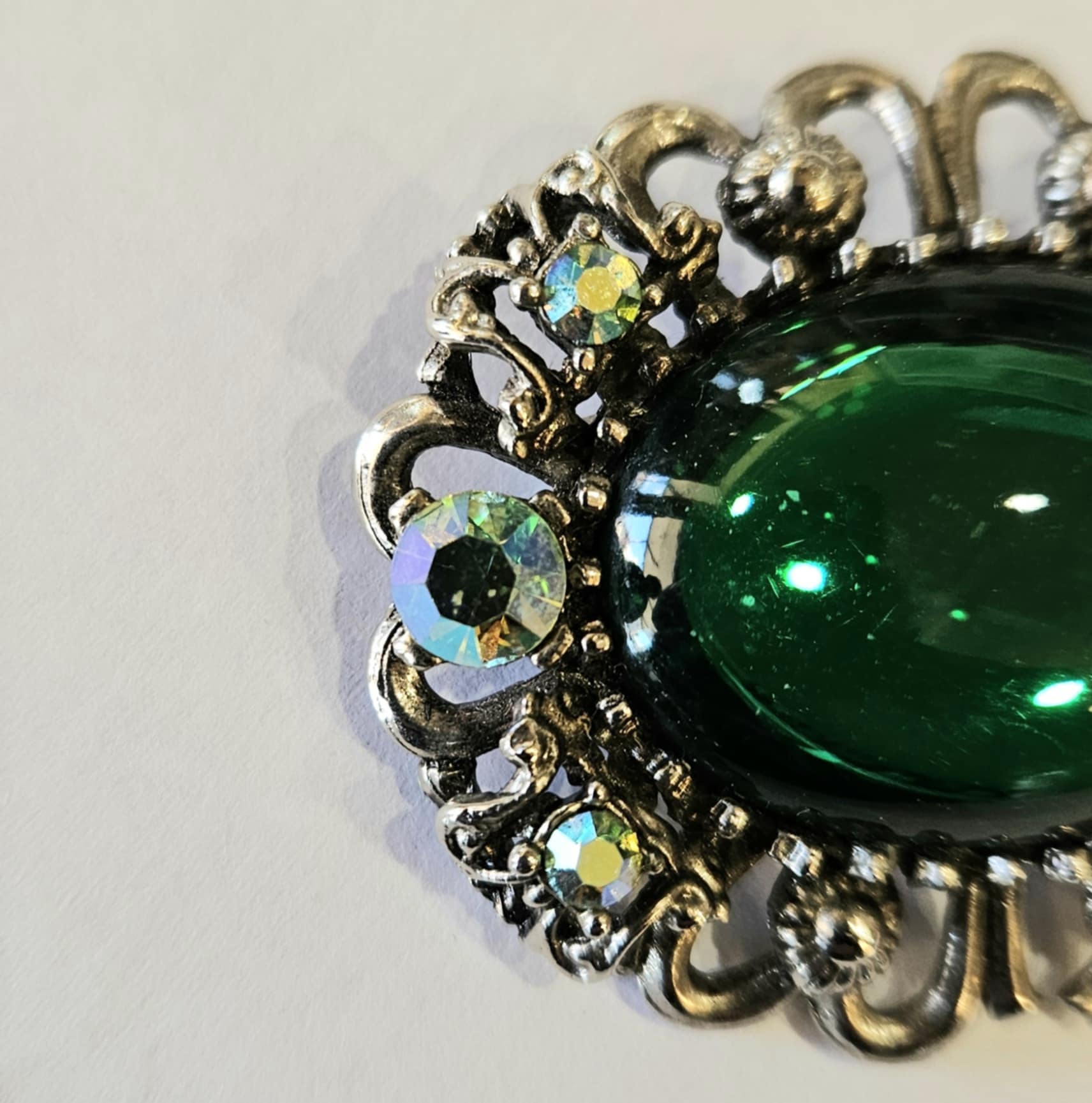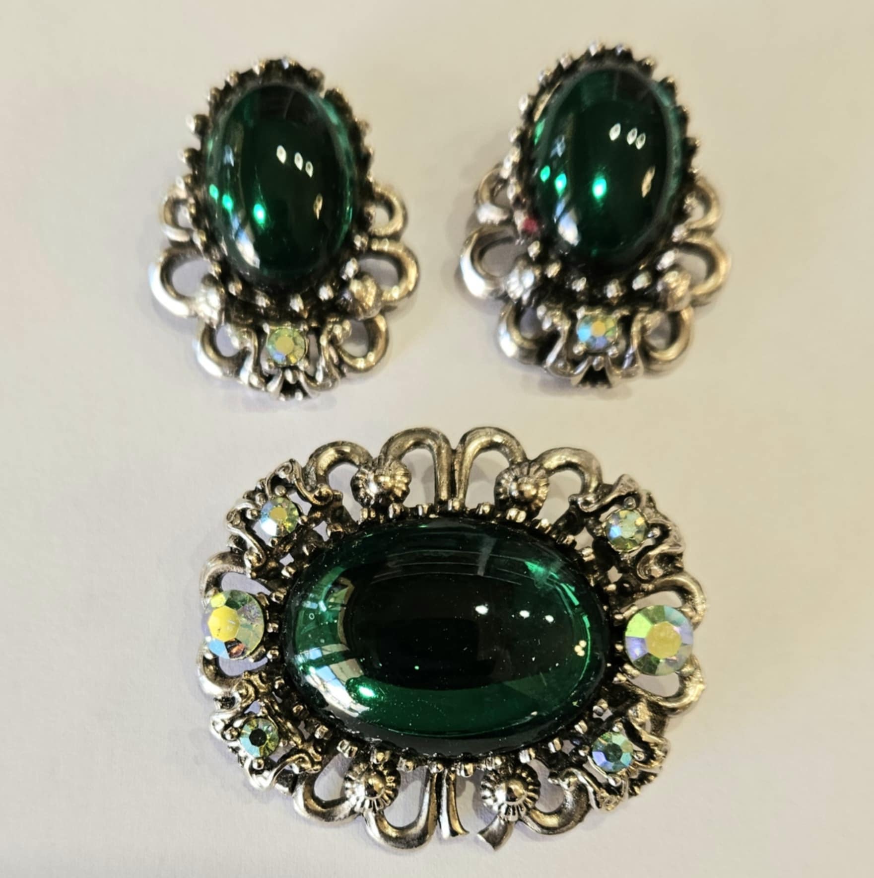 Vintage Australian made Goldcrest matching silver tone brooch with a deep emerald green glass oval stone to the centre surrounded by citrene coloured diamontes. Also includes matching clip on earrings. Marked to the back Goldcrest and pattern number 1110 on the brooch and 1109 on the earrings.