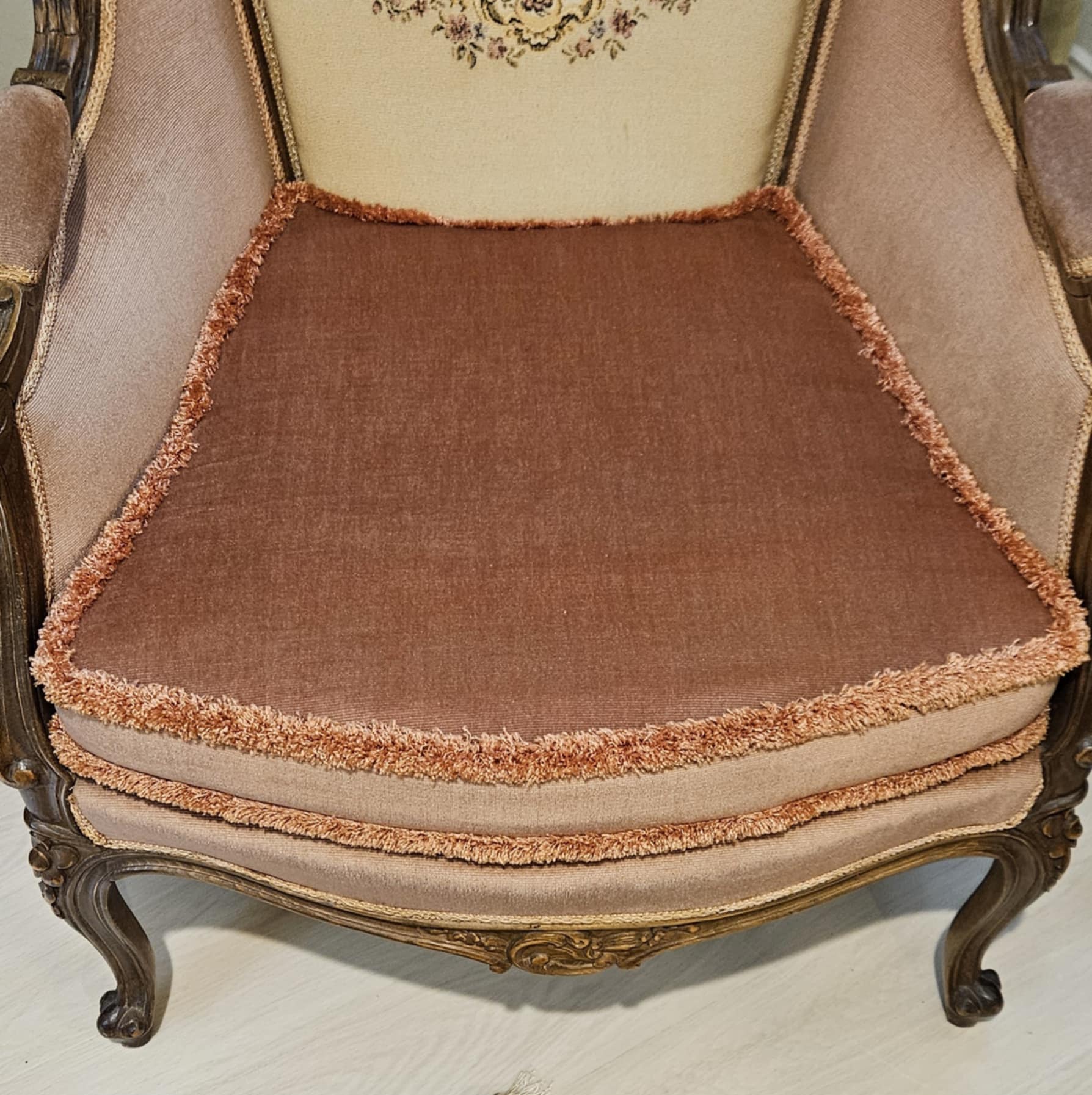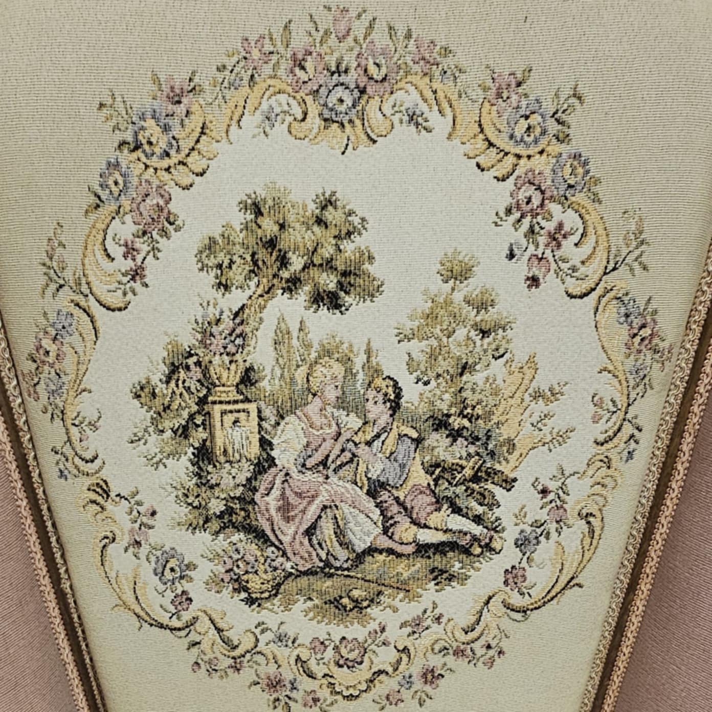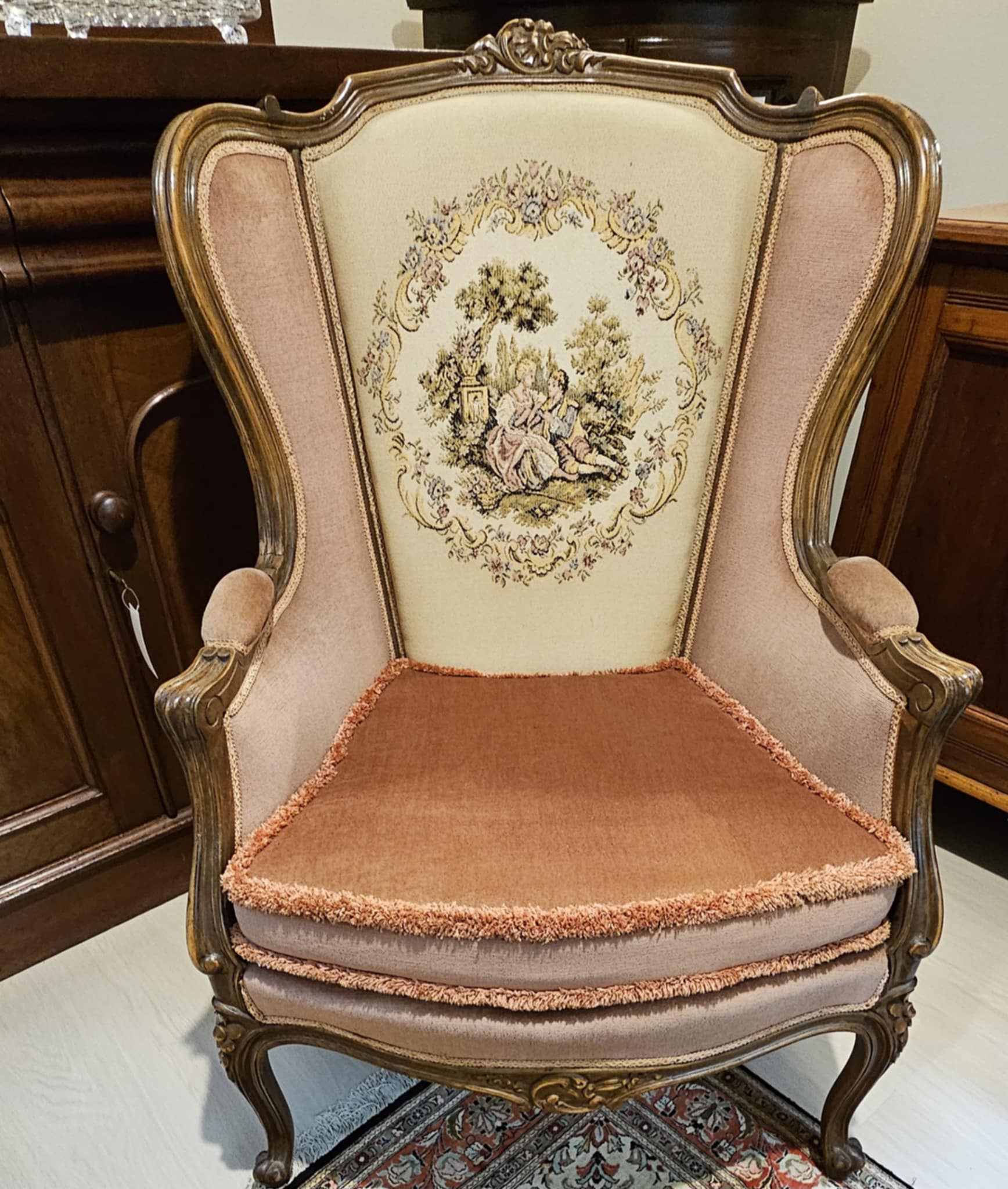 Italian walnut carved wingback armchair, classical patterned tapestry upholstered central panel to the back with tufted base cushion.