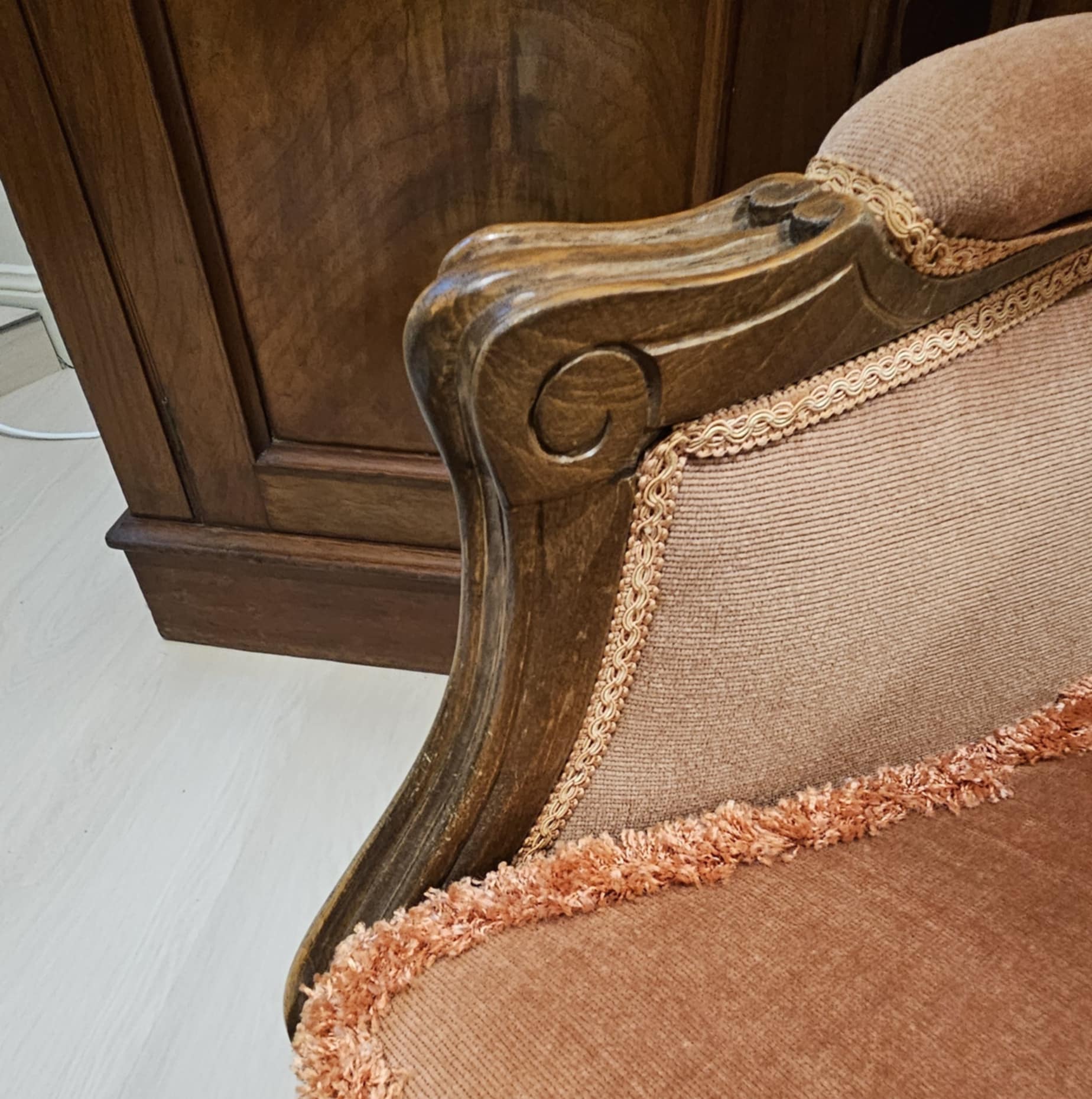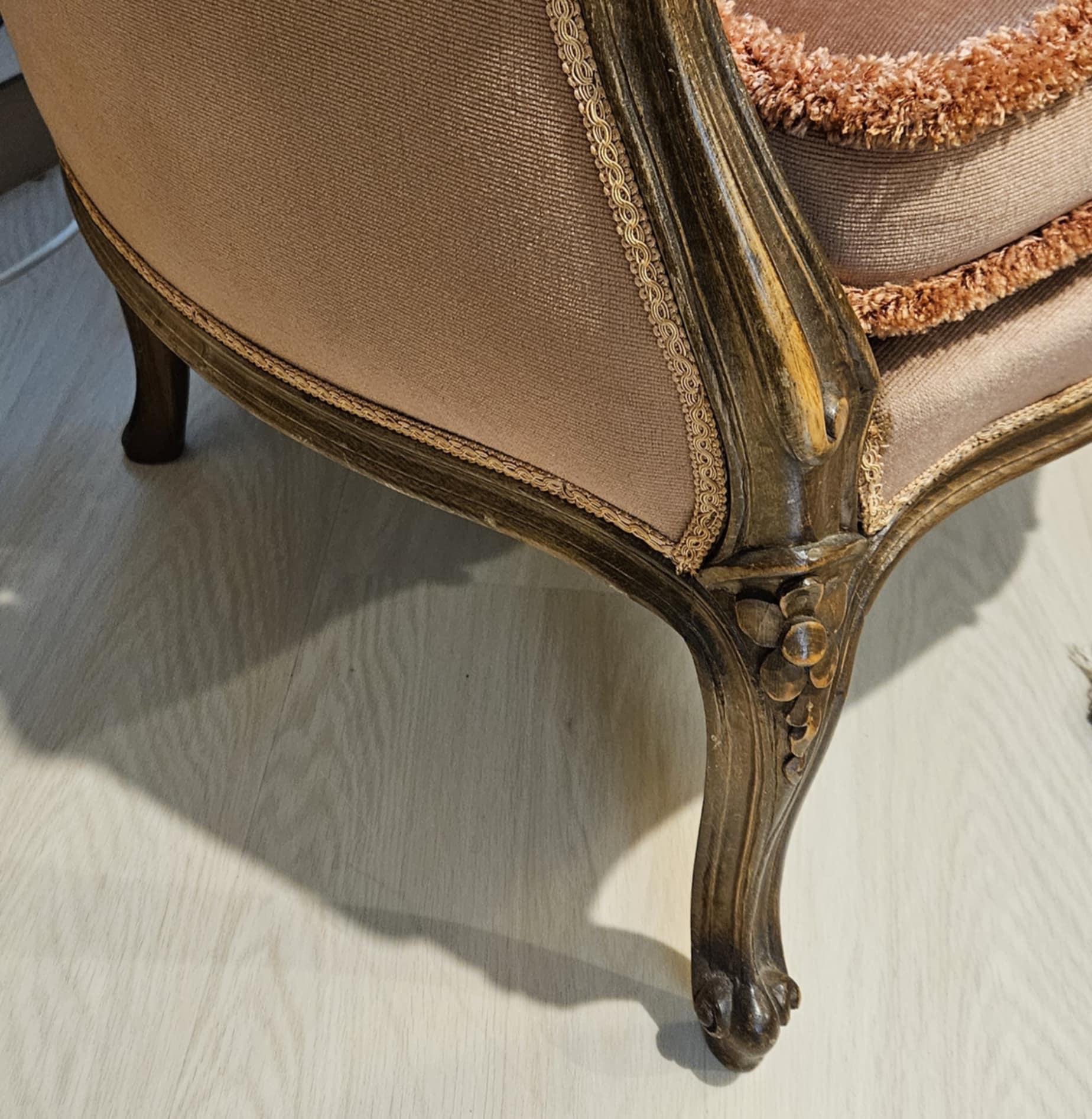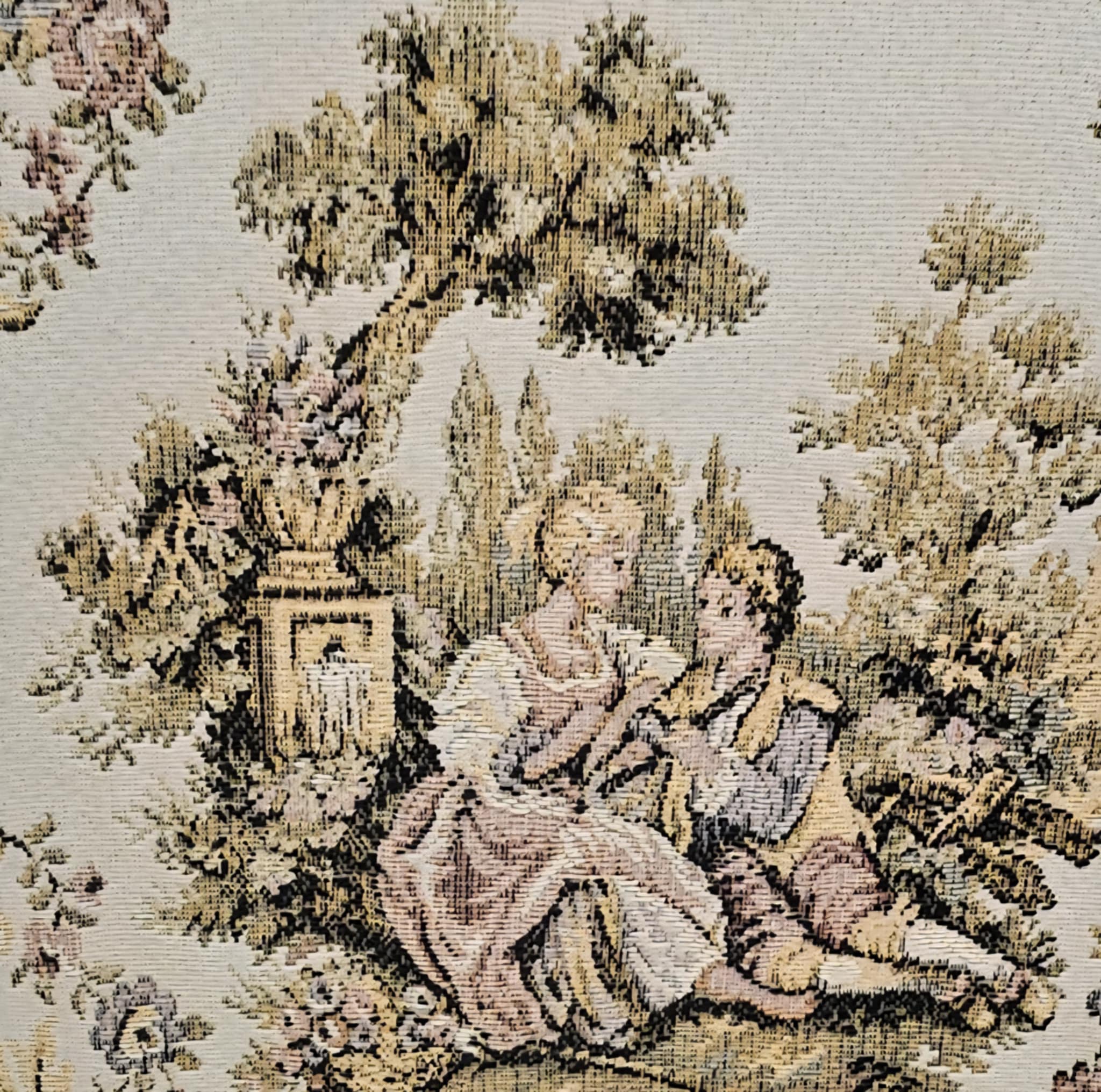 Italian walnut carved wingback armchair, classical patterned tapestry upholstered central panel to the back with tufted base cushion.