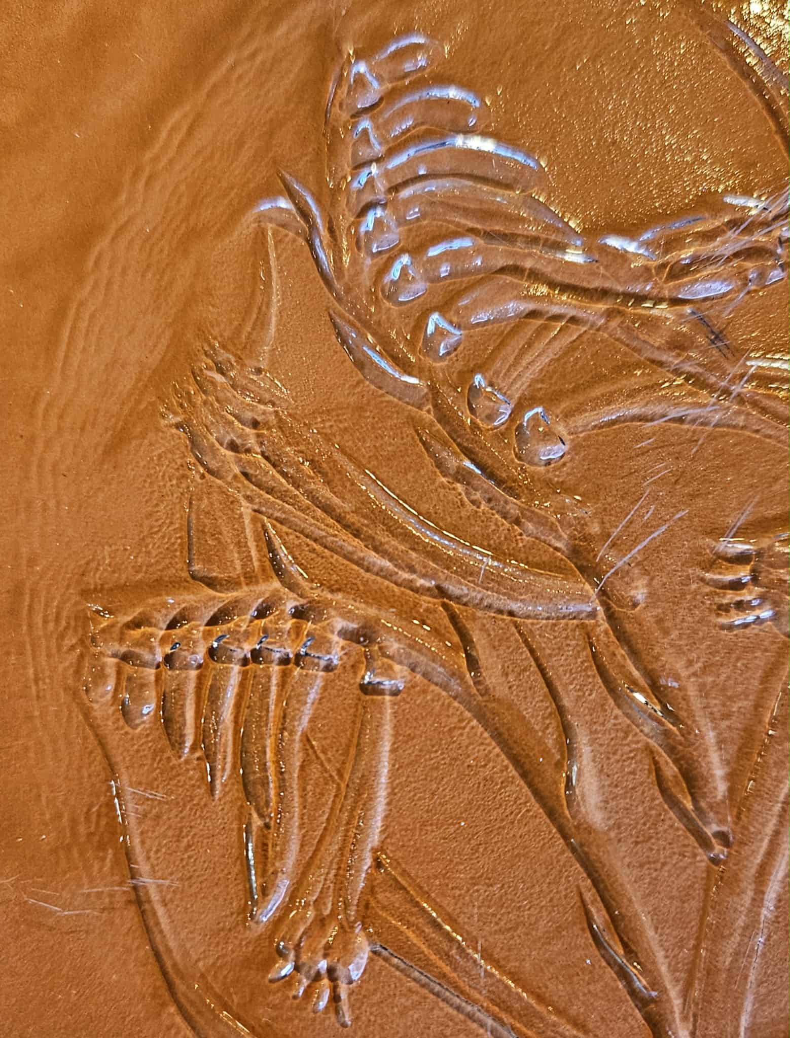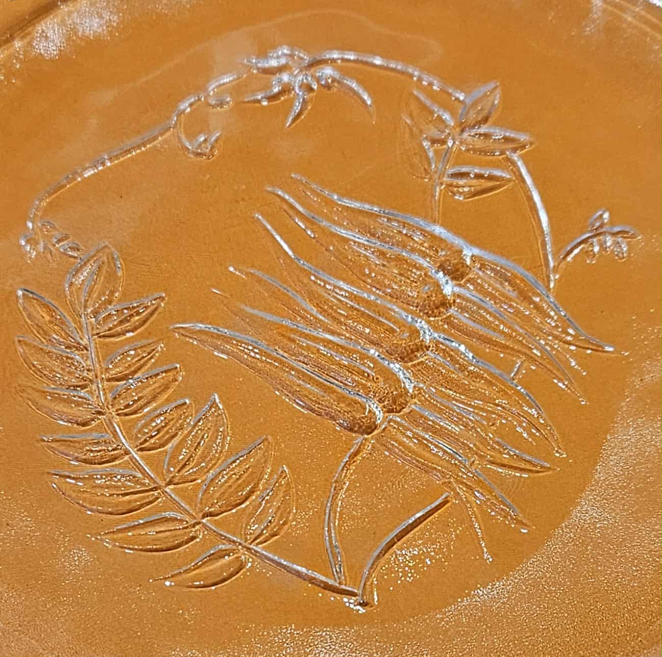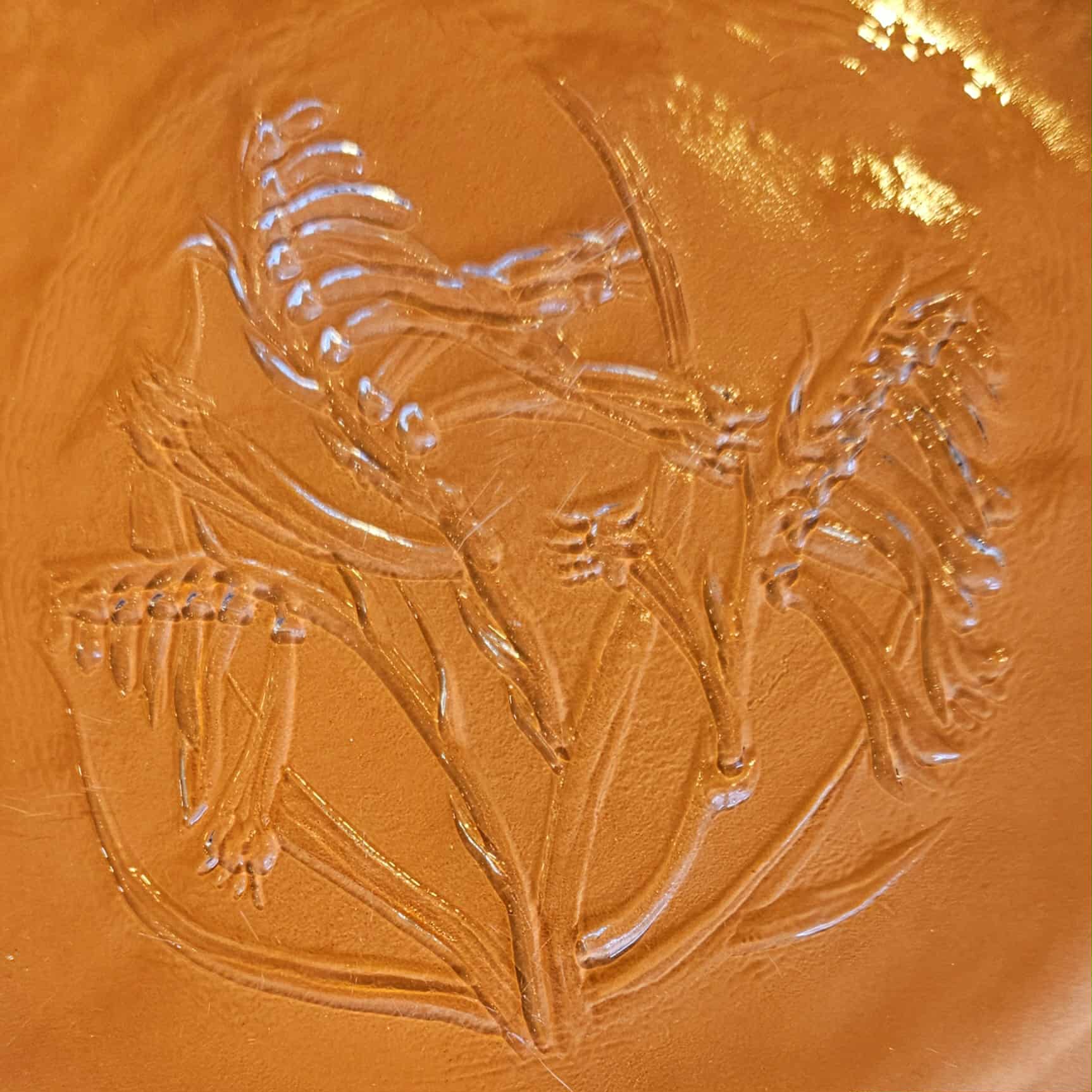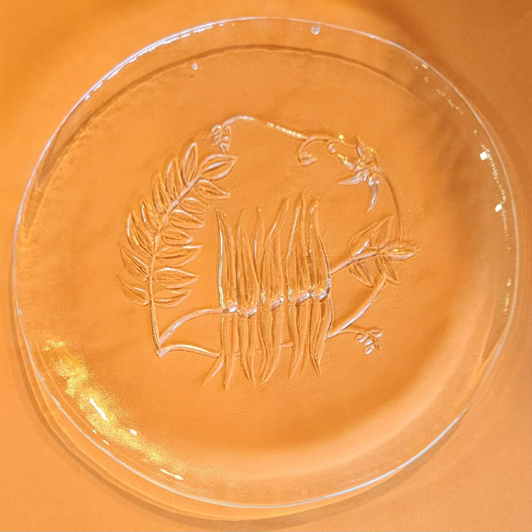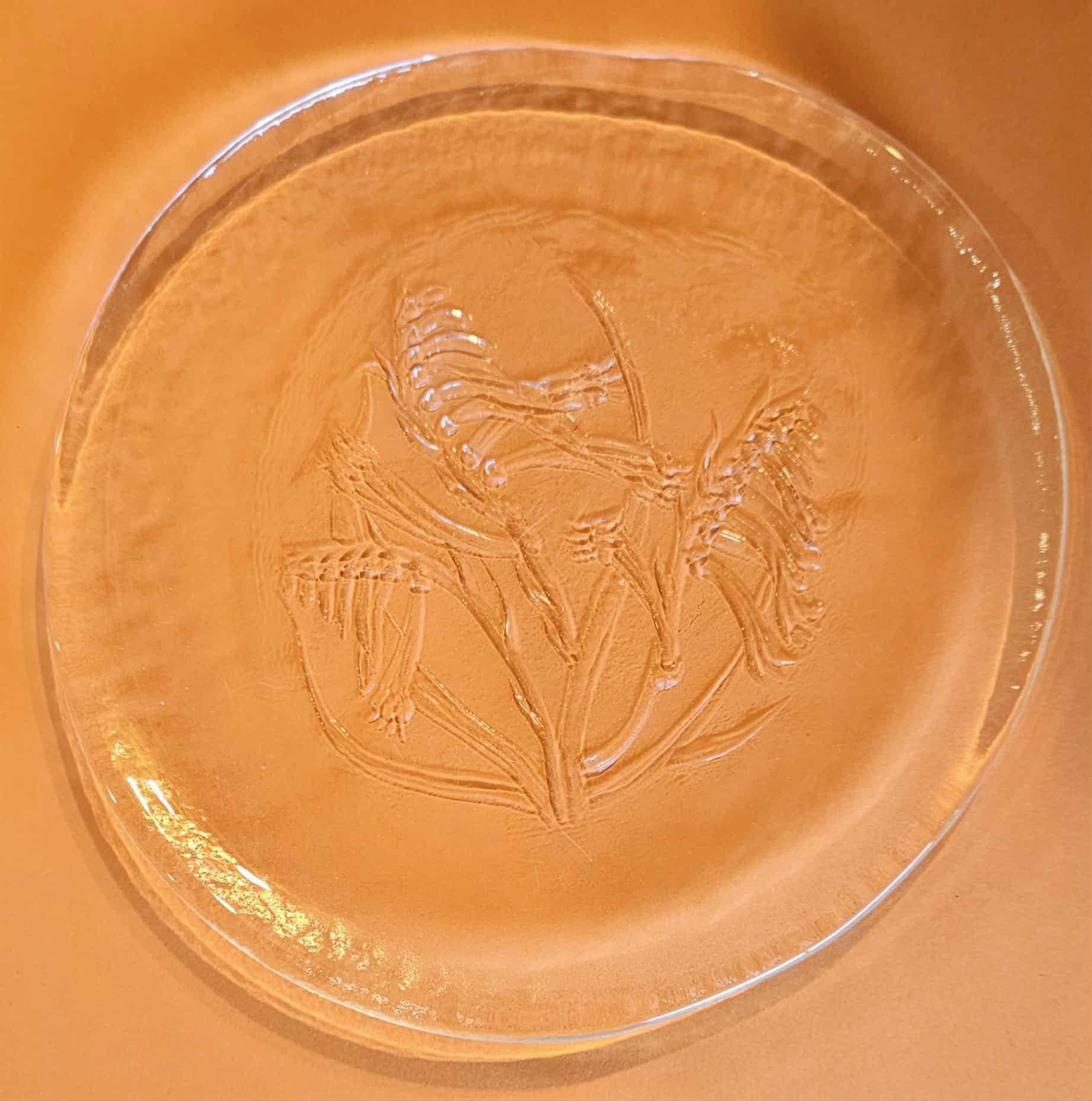 Handmade rough cast pressed glass plates made by Leonora glassworks in Newcastle NSW depicting kangaroo paw Western Australias state flower, and South Australias state flower Sturt’s desert pea.