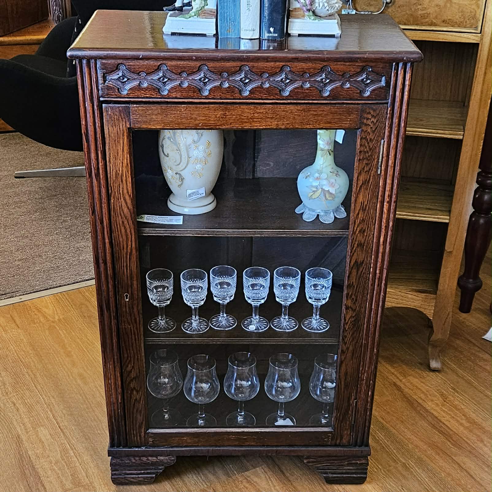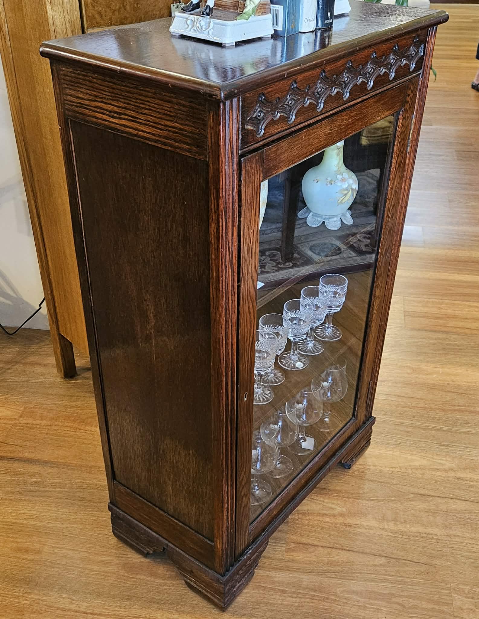 Small English oak glass door display cabinet suitable for liquor cabinet cocktail bar, bookcase or china cabinet display case of pleasing proportions. Hand carved decorative frieze to the front