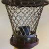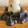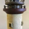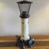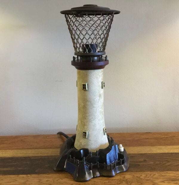 Retro lighthouse lamp made in Australia by FH & FR West, Highett Victoria. The lamp is an early version in good original working condition with the tower in a stone look finish, usually they are anodized aluminium. The cast metal base has the pathway with safety chains attached.