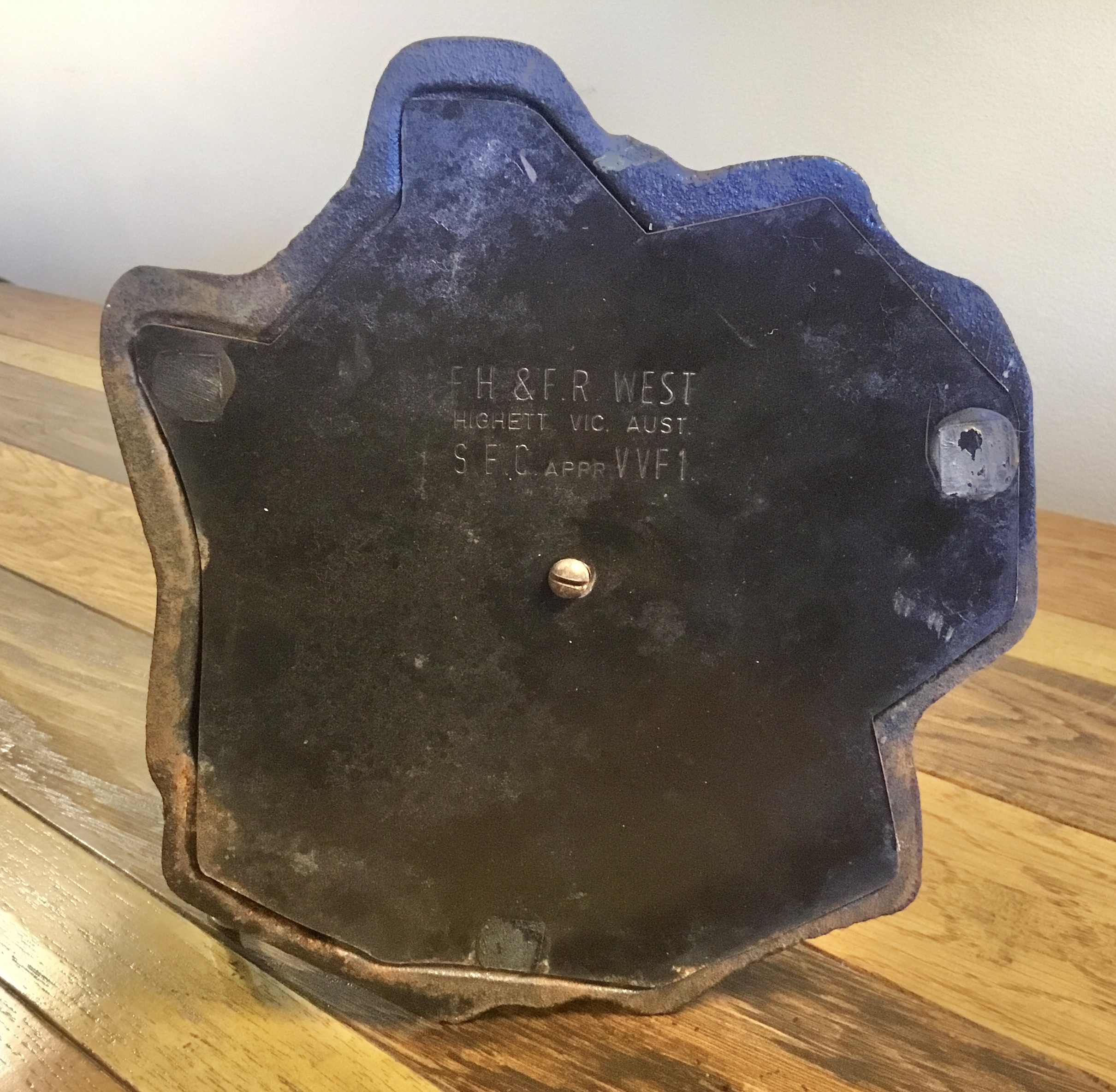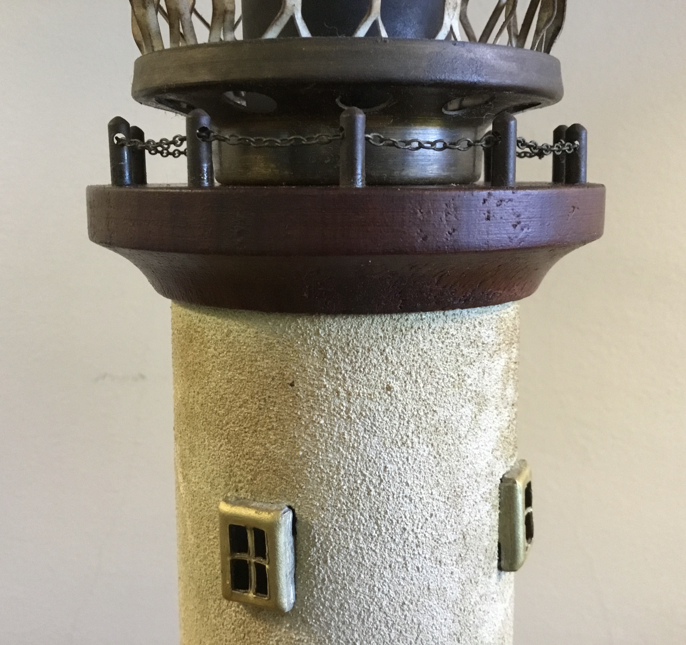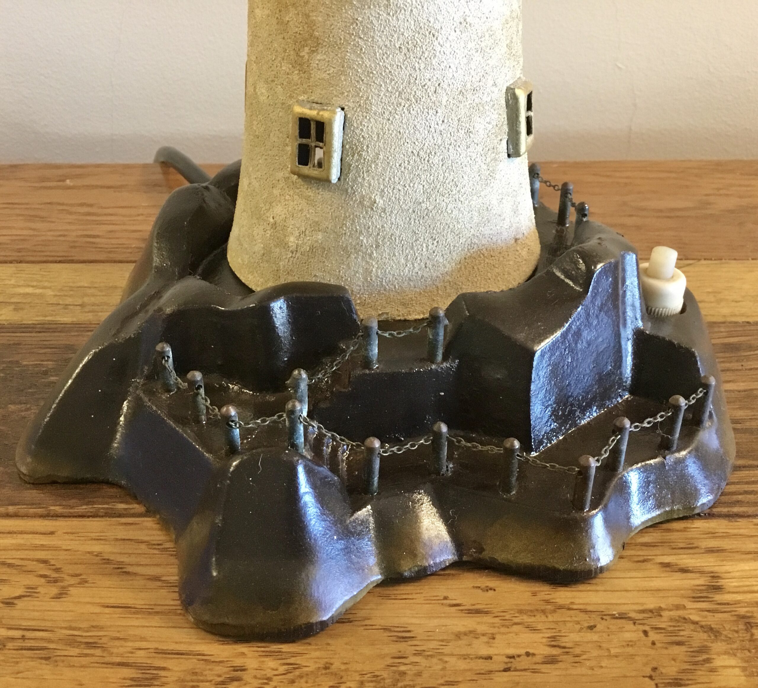 Retro lighthouse lamp made in Australia by FH & FR West, Highett Victoria. The lamp is an early version in good original working condition with the tower in a stone look finish, usually they are anodized aluminium. The cast metal base has the pathway with safety chains attached.