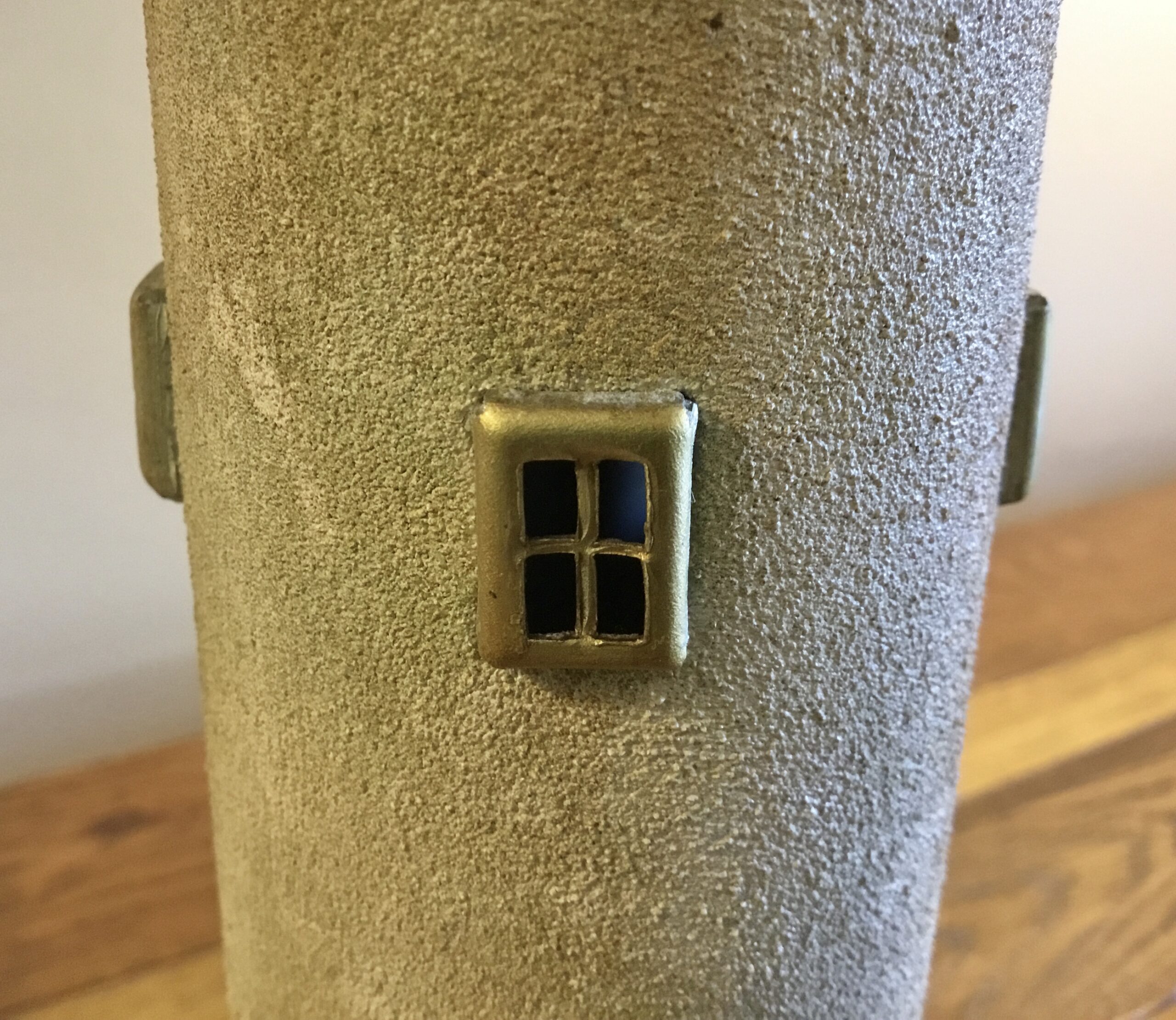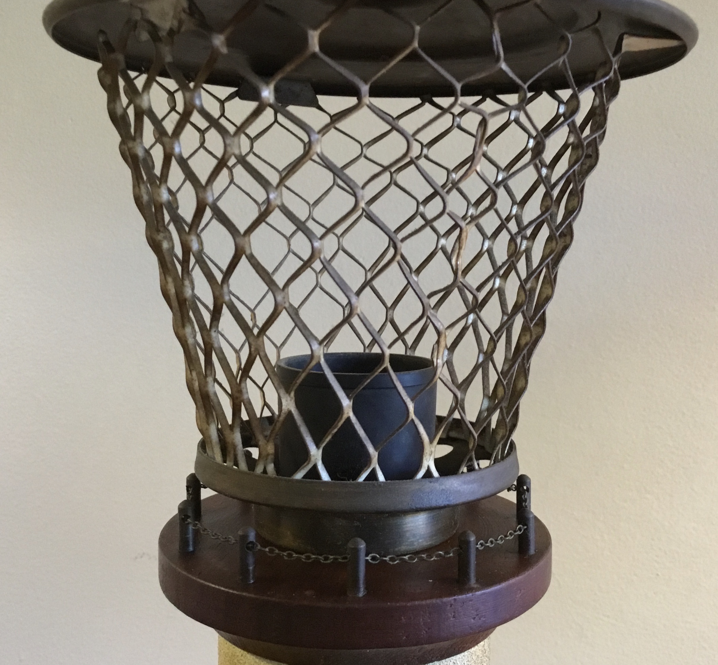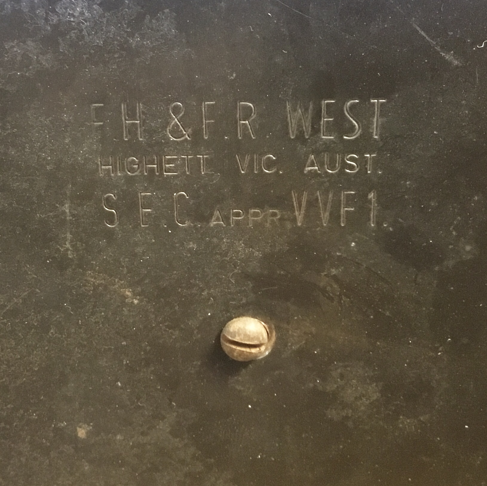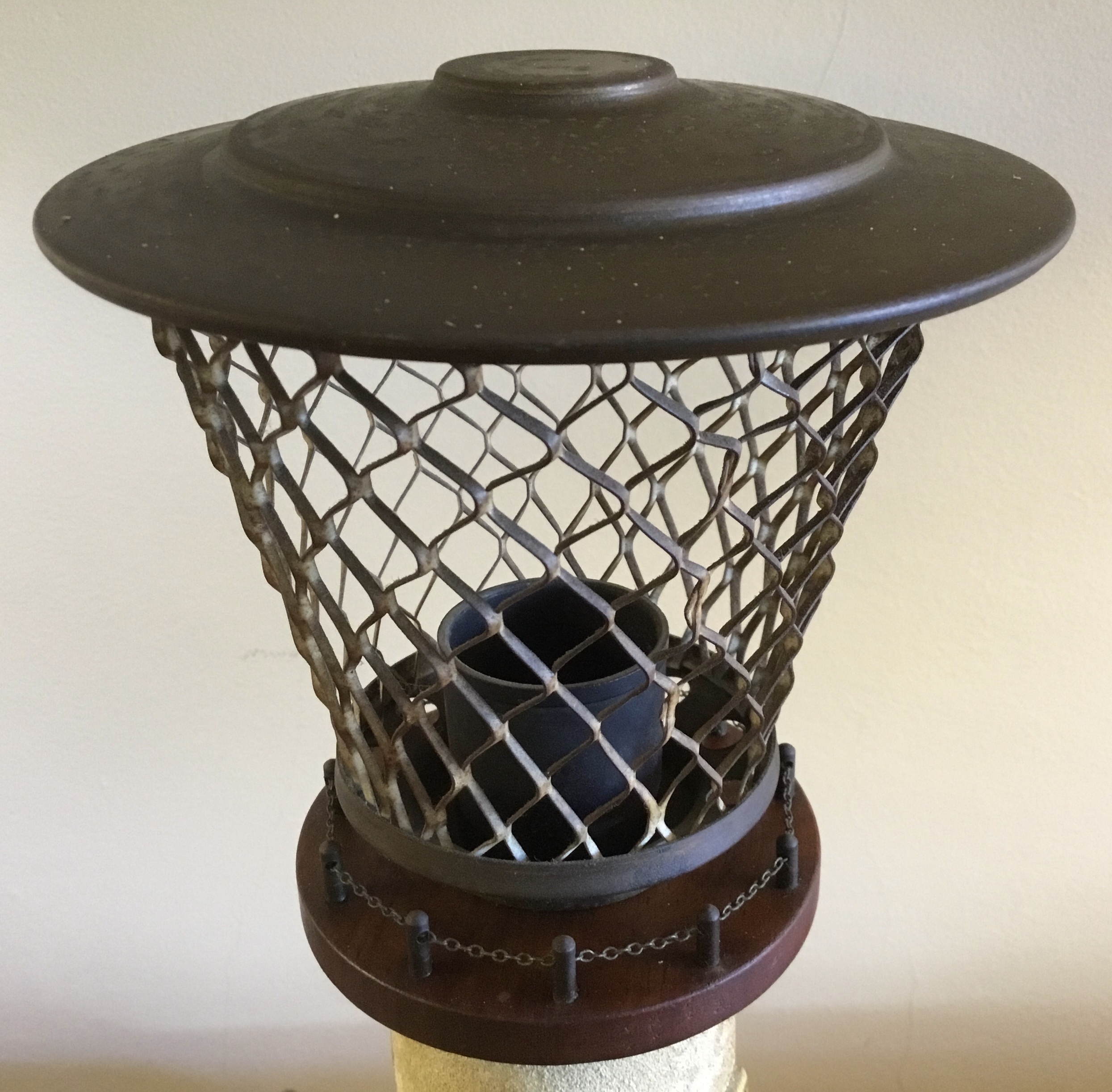 Retro lighthouse lamp made in Australia by FH & FR West, Highett Victoria. The lamp is an early version in good original working condition with the tower in a stone look finish, usually they are anodized aluminium. The cast metal base has the pathway with safety chains attached.