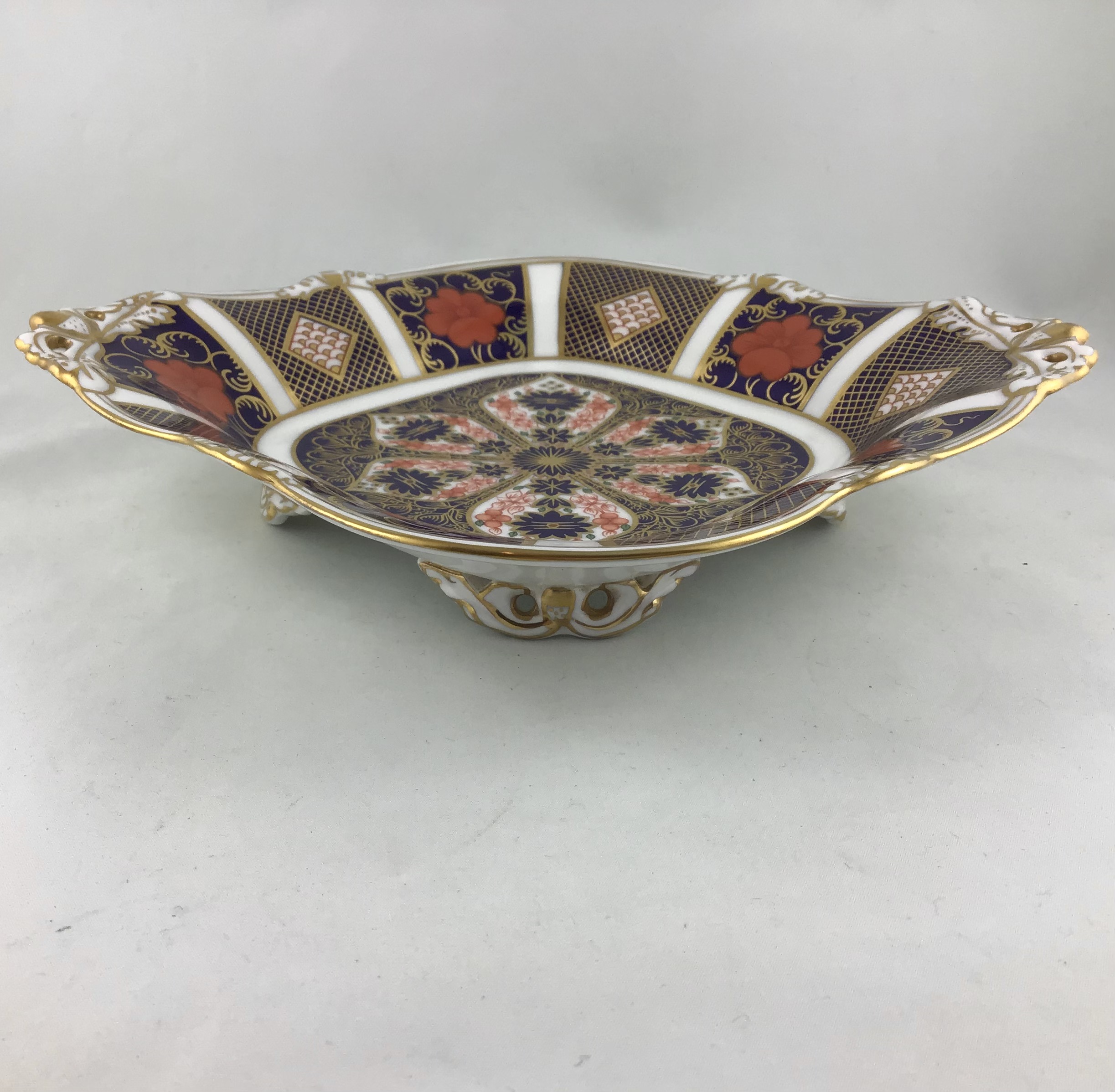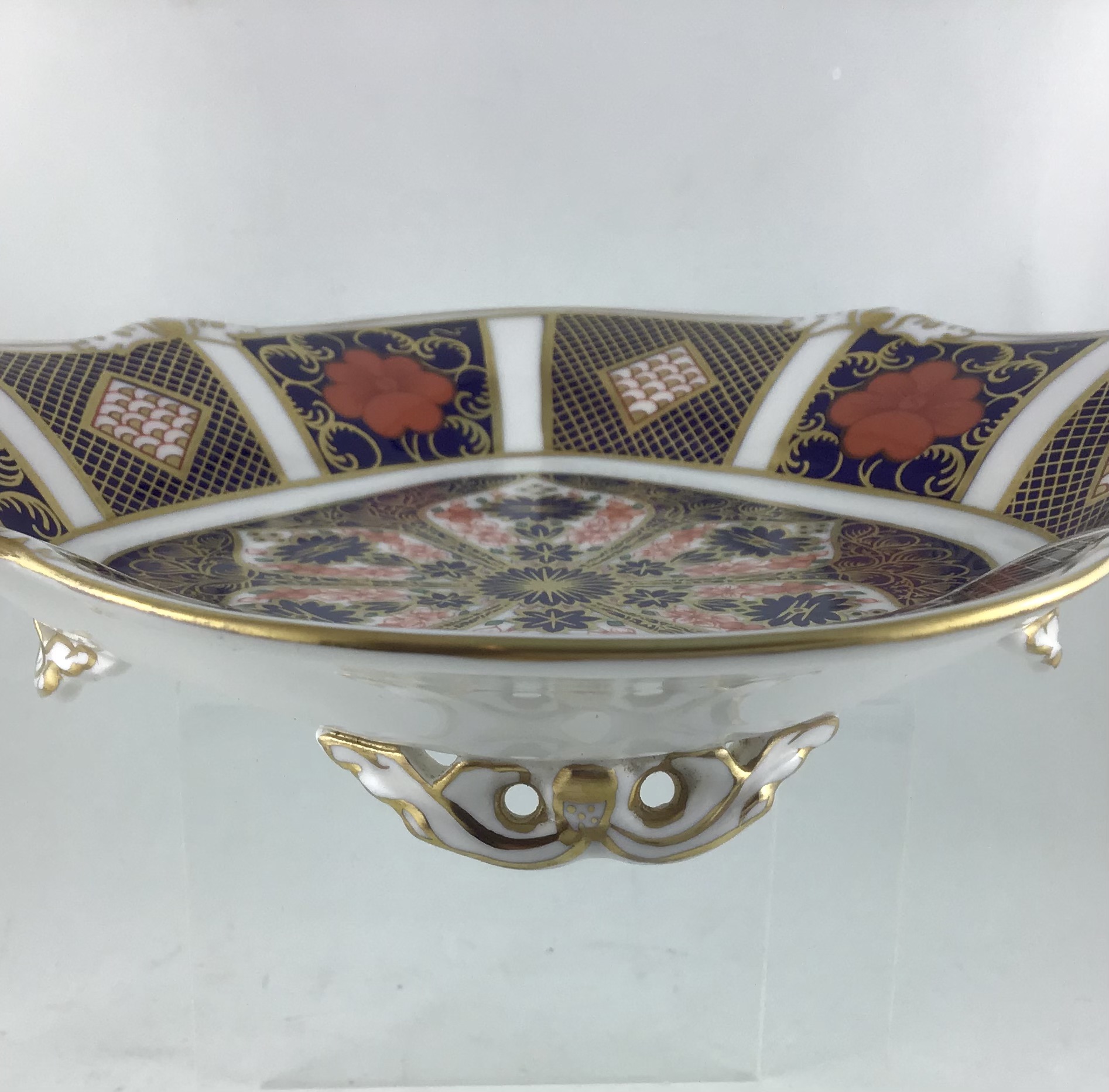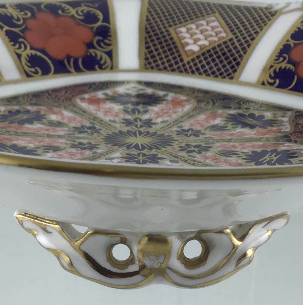 Royal Crown Derby Imari Asian patterned diamond shaped bowl with decorative feet.