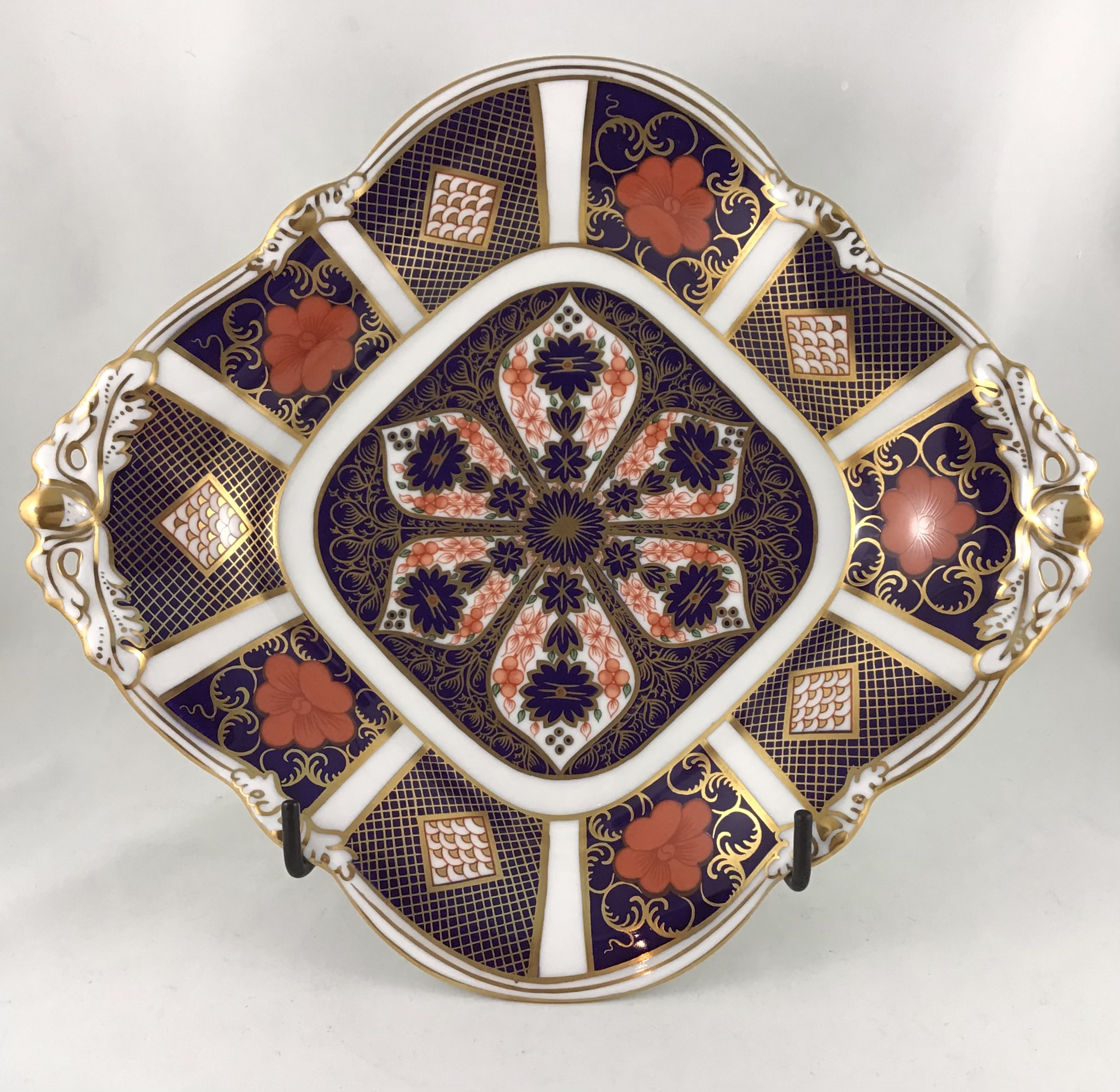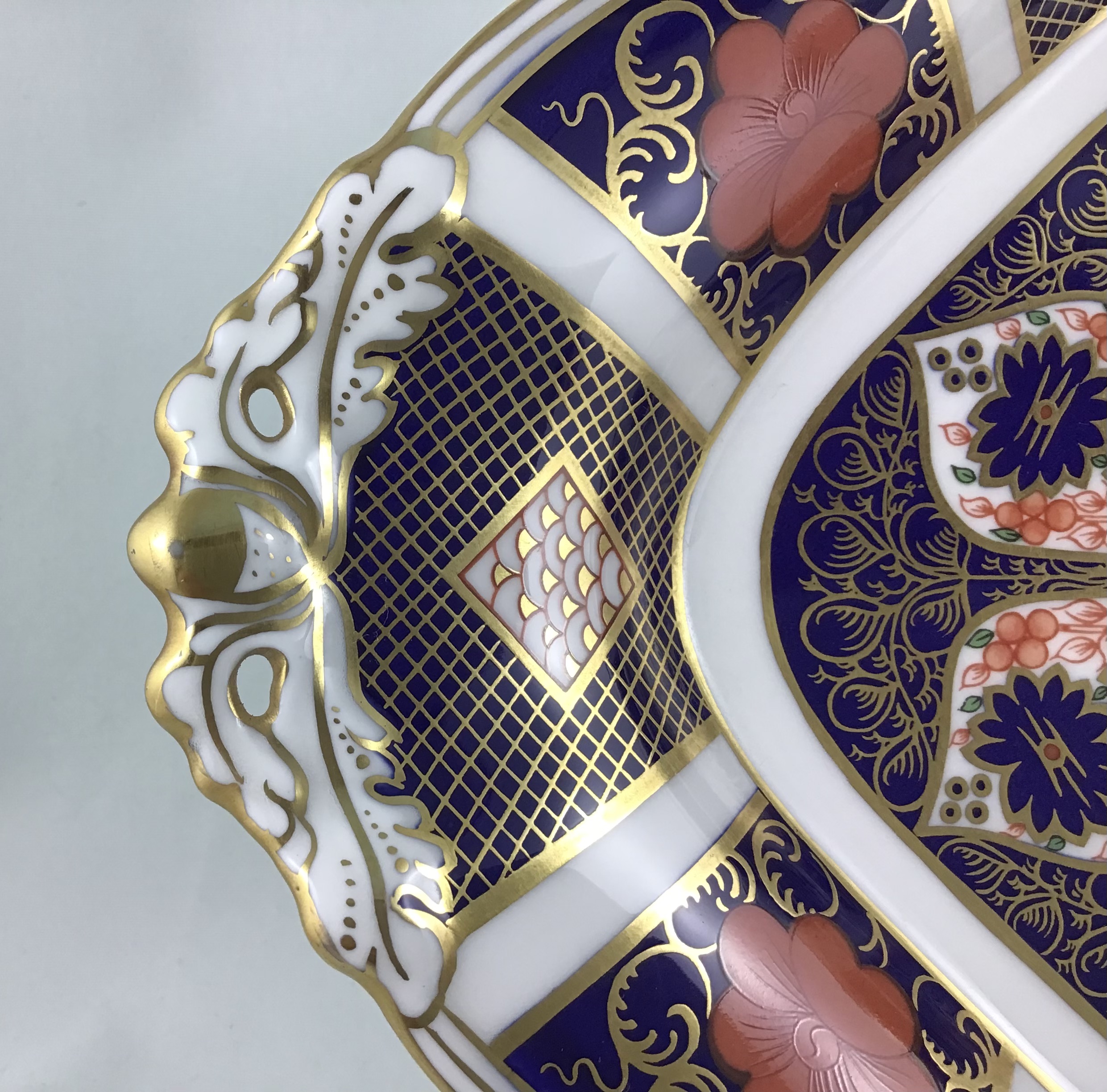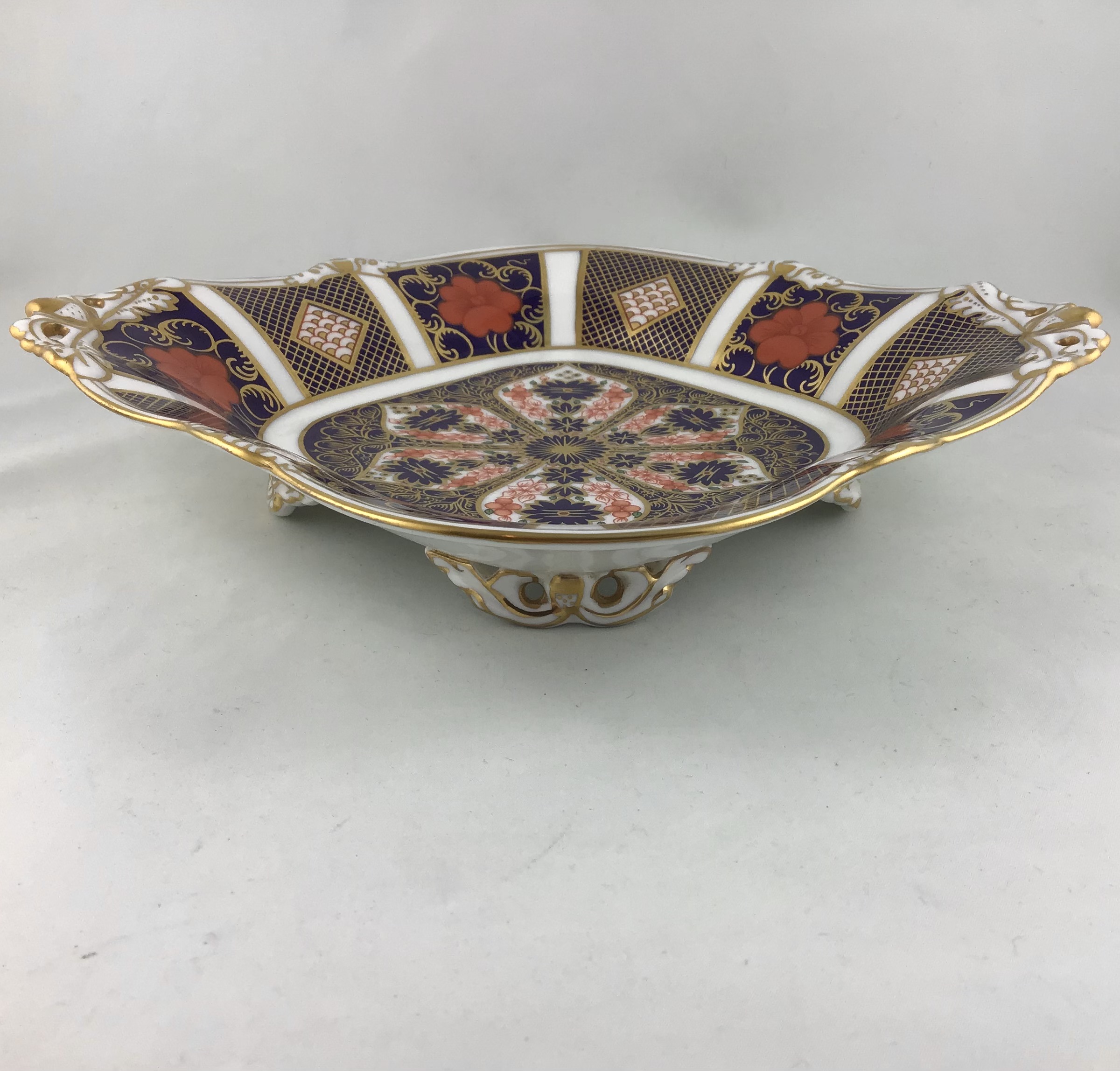 Royal Crown Derby Imari Asian patterned diamond shaped bowl with decorative feet.