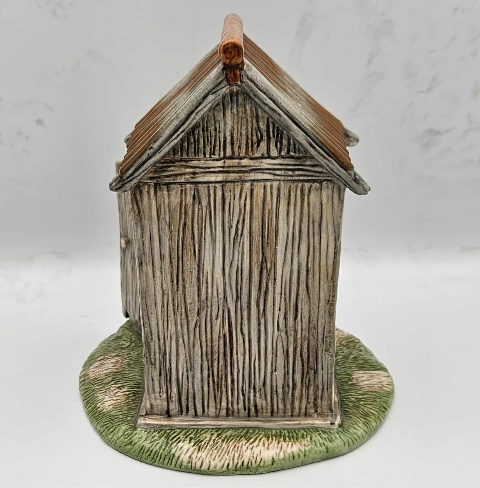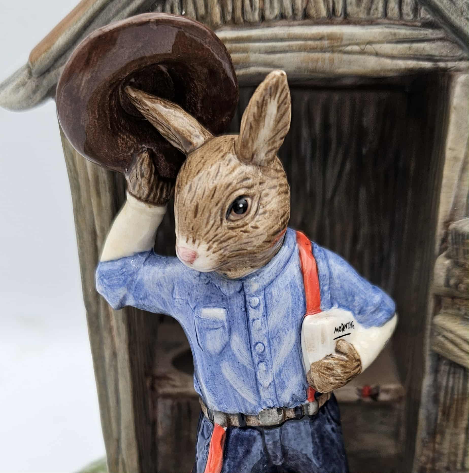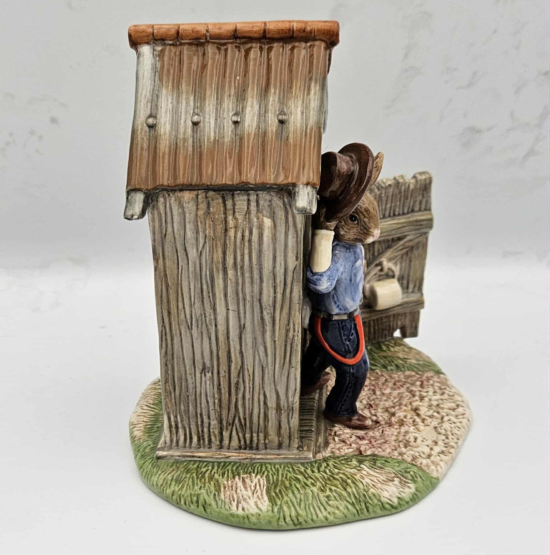 Royal Doulton Australian Outdoor Dunny Bunnykins DB497 commissioned by WWRD Wedgwood Royal Doulton Australia of a Bunnykins emerging from a typical old time outdoor backyard Aussie toilet.