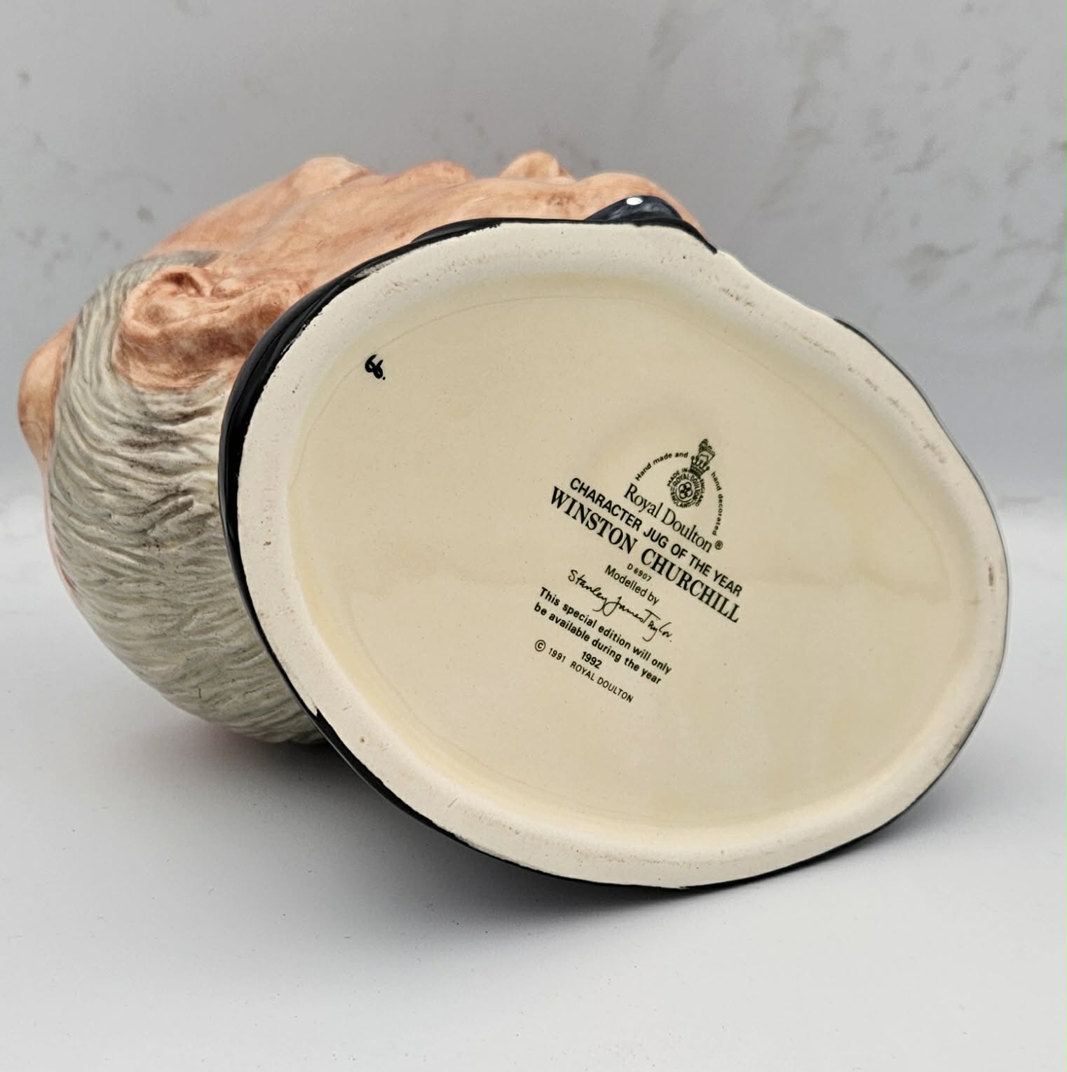 Sir Winston Churchill large character jug D6907 made in England by Royal Doulton. This jug is the limited edition character jug of the year only available in 1992.
