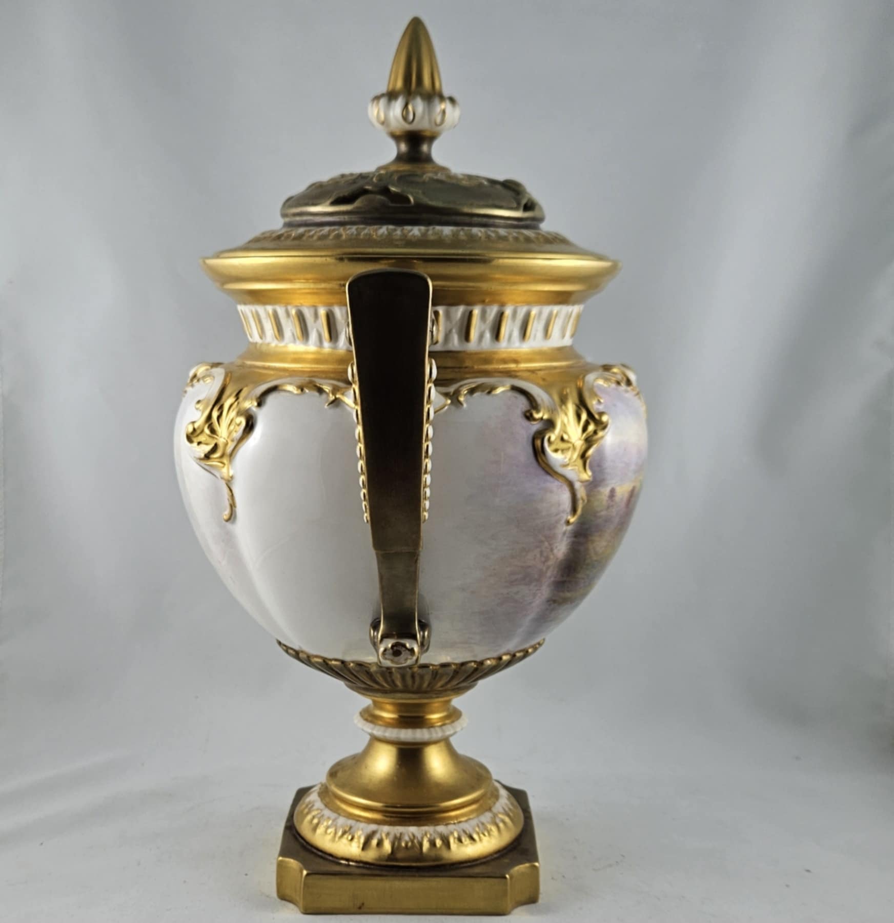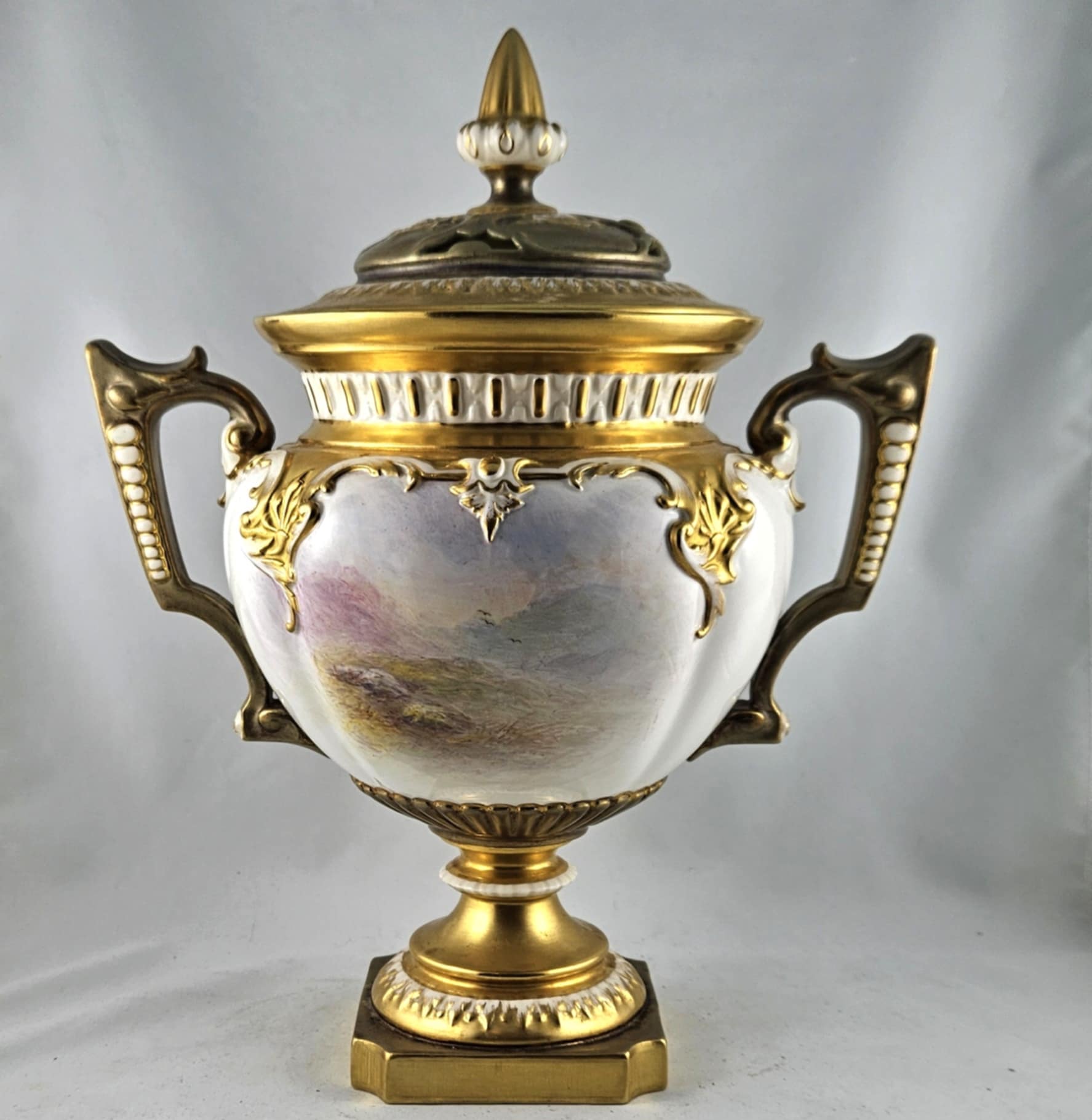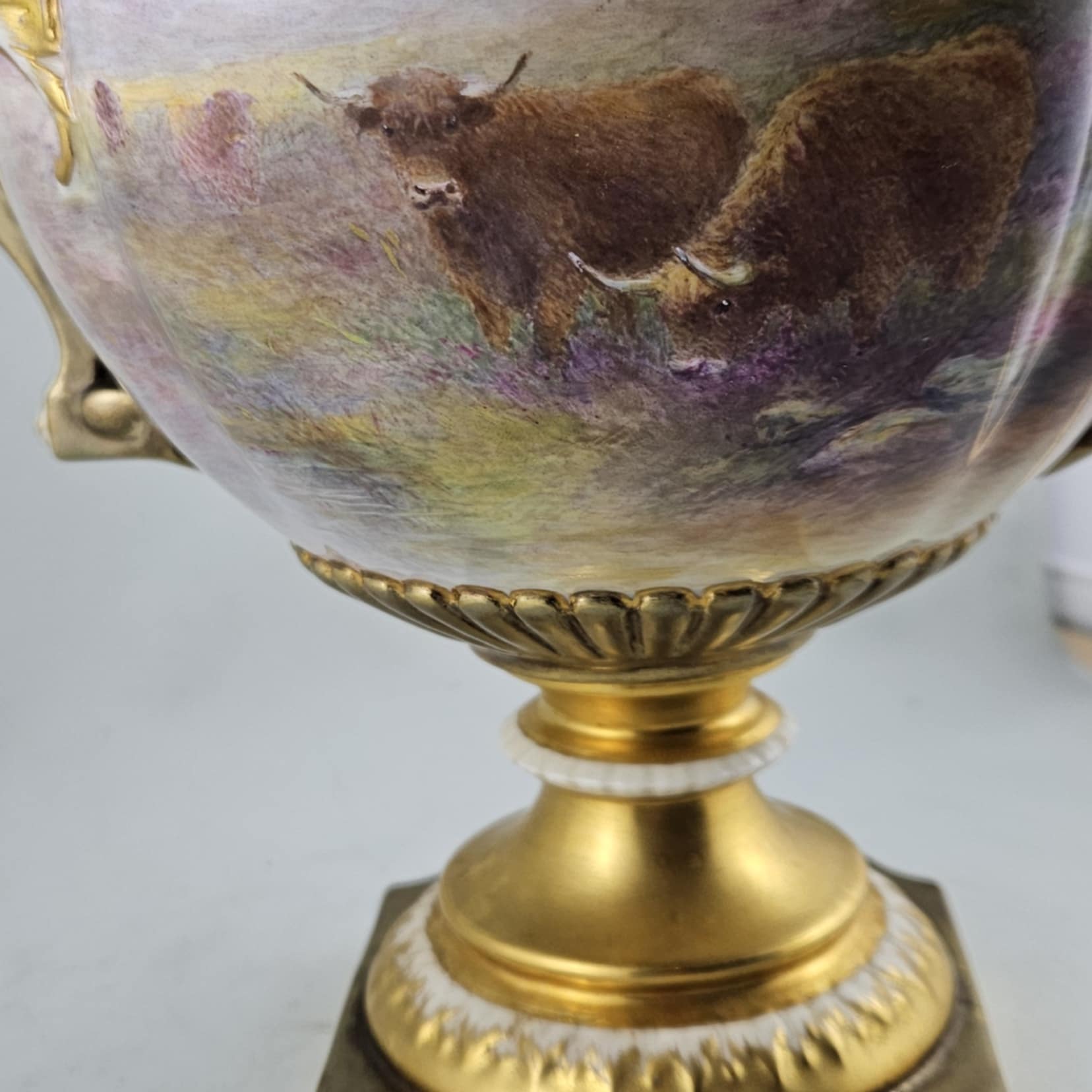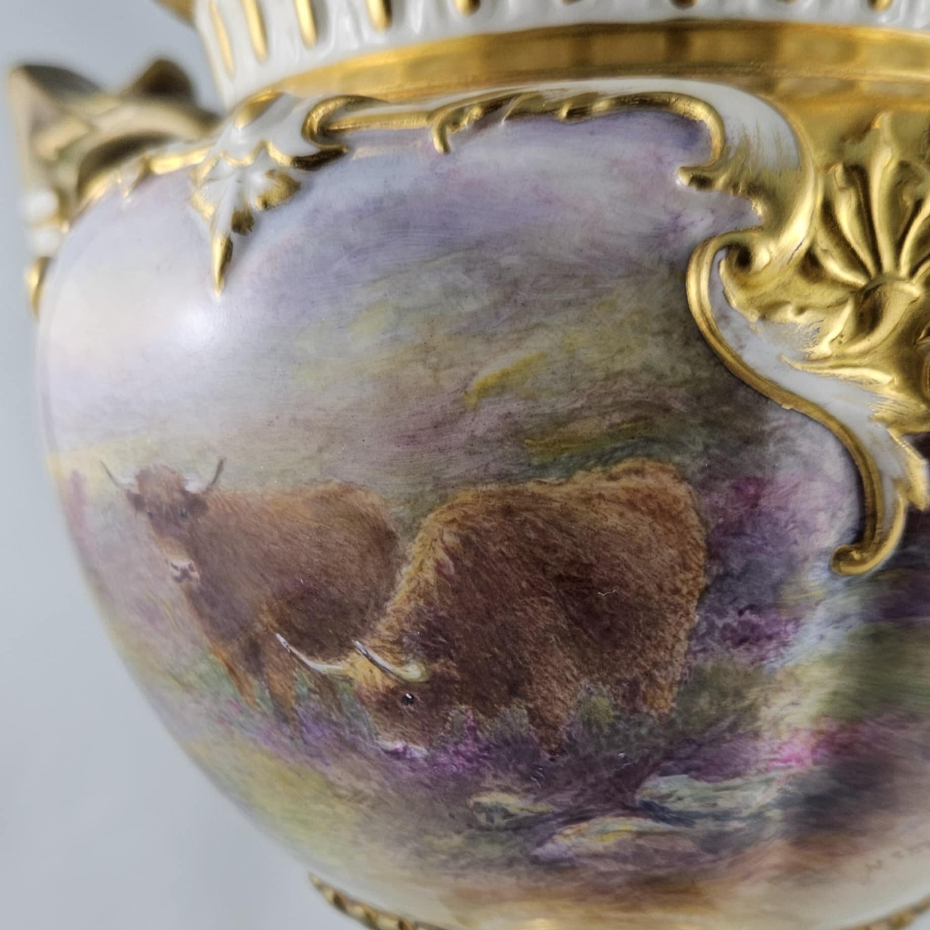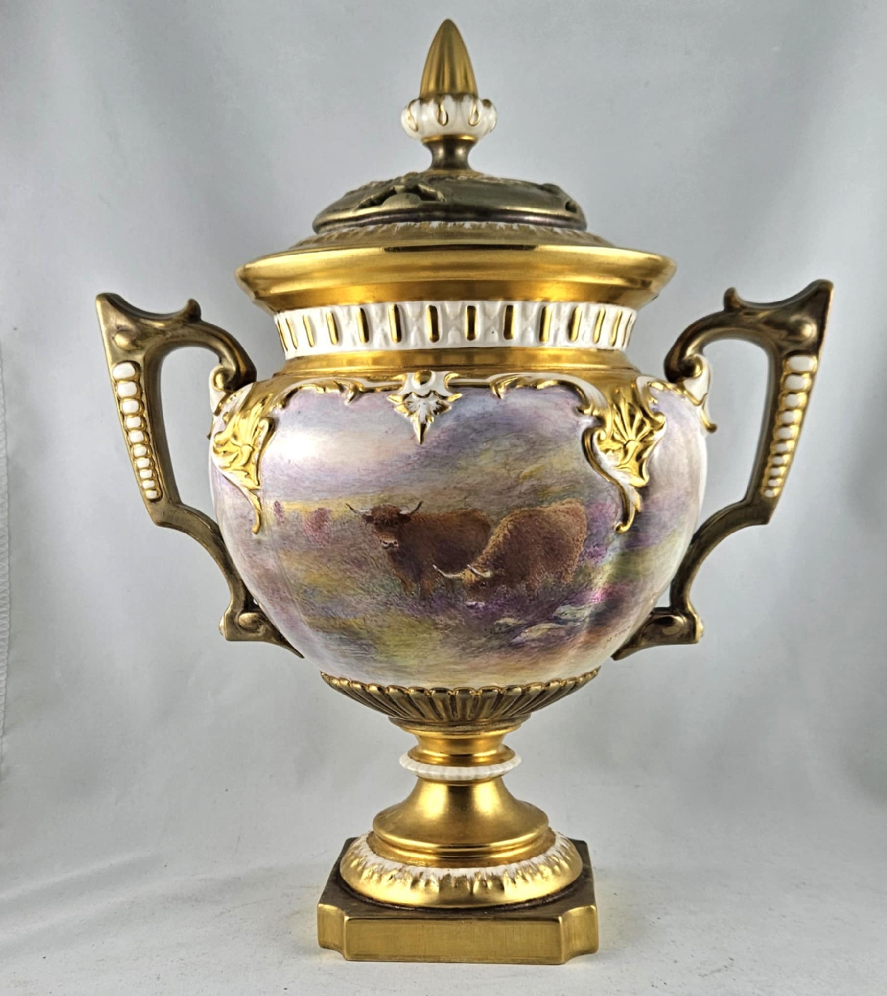 Royal Worcester hand painted highland cattle pot pourri lidded vase signed by Harry Stinton who painted at the Worcester factory from 1896 to 1963. The Stinton family are one the most well known Worcester artists who along with Harry, his father John and uncle James had over 150 years of history working with the business.