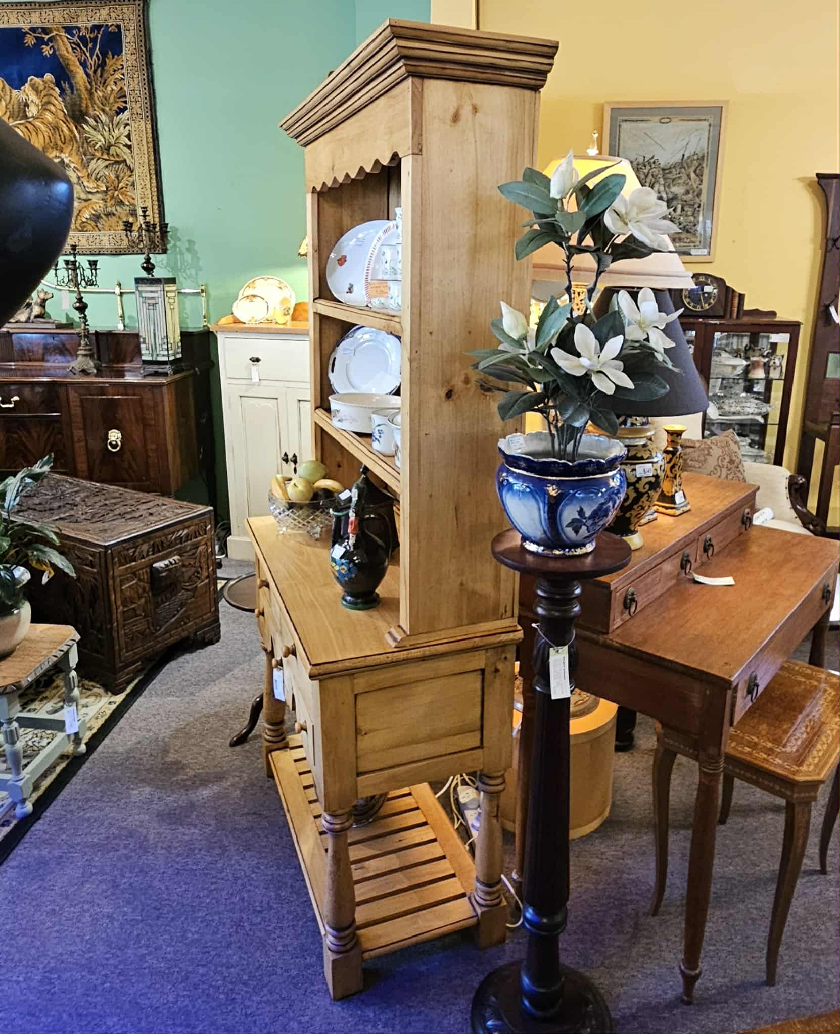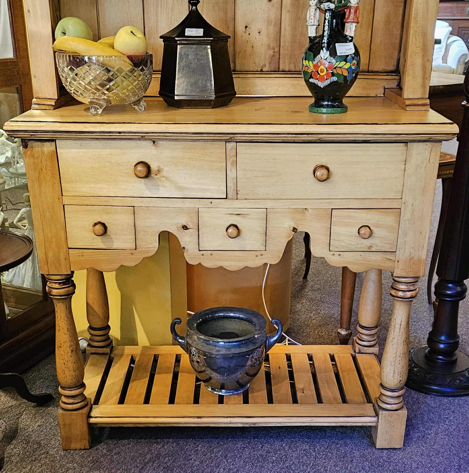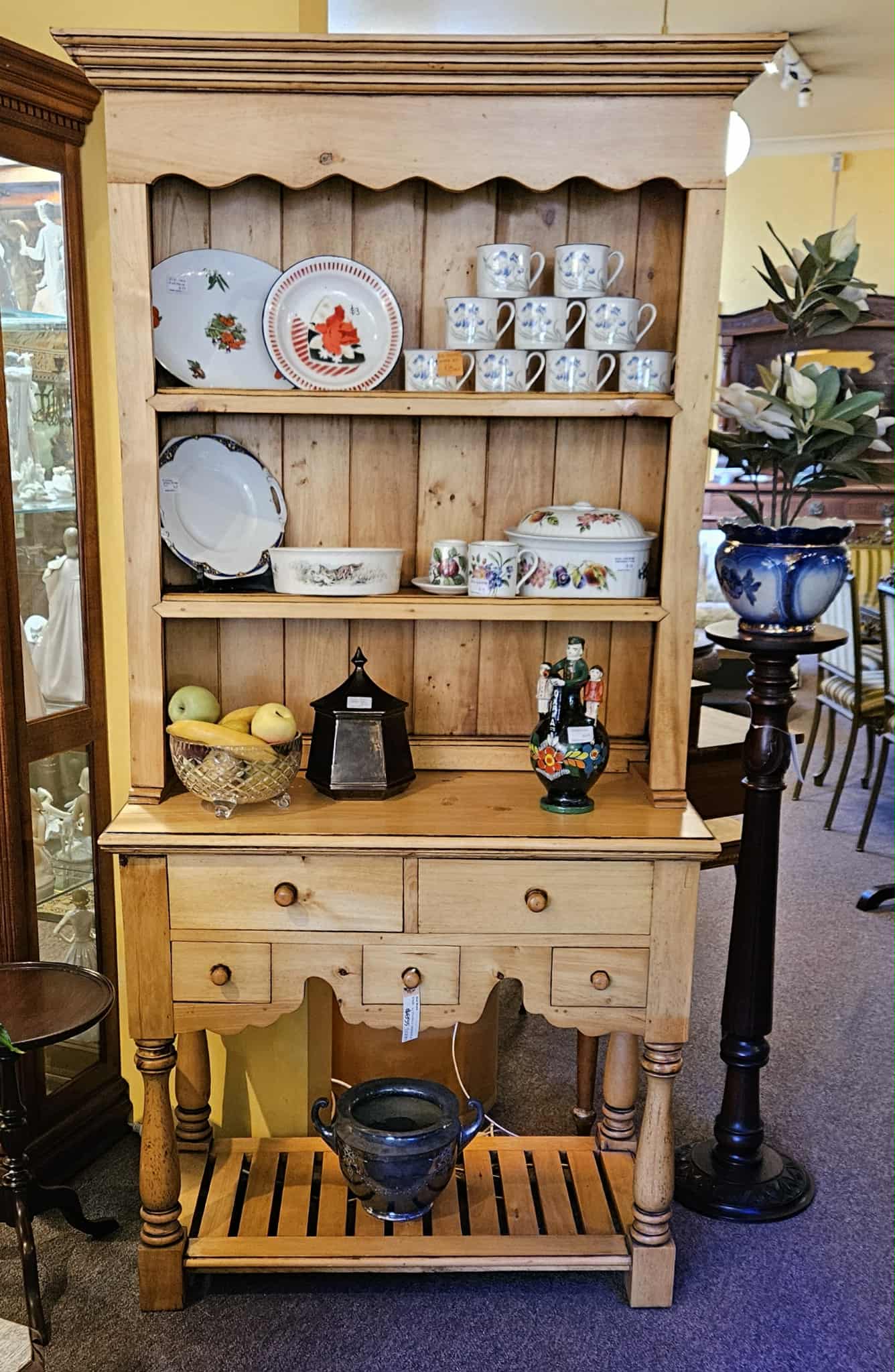 Open shelved Pine kitchen dresser of pleasing small proportions. Top shelves lift off for easy transport.