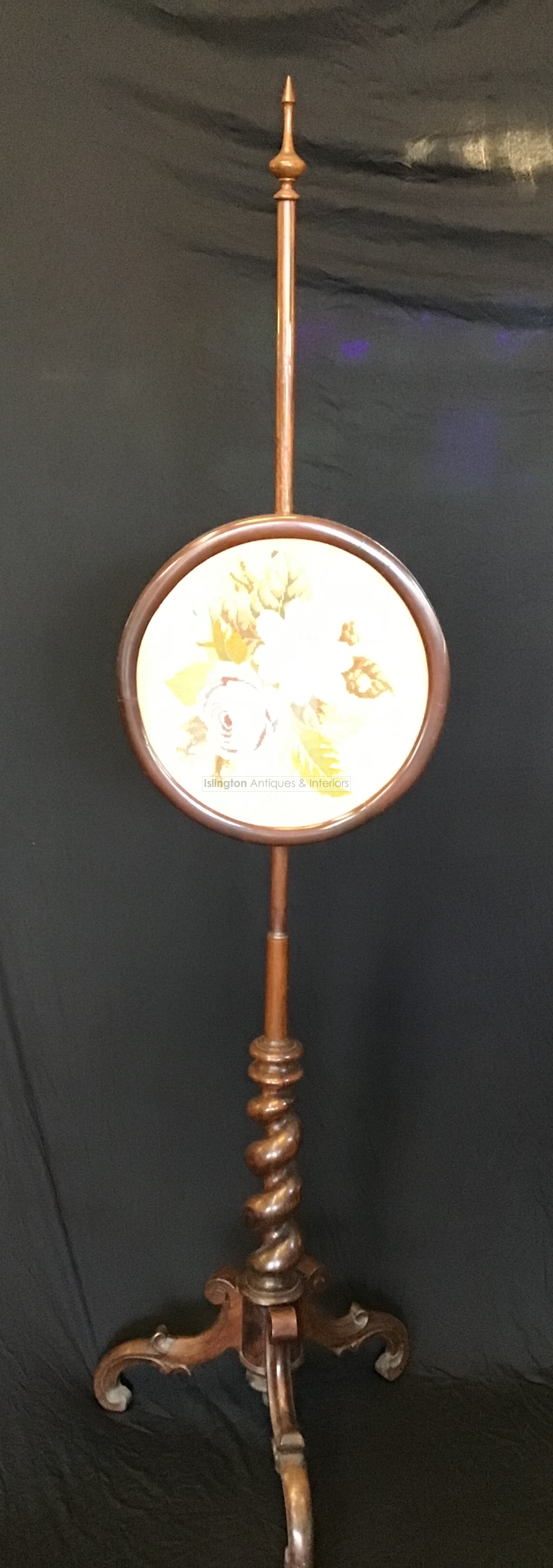 Victorian rosewood pole fire screen with barley twist base sitting on carved tripod legs. Height adjustable tapestry panel mounted on a vertical pole . Placed between a lit fire to enable ones face and skin to be protected from the heat of the fire . c.1880’s